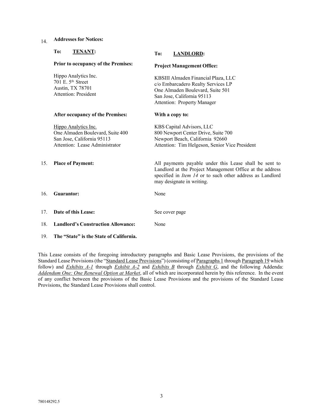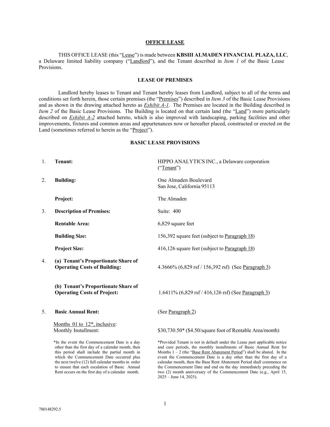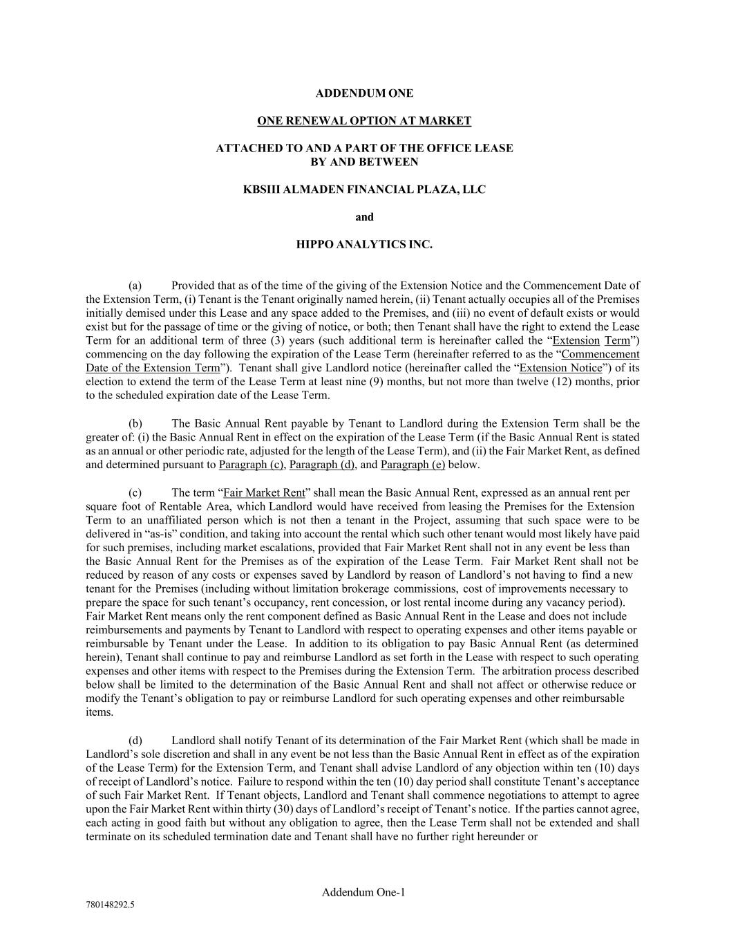 Addendum One-1 780148292.5 ADDENDUM ONE ONE RENEWAL OPTION AT MARKET ATTACHED TO AND A PART OF THE OFFICE LEASE BY AND BETWEEN KBSIII ALMADEN FINANCIAL PLAZA, LLC and HIPPO ANALYTICS INC. (a) Provided that as of the time of the giving of the Extension Notice and the Commencement Date of the Extension Term, (i) Tenant is the Tenant originally named herein, (ii) Tenant actually occupies all of the Premises initially demised under this Lease and any space added to the Premises, and (iii) no event of default exists or would exist but for the passage of time or the giving of notice, or both; then Tenant shall have the right to extend the Lease Term for an additional term of three (3) years (such additional term is hereinafter called the “Extension Term”) commencing on the day following the expiration of the Lease Term (hereinafter referred to as the “Commencement Date of the Extension Term”). Tenant shall give Landlord notice (hereinafter called the “Extension Notice”) of its election to extend the term of the Lease Term at least nine (9) months, but not more than twelve (12) months, prior to the scheduled expiration date of the Lease Term. (b) The Basic Annual Rent payable by Tenant to Landlord during the Extension Term shall be the greater of: (i) the Basic Annual Rent in effect on the expiration of the Lease Term (if the Basic Annual Rent is stated as an annual or other periodic rate, adjusted for the length of the Lease Term), and (ii) the Fair Market Rent, as defined and determined pursuant to Paragraph (c), Paragraph (d), and Paragraph (e) below. (c) The term “Fair Market Rent” shall mean the Basic Annual Rent, expressed as an annual rent per square foot of Rentable Area, which Landlord would have received from leasing the Premises for the Extension Term to an unaffiliated person which is not then a tenant in the Project, assuming that such space were to be delivered in “as-is” condition, and taking into account the rental which such other tenant would most likely have paid for such premises, including market escalations, provided that Fair Market Rent shall not in any event be less than the Basic Annual Rent for the Premises as of the expiration of the Lease Term. Fair Market Rent shall not be reduced by reason of any costs or expenses saved by Landlord by reason of Landlord’s not having to find a new tenant for the Premises (including without limitation brokerage commissions, cost of improvements necessary to prepare the space for such tenant’s occupancy, rent concession, or lost rental income during any vacancy period). Fair Market Rent means only the rent component defined as Basic Annual Rent in the Lease and does not include reimbursements and payments by Tenant to Landlord with respect to operating expenses and other items payable or reimbursable by Tenant under the Lease. In addition to its obligation to pay Basic Annual Rent (as determined herein), Tenant shall continue to pay and reimburse Landlord as set forth in the Lease with respect to such operating expenses and other items with respect to the Premises during the Extension Term. The arbitration process described below shall be limited to the determination of the Basic Annual Rent and shall not affect or otherwise reduce or modify the Tenant’s obligation to pay or reimburse Landlord for such operating expenses and other reimbursable items. (d) Landlord shall notify Tenant of its determination of the Fair Market Rent (which shall be made in Landlord’s sole discretion and shall in any event be not less than the Basic Annual Rent in effect as of the expiration of the Lease Term) for the Extension Term, and Tenant shall advise Landlord of any objection within ten (10) days of receipt of Landlord’s notice. Failure to respond within the ten (10) day period shall constitute Tenant’s acceptance of such Fair Market Rent. If Tenant objects, Landlord and Tenant shall commence negotiations to attempt to agree upon the Fair Market Rent within thirty (30) days of Landlord’s receipt of Tenant’s notice. If the parties cannot agree, each acting in good faith but without any obligation to agree, then the Lease Term shall not be extended and shall terminate on its scheduled termination date and Tenant shall have no further right hereunder or