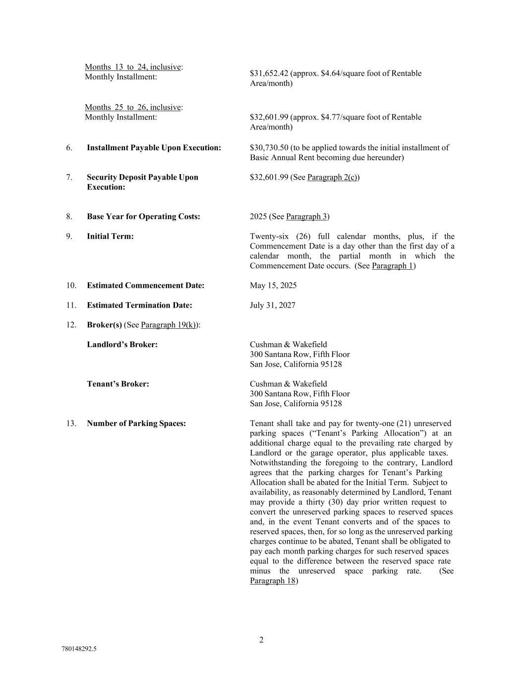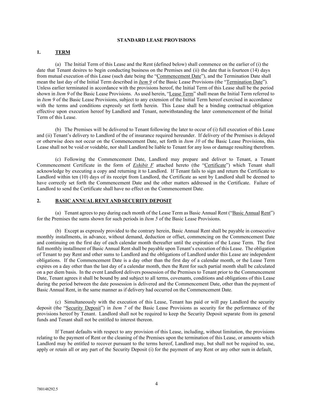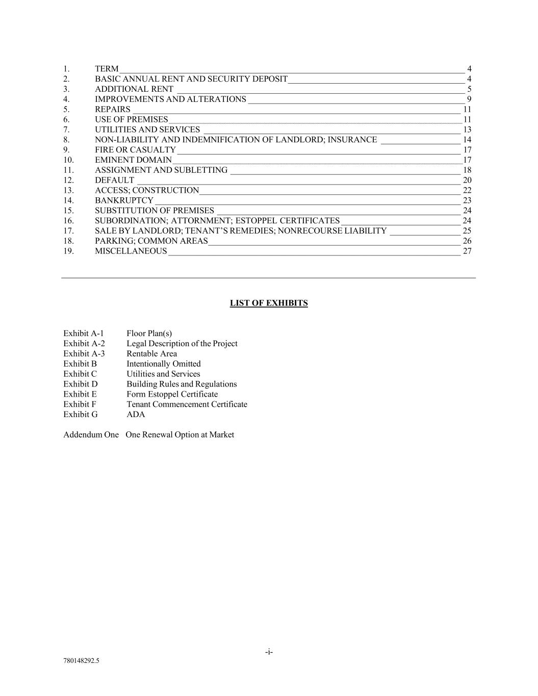 780148292.5 1. TERM ______________________________________________________________________________ 4 2. BASIC ANNUAL RENT AND SECURITY DEPOSIT ________________________________________ 4 3. ADDITIONAL RENT _________________________________________________________________ 5 4. IMPROVEMENTS AND ALTERATIONS _________________________________________________ 9 5. REPAIRS __________________________________________________________________________ 11 6. USE OF PREMISES 11 7. UTILITIES AND SERVICES __________________________________________________________ 13 8. NON-LIABILITY AND INDEMNIFICATION OF LANDLORD; INSURANCE __________________ 14 9. FIRE OR CASUALTY ________________________________________________________________ 17 10. EMINENT DOMAIN 17 11. ASSIGNMENT AND SUBLETTING ____________________________________________________ 18 12. DEFAULT _________________________________________________________________________ 20 13. ACCESS; CONSTRUCTION ___________________________________________________________ 22 14. BANKRUPTCY _____________________________________________________________________ 23 15. SUBSTITUTION OF PREMISES _______________________________________________________ 24 16. SUBORDINATION; ATTORNMENT; ESTOPPEL CERTIFICATES ___________________________ 24 17. SALE BY LANDLORD; TENANT’S REMEDIES; NONRECOURSE LIABILITY ________________ 25 18. PARKING; COMMON AREAS _________________________________________________________ 26 19. MISCELLANEOUS __________________________________________________________________ 27 LIST OF EXHIBITS Exhibit A-1 Floor Plan(s) Exhibit A-2 Legal Description of the Project Exhibit A-3 Rentable Area Exhibit B Intentionally Omitted Exhibit C Utilities and Services Exhibit D Building Rules and Regulations Exhibit E Form Estoppel Certificate Exhibit F Tenant Commencement Certificate Exhibit G ADA Addendum One One Renewal Option at Market -i-