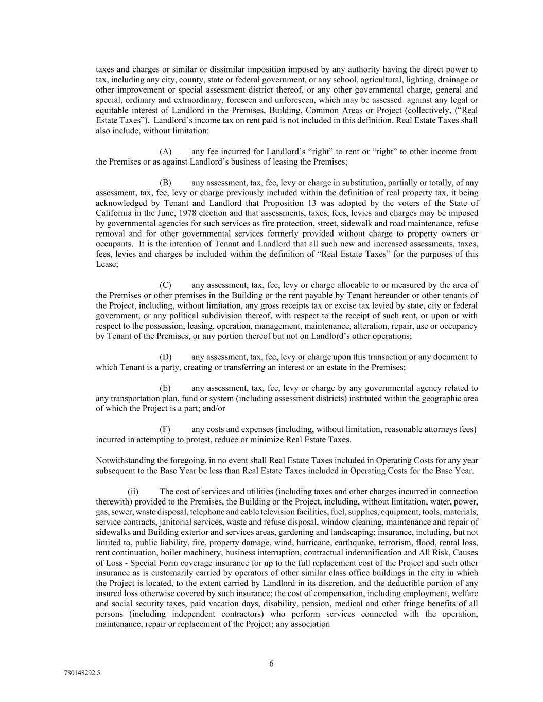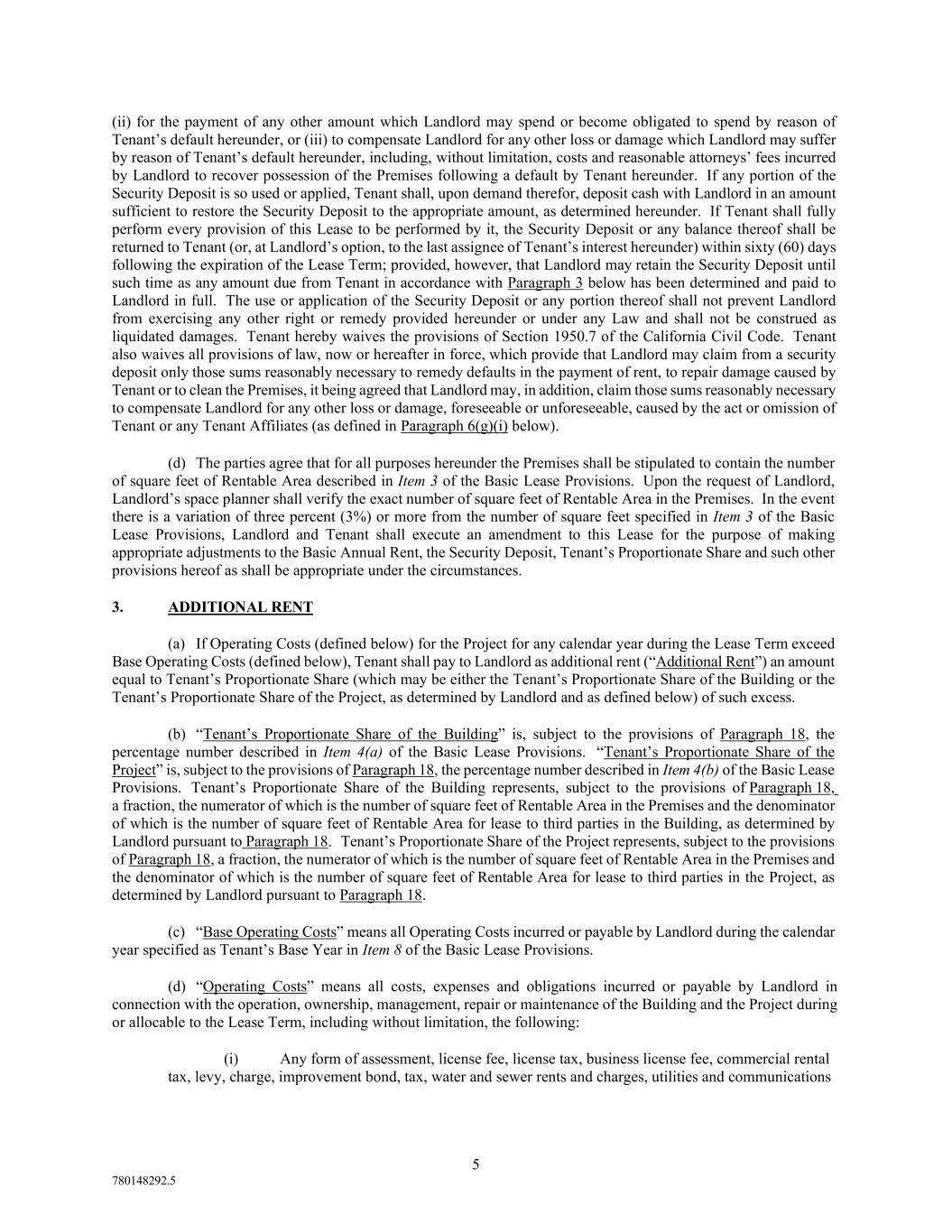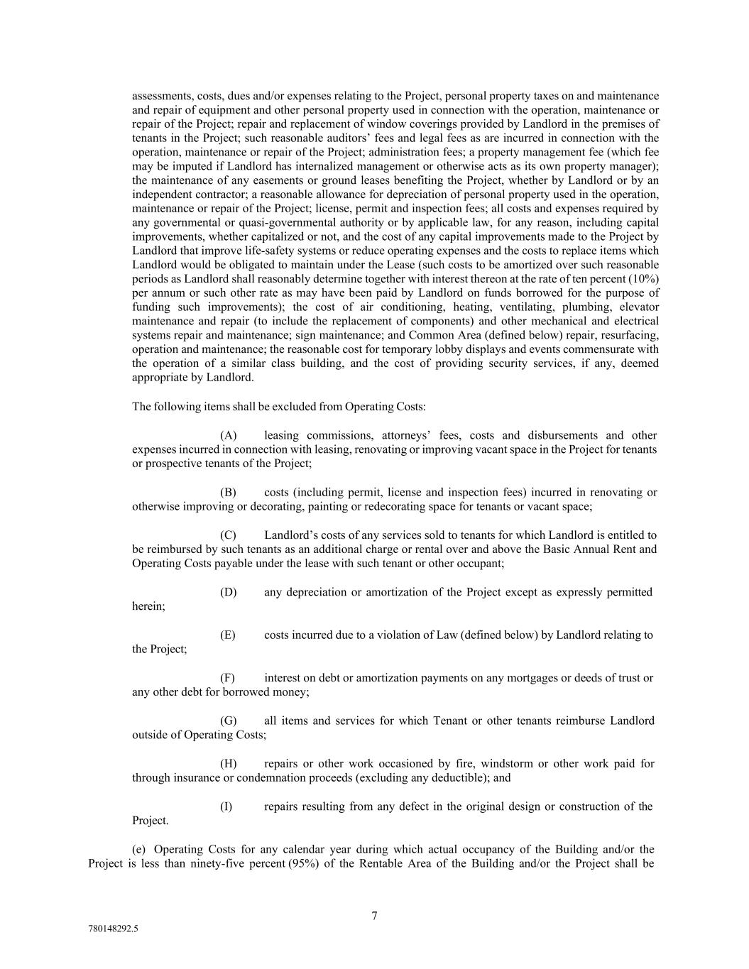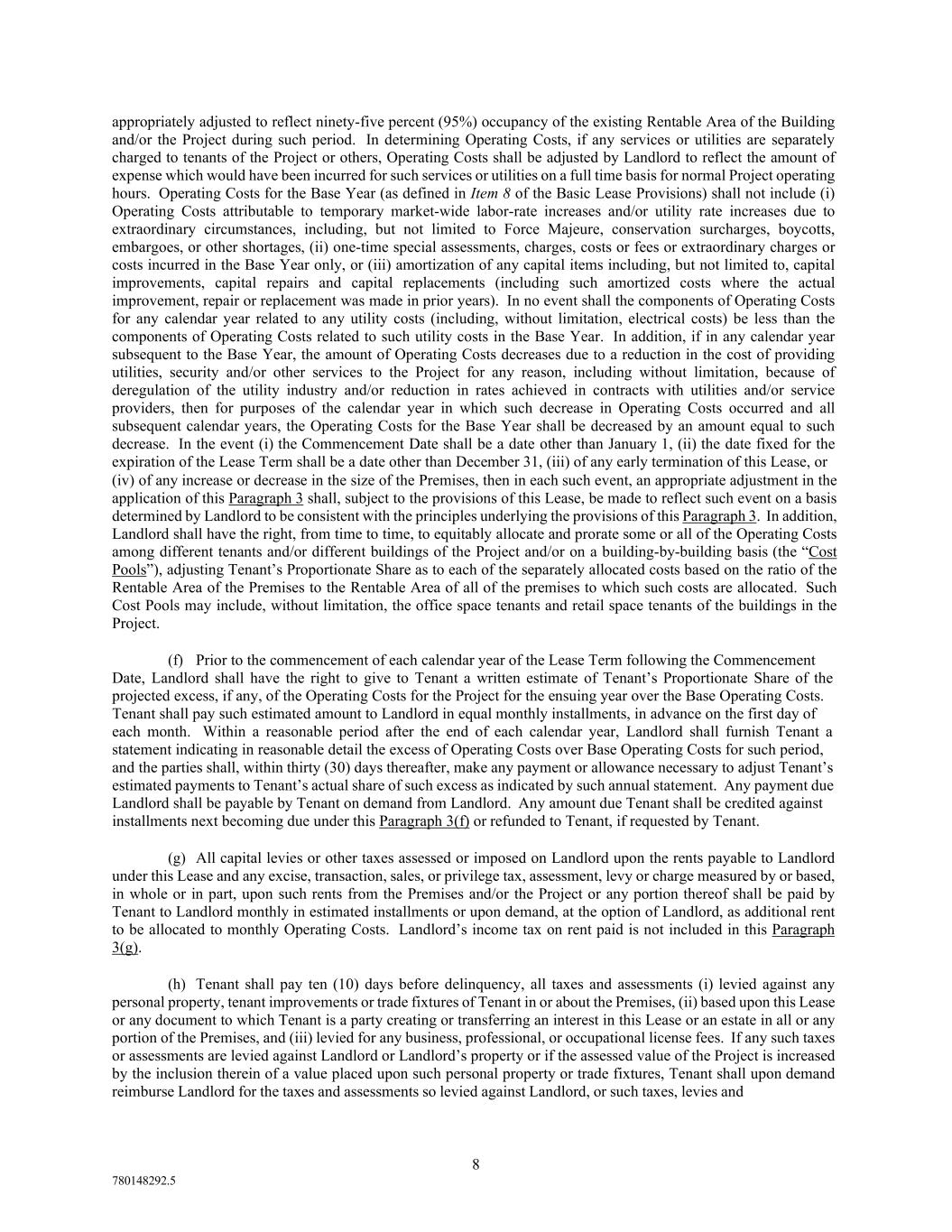 8 780148292.5 appropriately adjusted to reflect ninety-five percent (95%) occupancy of the existing Rentable Area of the Building and/or the Project during such period. In determining Operating Costs, if any services or utilities are separately charged to tenants of the Project or others, Operating Costs shall be adjusted by Landlord to reflect the amount of expense which would have been incurred for such services or utilities on a full time basis for normal Project operating hours. Operating Costs for the Base Year (as defined in Item 8 of the Basic Lease Provisions) shall not include (i) Operating Costs attributable to temporary market-wide labor-rate increases and/or utility rate increases due to extraordinary circumstances, including, but not limited to Force Majeure, conservation surcharges, boycotts, embargoes, or other shortages, (ii) one-time special assessments, charges, costs or fees or extraordinary charges or costs incurred in the Base Year only, or (iii) amortization of any capital items including, but not limited to, capital improvements, capital repairs and capital replacements (including such amortized costs where the actual improvement, repair or replacement was made in prior years). In no event shall the components of Operating Costs for any calendar year related to any utility costs (including, without limitation, electrical costs) be less than the components of Operating Costs related to such utility costs in the Base Year. In addition, if in any calendar year subsequent to the Base Year, the amount of Operating Costs decreases due to a reduction in the cost of providing utilities, security and/or other services to the Project for any reason, including without limitation, because of deregulation of the utility industry and/or reduction in rates achieved in contracts with utilities and/or service providers, then for purposes of the calendar year in which such decrease in Operating Costs occurred and all subsequent calendar years, the Operating Costs for the Base Year shall be decreased by an amount equal to such decrease. In the event (i) the Commencement Date shall be a date other than January 1, (ii) the date fixed for the expiration of the Lease Term shall be a date other than December 31, (iii) of any early termination of this Lease, or (iv) of any increase or decrease in the size of the Premises, then in each such event, an appropriate adjustment in the application of this Paragraph 3 shall, subject to the provisions of this Lease, be made to reflect such event on a basis determined by Landlord to be consistent with the principles underlying the provisions of this Paragraph 3. In addition, Landlord shall have the right, from time to time, to equitably allocate and prorate some or all of the Operating Costs among different tenants and/or different buildings of the Project and/or on a building-by-building basis (the “Cost Pools”), adjusting Tenant’s Proportionate Share as to each of the separately allocated costs based on the ratio of the Rentable Area of the Premises to the Rentable Area of all of the premises to which such costs are allocated. Such Cost Pools may include, without limitation, the office space tenants and retail space tenants of the buildings in the Project. (f) Prior to the commencement of each calendar year of the Lease Term following the Commencement Date, Landlord shall have the right to give to Tenant a written estimate of Tenant’s Proportionate Share of the projected excess, if any, of the Operating Costs for the Project for the ensuing year over the Base Operating Costs. Tenant shall pay such estimated amount to Landlord in equal monthly installments, in advance on the first day of each month. Within a reasonable period after the end of each calendar year, Landlord shall furnish Tenant a statement indicating in reasonable detail the excess of Operating Costs over Base Operating Costs for such period, and the parties shall, within thirty (30) days thereafter, make any payment or allowance necessary to adjust Tenant’s estimated payments to Tenant’s actual share of such excess as indicated by such annual statement. Any payment due Landlord shall be payable by Tenant on demand from Landlord. Any amount due Tenant shall be credited against installments next becoming due under this Paragraph 3(f) or refunded to Tenant, if requested by Tenant. (g) All capital levies or other taxes assessed or imposed on Landlord upon the rents payable to Landlord under this Lease and any excise, transaction, sales, or privilege tax, assessment, levy or charge measured by or based, in whole or in part, upon such rents from the Premises and/or the Project or any portion thereof shall be paid by Tenant to Landlord monthly in estimated installments or upon demand, at the option of Landlord, as additional rent to be allocated to monthly Operating Costs. Landlord’s income tax on rent paid is not included in this Paragraph 3(g). (h) Tenant shall pay ten (10) days before delinquency, all taxes and assessments (i) levied against any personal property, tenant improvements or trade fixtures of Tenant in or about the Premises, (ii) based upon this Lease or any document to which Tenant is a party creating or transferring an interest in this Lease or an estate in all or any portion of the Premises, and (iii) levied for any business, professional, or occupational license fees. If any such taxes or assessments are levied against Landlord or Landlord’s property or if the assessed value of the Project is increased by the inclusion therein of a value placed upon such personal property or trade fixtures, Tenant shall upon demand reimburse Landlord for the taxes and assessments so levied against Landlord, or such taxes, levies and
