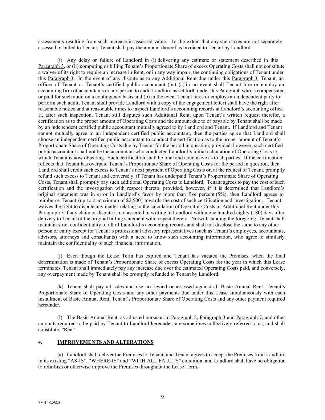 9 780148292.5 assessments resulting from such increase in assessed value. To the extent that any such taxes are not separately assessed or billed to Tenant, Tenant shall pay the amount thereof as invoiced to Tenant by Landlord. (i) Any delay or failure of Landlord in (i) delivering any estimate or statement described in this Paragraph 3, or (ii) computing or billing Tenant’s Proportionate Share of excess Operating Costs shall not constitute a waiver of its right to require an increase in Rent, or in any way impair, the continuing obligations of Tenant under this Paragraph 3. In the event of any dispute as to any Additional Rent due under this Paragraph 3, Tenant, an officer of Tenant or Tenant’s certified public accountant (but (a) in no event shall Tenant hire or employ an accounting firm of accountants or any person to audit Landlord as set forth under this Paragraph who is compensated or paid for such audit on a contingency basis and (b) in the event Tenant hires or employs an independent party to perform such audit, Tenant shall provide Landlord with a copy of the engagement letter) shall have the right after reasonable notice and at reasonable times to inspect Landlord’s accounting records at Landlord’s accounting office. If, after such inspection, Tenant still disputes such Additional Rent, upon Tenant’s written request therefor, a certification as to the proper amount of Operating Costs and the amount due to or payable by Tenant shall be made by an independent certified public accountant mutually agreed to by Landlord and Tenant. If Landlord and Tenant cannot mutually agree to an independent certified public accountant, then the parties agree that Landlord shall choose an independent certified public accountant to conduct the certification as to the proper amount of Tenant’s Proportionate Share of Operating Costs due by Tenant for the period in question; provided, however, such certified public accountant shall not be the accountant who conducted Landlord’s initial calculation of Operating Costs to which Tenant is now objecting. Such certification shall be final and conclusive as to all parties. If the certification reflects that Tenant has overpaid Tenant’s Proportionate Share of Operating Costs for the period in question, then Landlord shall credit such excess to Tenant’s next payment of Operating Costs or, at the request of Tenant, promptly refund such excess to Tenant and conversely, if Tenant has underpaid Tenant’s Proportionate Share of Operating Costs, Tenant shall promptly pay such additional Operating Costs to Landlord. Tenant agrees to pay the cost of such certification and the investigation with respect thereto; provided, however, if it is determined that Landlord’s original statement was in error in Landlord’s favor by more than five percent (5%), then Landlord agrees to reimburse Tenant (up to a maximum of $2,500) towards the cost of such certification and investigation. Tenant waives the right to dispute any matter relating to the calculation of Operating Costs or Additional Rent under this Paragraph 3 if any claim or dispute is not asserted in writing to Landlord within one hundred eighty (180) days after delivery to Tenant of the original billing statement with respect thereto. Notwithstanding the foregoing, Tenant shall maintain strict confidentiality of all of Landlord’s accounting records and shall not disclose the same to any other person or entity except for Tenant’s professional advisory representatives (such as Tenant’s employees, accountants, advisors, attorneys and consultants) with a need to know such accounting information, who agree to similarly maintain the confidentiality of such financial information. (j) Even though the Lease Term has expired and Tenant has vacated the Premises, when the final determination is made of Tenant’s Proportionate Share of excess Operating Costs for the year in which this Lease terminates, Tenant shall immediately pay any increase due over the estimated Operating Costs paid, and conversely, any overpayment made by Tenant shall be promptly refunded to Tenant by Landlord. (k) Tenant shall pay all sales and use tax levied or assessed against all Basic Annual Rent, Tenant’s Proportionate Share of Operating Costs and any other payments due under this Lease simultaneously with each installment of Basic Annual Rent, Tenant’s Proportionate Share of Operating Costs and any other payment required hereunder. (l) The Basic Annual Rent, as adjusted pursuant to Paragraph 2, Paragraph 3 and Paragraph 7, and other amounts required to be paid by Tenant to Landlord hereunder, are sometimes collectively referred to as, and shall constitute, “Rent”. 4. IMPROVEMENTS AND ALTERATIONS (a) Landlord shall deliver the Premises to Tenant, and Tenant agrees to accept the Premises from Landlord in its existing “AS-IS”, “WHERE-IS” and “WITH ALL FAULTS” condition, and Landlord shall have no obligation to refurbish or otherwise improve the Premises throughout the Lease Term.