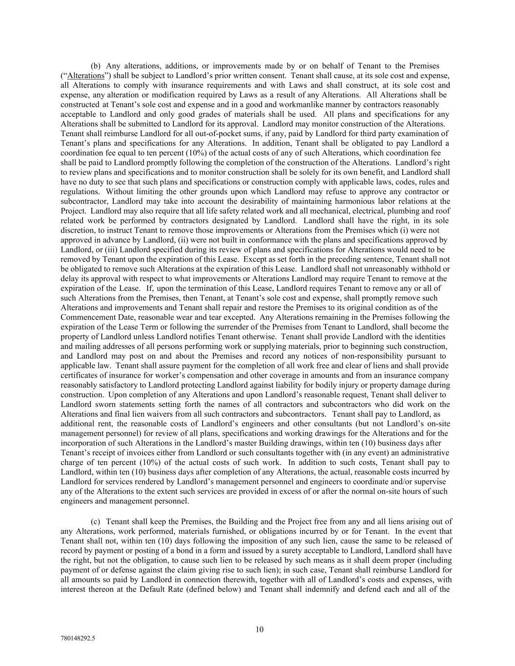 10 780148292.5 (b) Any alterations, additions, or improvements made by or on behalf of Tenant to the Premises (“Alterations”) shall be subject to Landlord’s prior written consent. Tenant shall cause, at its sole cost and expense, all Alterations to comply with insurance requirements and with Laws and shall construct, at its sole cost and expense, any alteration or modification required by Laws as a result of any Alterations. All Alterations shall be constructed at Tenant’s sole cost and expense and in a good and workmanlike manner by contractors reasonably acceptable to Landlord and only good grades of materials shall be used. All plans and specifications for any Alterations shall be submitted to Landlord for its approval. Landlord may monitor construction of the Alterations. Tenant shall reimburse Landlord for all out-of-pocket sums, if any, paid by Landlord for third party examination of Tenant’s plans and specifications for any Alterations. In addition, Tenant shall be obligated to pay Landlord a coordination fee equal to ten percent (10%) of the actual costs of any of such Alterations, which coordination fee shall be paid to Landlord promptly following the completion of the construction of the Alterations. Landlord’s right to review plans and specifications and to monitor construction shall be solely for its own benefit, and Landlord shall have no duty to see that such plans and specifications or construction comply with applicable laws, codes, rules and regulations. Without limiting the other grounds upon which Landlord may refuse to approve any contractor or subcontractor, Landlord may take into account the desirability of maintaining harmonious labor relations at the Project. Landlord may also require that all life safety related work and all mechanical, electrical, plumbing and roof related work be performed by contractors designated by Landlord. Landlord shall have the right, in its sole discretion, to instruct Tenant to remove those improvements or Alterations from the Premises which (i) were not approved in advance by Landlord, (ii) were not built in conformance with the plans and specifications approved by Landlord, or (iii) Landlord specified during its review of plans and specifications for Alterations would need to be removed by Tenant upon the expiration of this Lease. Except as set forth in the preceding sentence, Tenant shall not be obligated to remove such Alterations at the expiration of this Lease. Landlord shall not unreasonably withhold or delay its approval with respect to what improvements or Alterations Landlord may require Tenant to remove at the expiration of the Lease. If, upon the termination of this Lease, Landlord requires Tenant to remove any or all of such Alterations from the Premises, then Tenant, at Tenant’s sole cost and expense, shall promptly remove such Alterations and improvements and Tenant shall repair and restore the Premises to its original condition as of the Commencement Date, reasonable wear and tear excepted. Any Alterations remaining in the Premises following the expiration of the Lease Term or following the surrender of the Premises from Tenant to Landlord, shall become the property of Landlord unless Landlord notifies Tenant otherwise. Tenant shall provide Landlord with the identities and mailing addresses of all persons performing work or supplying materials, prior to beginning such construction, and Landlord may post on and about the Premises and record any notices of non-responsibility pursuant to applicable law. Tenant shall assure payment for the completion of all work free and clear of liens and shall provide certificates of insurance for worker’s compensation and other coverage in amounts and from an insurance company reasonably satisfactory to Landlord protecting Landlord against liability for bodily injury or property damage during construction. Upon completion of any Alterations and upon Landlord’s reasonable request, Tenant shall deliver to Landlord sworn statements setting forth the names of all contractors and subcontractors who did work on the Alterations and final lien waivers from all such contractors and subcontractors. Tenant shall pay to Landlord, as additional rent, the reasonable costs of Landlord’s engineers and other consultants (but not Landlord’s on-site management personnel) for review of all plans, specifications and working drawings for the Alterations and for the incorporation of such Alterations in the Landlord’s master Building drawings, within ten (10) business days after Tenant’s receipt of invoices either from Landlord or such consultants together with (in any event) an administrative charge of ten percent (10%) of the actual costs of such work. In addition to such costs, Tenant shall pay to Landlord, within ten (10) business days after completion of any Alterations, the actual, reasonable costs incurred by Landlord for services rendered by Landlord’s management personnel and engineers to coordinate and/or supervise any of the Alterations to the extent such services are provided in excess of or after the normal on-site hours of such engineers and management personnel. (c) Tenant shall keep the Premises, the Building and the Project free from any and all liens arising out of any Alterations, work performed, materials furnished, or obligations incurred by or for Tenant. In the event that Tenant shall not, within ten (10) days following the imposition of any such lien, cause the same to be released of record by payment or posting of a bond in a form and issued by a surety acceptable to Landlord, Landlord shall have the right, but not the obligation, to cause such lien to be released by such means as it shall deem proper (including payment of or defense against the claim giving rise to such lien); in such case, Tenant shall reimburse Landlord for all amounts so paid by Landlord in connection therewith, together with all of Landlord’s costs and expenses, with interest thereon a