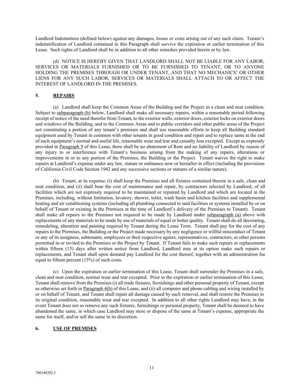 11 780148292.5 Landlord Indemnitees (defined below) against any damages, losses or costs arising out of any such claim. Tenant’s indemnification of Landlord contained in this Paragraph shall survive the expiration or earlier termination of this Lease. Such rights of Landlord shall be in addition to all other remedies provided herein or by law. (d) NOTICE IS HEREBY GIVEN THAT LANDLORD SHALL NOT BE LIABLE FOR ANY LABOR, SERVICES OR MATERIALS FURNISHED OR TO BE FURNISHED TO TENANT, OR TO ANYONE HOLDING THE PREMISES THROUGH OR UNDER TENANT, AND THAT NO MECHANICS’ OR OTHER LIENS FOR ANY SUCH LABOR, SERVICES OR MATERIALS SHALL ATTACH TO OR AFFECT THE INTEREST OF LANDLORD IN THE PREMISES. 5. REPAIRS (a) Landlord shall keep the Common Areas of the Building and the Project in a clean and neat condition. Subject to subparagraph (b) below, Landlord shall make all necessary repairs, within a reasonable period following receipt of notice of the need therefor from Tenant, to the exterior walls, exterior doors, exterior locks on exterior doors and windows of the Building, and to the Common Areas and to public corridors and other public areas of the Project not constituting a portion of any tenant’s premises and shall use reasonable efforts to keep all Building standard equipment used by Tenant in common with other tenants in good condition and repair and to replace same at the end of such equipment’s normal and useful life, reasonable wear and tear and casualty loss excepted. Except as expressly provided in Paragraph 9 of this Lease, there shall be no abatement of Rent and no liability of Landlord by reason of any injury to or interference with Tenant’s business arising from the making of any repairs, alterations or improvements in or to any portion of the Premises, the Building or the Project. Tenant waives the right to make repairs at Landlord’s expense under any law, statute or ordinance now or hereafter in effect (including the provisions of California Civil Code Section 1942 and any successive sections or statutes of a similar nature). (b) Tenant, at its expense, (i) shall keep the Premises and all fixtures contained therein in a safe, clean and neat condition, and (ii) shall bear the cost of maintenance and repair, by contractors selected by Landlord, of all facilities which are not expressly required to be maintained or repaired by Landlord and which are located in the Premises, including, without limitation, lavatory, shower, toilet, wash basin and kitchen facilities and supplemental heating and air conditioning systems (including all plumbing connected to said facilities or systems installed by or on behalf of Tenant or existing in the Premises at the time of Landlord’s delivery of the Premises to Tenant). Tenant shall make all repairs to the Premises not required to be made by Landlord under subparagraph (a) above with replacements of any materials to be made by use of materials of equal or better quality. Tenant shall do all decorating, remodeling, alteration and painting required by Tenant during the Lease Term. Tenant shall pay for the cost of any repairs to the Premises, the Building or the Project made necessary by any negligence or willful misconduct of Tenant or any of its assignees, subtenants, employees or their respective agents, representatives, contractors, or other persons permitted in or invited to the Premises or the Project by Tenant. If Tenant fails to make such repairs or replacements within fifteen (15) days after written notice from Landlord, Landlord may at its option make such repairs or replacements, and Tenant shall upon demand pay Landlord for the cost thereof, together with an administration fee equal to fifteen percent (15%) of such costs. (c) Upon the expiration or earlier termination of this Lease, Tenant shall surrender the Premises in a safe, clean and neat condition, normal wear and tear excepted. Prior to the expiration or earlier termination of this Lease, Tenant shall remove from the Premises (i) all trade fixtures, furnishings and other personal property of Tenant, except as otherwise set forth in Paragraph 4(b) of this Lease, and (ii) all computer and phone cabling and wiring installed by or on behalf of Tenant, and Tenant shall repair all damage caused by such removal, and shall restore the Premises to its original condition, reasonable wear and tear excepted. In addition to all other rights Landlord may have, in the event Tenant does not so remove any such fixtures, furnishings or personal property, Tenant shall be deemed to have abandoned the same, in which case Landlord may store or dispose of the same at Tenant’s expense, appropriate the same for itself, and/or sell the same in its discretion. 6. USE OF PREMISES