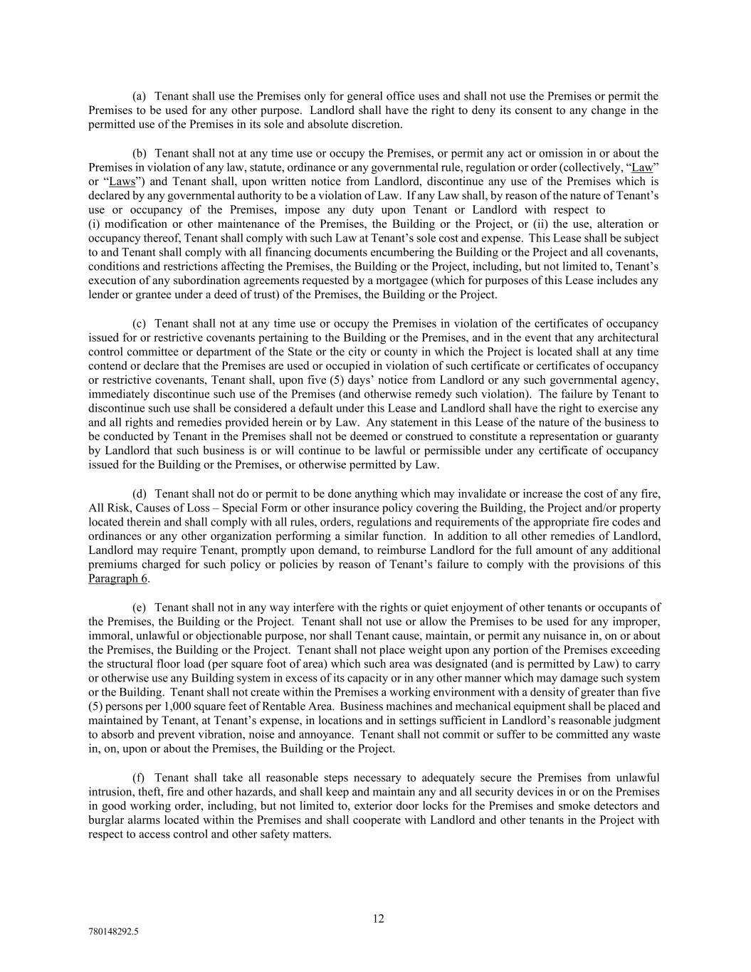 12 780148292.5 (a) Tenant shall use the Premises only for general office uses and shall not use the Premises or permit the Premises to be used for any other purpose. Landlord shall have the right to deny its consent to any change in the permitted use of the Premises in its sole and absolute discretion. (b) Tenant shall not at any time use or occupy the Premises, or permit any act or omission in or about the Premises in violation of any law, statute, ordinance or any governmental rule, regulation or order (collectively, “Law” or “Laws”) and Tenant shall, upon written notice from Landlord, discontinue any use of the Premises which is declared by any governmental authority to be a violation of Law. If any Law shall, by reason of the nature of Tenant’s use or occupancy of the Premises, impose any duty upon Tenant or Landlord with respect to (i) modification or other maintenance of the Premises, the Building or the Project, or (ii) the use, alteration or occupancy thereof, Tenant shall comply with such Law at Tenant’s sole cost and expense. This Lease shall be subject to and Tenant shall comply with all financing documents encumbering the Building or the Project and all covenants, conditions and restrictions affecting the Premises, the Building or the Project, including, but not limited to, Tenant’s execution of any subordination agreements requested by a mortgagee (which for purposes of this Lease includes any lender or grantee under a deed of trust) of the Premises, the Building or the Project. (c) Tenant shall not at any time use or occupy the Premises in violation of the certificates of occupancy issued for or restrictive covenants pertaining to the Building or the Premises, and in the event that any architectural control committee or department of the State or the city or county in which the Project is located shall at any time contend or declare that the Premises are used or occupied in violation of such certificate or certificates of occupancy or restrictive covenants, Tenant shall, upon five (5) days’ notice from Landlord or any such governmental agency, immediately discontinue such use of the Premises (and otherwise remedy such violation). The failure by Tenant to discontinue such use shall be considered a default under this Lease and Landlord shall have the right to exercise any and all rights and remedies provided herein or by Law. Any statement in this Lease of the nature of the business to be conducted by Tenant in the Premises shall not be deemed or construed to constitute a representation or guaranty by Landlord that such business is or will continue to be lawful or permissible under any certificate of occupancy issued for the Building or the Premises, or otherwise permitted by Law. (d) Tenant shall not do or permit to be done anything which may invalidate or increase the cost of any fire, All Risk, Causes of Loss – Special Form or other insurance policy covering the Building, the Project and/or property located therein and shall comply with all rules, orders, regulations and requirements of the appropriate fire codes and ordinances or any other organization performing a similar function. In addition to all other remedies of Landlord, Landlord may require Tenant, promptly upon demand, to reimburse Landlord for the full amount of any additional premiums charged for such policy or policies by reason of Tenant’s failure to comply with the provisions of this Paragraph 6. (e) Tenant shall not in any way interfere with the rights or quiet enjoyment of other tenants or occupants of the Premises, the Building or the Project. Tenant shall not use or allow the Premises to be used for any improper, immoral, unlawful or objectionable purpose, nor shall Tenant cause, maintain, or permit any nuisance in, on or about the Premises, the Building or the Project. Tenant shall not place weight upon any portion of the Premises exceeding the structural floor load (per square foot of area) which such area was designated (and is permitted by Law) to carry or otherwise use any Building system in excess of its capacity or in any other manner which may damage such system or the Building. Tenant shall not create within the Premises a working environment with a density of greater than five (5) persons per 1,000 square feet of Rentable Area. Business machines and mechanical equipment shall be placed and maintained by Tenant, at Tenant’s expense, in locations and in settings sufficient in Landlord’s reasonable judgment to absorb and prevent vibration, noise and annoyance. Tenant shall not commit or suffer to be committed any waste in, on, upon or about the Premises, the Building or the Project. (f) Tenant shall take all reasonable steps necessary to adequately secure the Premises from unlawful intrusion, theft, fire and other hazards, and shall keep and maintain any and all security devices in or on the Premises in good working order, including, but not limited to, exterior door locks for the Premises and smoke detectors and burglar alarms located within the Premises and shall cooperate with Landlord and other tenants in the Project with respect to access control and other safety matters.