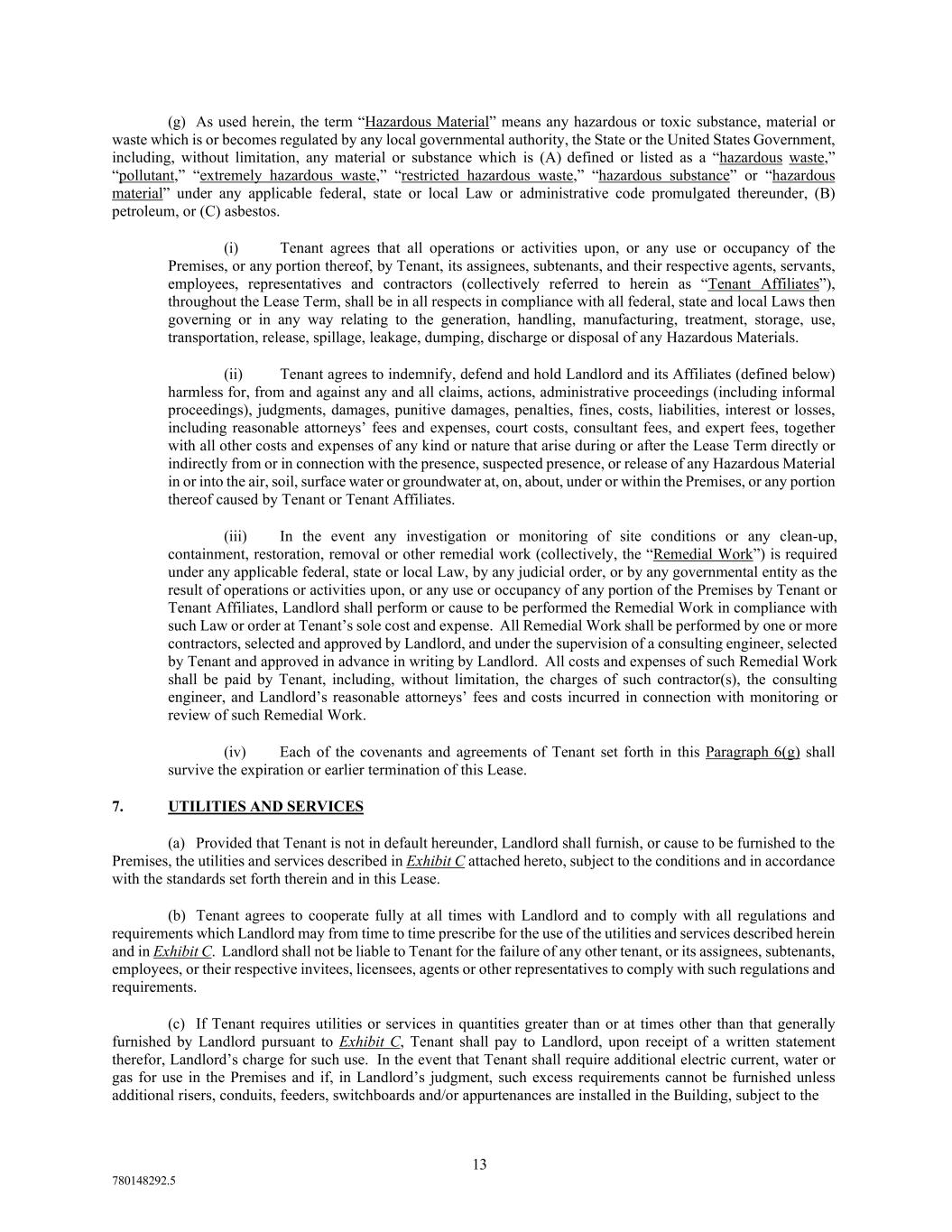 13 780148292.5 (g) As used herein, the term “Hazardous Material” means any hazardous or toxic substance, material or waste which is or becomes regulated by any local governmental authority, the State or the United States Government, including, without limitation, any material or substance which is (A) defined or listed as a “hazardous waste,” “pollutant,” “extremely hazardous waste,” “restricted hazardous waste,” “hazardous substance” or “hazardous material” under any applicable federal, state or local Law or administrative code promulgated thereunder, (B) petroleum, or (C) asbestos. (i) Tenant agrees that all operations or activities upon, or any use or occupancy of the Premises, or any portion thereof, by Tenant, its assignees, subtenants, and their respective agents, servants, employees, representatives and contractors (collectively referred to herein as “Tenant Affiliates”), throughout the Lease Term, shall be in all respects in compliance with all federal, state and local Laws then governing or in any way relating to the generation, handling, manufacturing, treatment, storage, use, transportation, release, spillage, leakage, dumping, discharge or disposal of any Hazardous Materials. (ii) Tenant agrees to indemnify, defend and hold Landlord and its Affiliates (defined below) harmless for, from and against any and all claims, actions, administrative proceedings (including informal proceedings), judgments, damages, punitive damages, penalties, fines, costs, liabilities, interest or losses, including reasonable attorneys’ fees and expenses, court costs, consultant fees, and expert fees, together with all other costs and expenses of any kind or nature that arise during or after the Lease Term directly or indirectly from or in connection with the presence, suspected presence, or release of any Hazardous Material in or into the air, soil, surface water or groundwater at, on, about, under or within the Premises, or any portion thereof caused by Tenant or Tenant Affiliates. (iii) In the event any investigation or monitoring of site conditions or any clean-up, containment, restoration, removal or other remedial work (collectively, the “Remedial Work”) is required under any applicable federal, state or local Law, by any judicial order, or by any governmental entity as the result of operations or activities upon, or any use or occupancy of any portion of the Premises by Tenant or Tenant Affiliates, Landlord shall perform or cause to be performed the Remedial Work in compliance with such Law or order at Tenant’s sole cost and expense. All Remedial Work shall be performed by one or more contractors, selected and approved by Landlord, and under the supervision of a consulting engineer, selected by Tenant and approved in advance in writing by Landlord. All costs and expenses of such Remedial Work shall be paid by Tenant, including, without limitation, the charges of such contractor(s), the consulting engineer, and Landlord’s reasonable attorneys’ fees and costs incurred in connection with monitoring or review of such Remedial Work. (iv) Each of the covenants and agreements of Tenant set forth in this Paragraph 6(g) shall survive the expiration or earlier termination of this Lease. 7. UTILITIES AND SERVICES (a) Provided that Tenant is not in default hereunder, Landlord shall furnish, or cause to be furnished to the Premises, the utilities and services described in Exhibit C attached hereto, subject to the conditions and in accordance with the standards set forth therein and in this Lease. (b) Tenant agrees to cooperate fully at all times with Landlord and to comply with all regulations and requirements which Landlord may from time to time prescribe for the use of the utilities and services described herein and in Exhibit C. Landlord shall not be liable to Tenant for the failure of any other tenant, or its assignees, subtenants, employees, or their respective invitees, licensees, agents or other representatives to comply with such regulations and requirements. (c) If Tenant requires utilities or services in quantities greater than or at times other than that generally furnished by Landlord pursuant to Exhibit C, Tenant shall pay to Landlord, upon receipt of a written statement therefor, Landlord’s charge for such use. In the event that Tenant shall require additional electric current, water or gas for use in the Premises and if, in Landlord’s judgment, such excess requirements cannot be furnished unless additional risers, conduits, feeders, switchboards and/or appurtenances are installed in the Building, subject to the