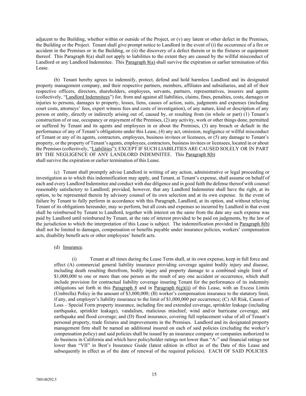 15 780148292.5 adjacent to the Building, whether within or outside of the Project, or (v) any latent or other defect in the Premises, the Building or the Project. Tenant shall give prompt notice to Landlord in the event of (i) the occurrence of a fire or accident in the Premises or in the Building, or (ii) the discovery of a defect therein or in the fixtures or equipment thereof. This Paragraph 8(a) shall not apply to liabilities to the extent they are caused by the willful misconduct of Landlord or any Landlord Indemnitee. This Paragraph 8(a) shall survive the expiration or earlier termination of this Lease. (b) Tenant hereby agrees to indemnify, protect, defend and hold harmless Landlord and its designated property management company, and their respective partners, members, affiliates and subsidiaries, and all of their respective officers, directors, shareholders, employees, servants, partners, representatives, insurers and agents (collectively, “Landlord Indemnitees”) for, from and against all liabilities, claims, fines, penalties, costs, damages or injuries to persons, damages to property, losses, liens, causes of action, suits, judgments and expenses (including court costs, attorneys’ fees, expert witness fees and costs of investigation), of any nature, kind or description of any person or entity, directly or indirectly arising out of, caused by, or resulting from (in whole or part) (1) Tenant’s construction of or use, occupancy or enjoyment of the Premises, (2) any activity, work or other things done, permitted or suffered by Tenant and its agents and employees in or about the Premises, (3) any breach or default in the performance of any of Tenant’s obligations under this Lease, (4) any act, omission, negligence or willful misconduct of Tenant or any of its agents, contractors, employees, business invitees or licensees, or (5) any damage to Tenant’s property, or the property of Tenant’s agents, employees, contractors, business invitees or licensees, located in or about the Premises (collectively, “Liabilities”); EXCEPT IF SUCH LIABILITIES ARE CAUSED SOLELY OR IN PART BY THE NEGLIGENCE OF ANY LANDLORD INDEMNITEE. This Paragraph 8(b) shall survive the expiration or earlier termination of this Lease. (c) Tenant shall promptly advise Landlord in writing of any action, administrative or legal proceeding or investigation as to which this indemnification may apply, and Tenant, at Tenant’s expense, shall assume on behalf of each and every Landlord Indemnitee and conduct with due diligence and in good faith the defense thereof with counsel reasonably satisfactory to Landlord; provided, however, that any Landlord Indemnitee shall have the right, at its option, to be represented therein by advisory counsel of its own selection and at its own expense. In the event of failure by Tenant to fully perform in accordance with this Paragraph, Landlord, at its option, and without relieving Tenant of its obligations hereunder, may so perform, but all costs and expenses so incurred by Landlord in that event shall be reimbursed by Tenant to Landlord, together with interest on the same from the date any such expense was paid by Landlord until reimbursed by Tenant, at the rate of interest provided to be paid on judgments, by the law of the jurisdiction to which the interpretation of this Lease is subject. The indemnification provided in Paragraph 8(b) shall not be limited to damages, compensation or benefits payable under insurance policies, workers’ compensation acts, disability benefit acts or other employees’ benefit acts. (d) Insurance. (i) Tenant at all times during the Lease Term shall, at its own expense, keep in full force and effect (A) commercial general liability insurance providing coverage against bodily injury and disease, including death resulting therefrom, bodily injury and property damage to a combined single limit of $1,000,000 to one or more than one person as the result of any one accident or occurrence, which shall include provision for contractual liability coverage insuring Tenant for the performance of its indemnity obligations set forth in this Paragraph 8 and in Paragraph 6(g)(ii) of this Lease, with an Excess Limits (Umbrella) Policy in the amount of $3,000,000; (B) worker’s compensation insurance to the statutory limit, if any, and employer’s liability insurance to the limit of $1,000,000 per occurrence; (C) All Risk, Causes of Loss – Special Form property insurance, including fire and extended coverage, sprinkler leakage (including earthquake, sprinkler leakage), vandalism, malicious mischief, wind and/or hurricane coverage, and earthquake and flood coverage; and (D) flood insurance, covering full replacement value of all of Tenant’s personal property, trade fixtures and improvements in the Premises. Landlord and its designated property management firm shall be named an additional insured on each of said policies (excluding the worker’s compensation policy) and said policies shall be issued by an insurance company or companies authorized to do business in California and which have policyholder ratings not lower than “A-” and financial ratings not lower than “VII” in Best’s Insurance Guide (latest edition in effect as of the Date of this Lease and subsequently in effect as of the date of renewal of the required policies). EACH OF SAID POLICIES