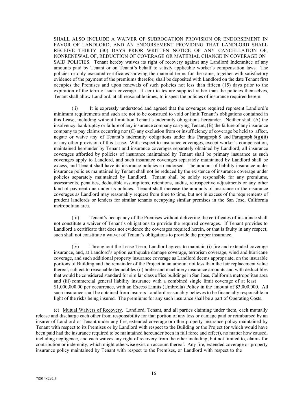 16 780148292.5 SHALL ALSO INCLUDE A WAIVER OF SUBROGATION PROVISION OR ENDORSEMENT IN FAVOR OF LANDLORD, AND AN ENDORSEMENT PROVIDING THAT LANDLORD SHALL RECEIVE THIRTY (30) DAYS PRIOR WRITTEN NOTICE OF ANY CANCELLATION OF, NONRENEWAL OF, REDUCTION OF COVERAGE OR MATERIAL CHANGE IN COVERAGE ON SAID POLICIES. Tenant hereby waives its right of recovery against any Landlord Indemnitee of any amounts paid by Tenant or on Tenant’s behalf to satisfy applicable worker’s compensation laws. The policies or duly executed certificates showing the material terms for the same, together with satisfactory evidence of the payment of the premiums therefor, shall be deposited with Landlord on the date Tenant first occupies the Premises and upon renewals of such policies not less than fifteen (15) days prior to the expiration of the term of such coverage. If certificates are supplied rather than the policies themselves, Tenant shall allow Landlord, at all reasonable times, to inspect the policies of insurance required herein. (ii) It is expressly understood and agreed that the coverages required represent Landlord’s minimum requirements and such are not to be construed to void or limit Tenant’s obligations contained in this Lease, including without limitation Tenant’s indemnity obligations hereunder. Neither shall (A) the insolvency, bankruptcy or failure of any insurance company carrying Tenant, (B) the failure of any insurance company to pay claims occurring nor (C) any exclusion from or insufficiency of coverage be held to affect, negate or waive any of Tenant’s indemnity obligations under this Paragraph 8 and Paragraph 6(g)(ii) or any other provision of this Lease. With respect to insurance coverages, except worker’s compensation, maintained hereunder by Tenant and insurance coverages separately obtained by Landlord, all insurance coverages afforded by policies of insurance maintained by Tenant shall be primary insurance as such coverages apply to Landlord, and such insurance coverages separately maintained by Landlord shall be excess, and Tenant shall have its insurance policies so endorsed. The amount of liability insurance under insurance policies maintained by Tenant shall not be reduced by the existence of insurance coverage under policies separately maintained by Landlord. Tenant shall be solely responsible for any premiums, assessments, penalties, deductible assumptions, retentions, audits, retrospective adjustments or any other kind of payment due under its policies. Tenant shall increase the amounts of insurance or the insurance coverages as Landlord may reasonably request from time to time, but not in excess of the requirements of prudent landlords or lenders for similar tenants occupying similar premises in the San Jose, California metropolitan area. (iii) Tenant’s occupancy of the Premises without delivering the certificates of insurance shall not constitute a waiver of Tenant’s obligations to provide the required coverages. If Tenant provides to Landlord a certificate that does not evidence the coverages required herein, or that is faulty in any respect, such shall not constitute a waiver of Tenant’s obligations to provide the proper insurance. (iv) Throughout the Lease Term, Landlord agrees to maintain (i) fire and extended coverage insurance, and, at Landlord’s option earthquake damage coverage, terrorism coverage, wind and hurricane coverage, and such additional property insurance coverage as Landlord deems appropriate, on the insurable portions of Building and the remainder of the Project in an amount not less than the fair replacement value thereof, subject to reasonable deductibles (ii) boiler and machinery insurance amounts and with deductibles that would be considered standard for similar class office buildings in San Jose, California metropolitan area and (iii) commercial general liability insurance with a combined single limit coverage of at least $1,000,000.00 per occurrence, with an Excess Limits (Umbrella) Policy in the amount of $3,000,000. All such insurance shall be obtained from insurers Landlord reasonably believes to be financially responsible in light of the risks being insured. The premiums for any such insurance shall be a part of Operating Costs. (e) Mutual Waivers of Recovery. Landlord, Tenant, and all parties claiming under them, each mutually release and discharge each other from responsibility for that portion of any loss or damage paid or reimbursed by an insurer of Landlord or Tenant under any fire, extended coverage or other property insurance policy maintained by Tenant with respect to its Premises or by Landlord with respect to the Building or the Project (or which would have been paid had the insurance required to be maintained hereunder been in full force and effect), no matter how caused, including negligence, and each waives any right of recovery from the other including, but not limited to, claims for contribution or indemnity, which might otherwise exist on account thereof. Any fire, extended coverage or property insurance policy maintained by Tenant with respect to the Premises, or Landlord with respect to the