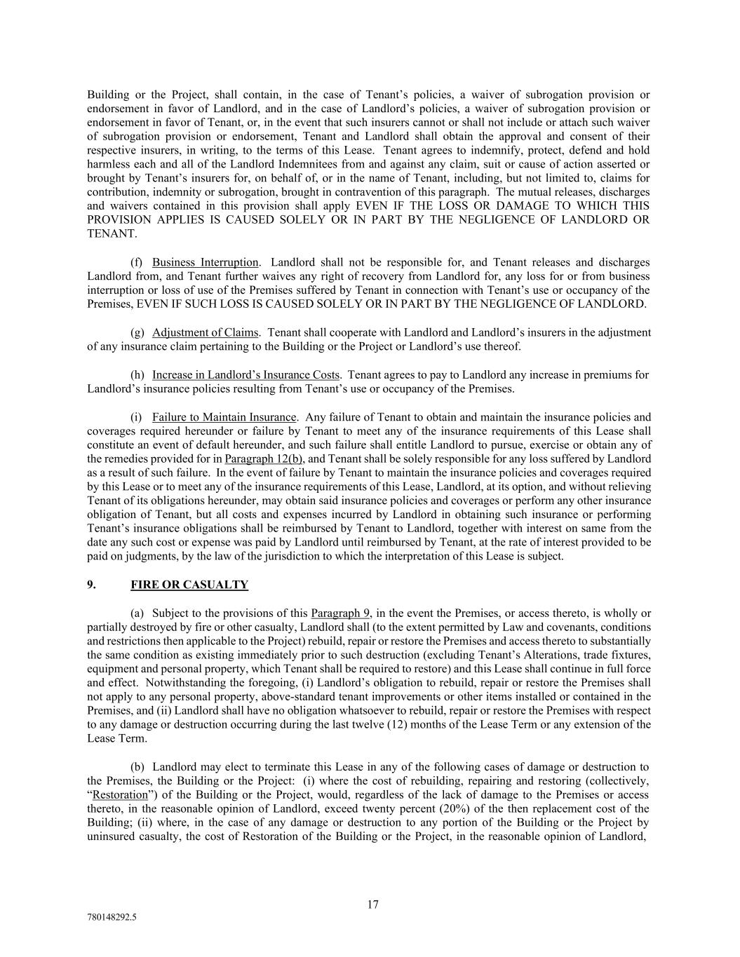 17 780148292.5 Building or the Project, shall contain, in the case of Tenant’s policies, a waiver of subrogation provision or endorsement in favor of Landlord, and in the case of Landlord’s policies, a waiver of subrogation provision or endorsement in favor of Tenant, or, in the event that such insurers cannot or shall not include or attach such waiver of subrogation provision or endorsement, Tenant and Landlord shall obtain the approval and consent of their respective insurers, in writing, to the terms of this Lease. Tenant agrees to indemnify, protect, defend and hold harmless each and all of the Landlord Indemnitees from and against any claim, suit or cause of action asserted or brought by Tenant’s insurers for, on behalf of, or in the name of Tenant, including, but not limited to, claims for contribution, indemnity or subrogation, brought in contravention of this paragraph. The mutual releases, discharges and waivers contained in this provision shall apply EVEN IF THE LOSS OR DAMAGE TO WHICH THIS PROVISION APPLIES IS CAUSED SOLELY OR IN PART BY THE NEGLIGENCE OF LANDLORD OR TENANT. (f) Business Interruption. Landlord shall not be responsible for, and Tenant releases and discharges Landlord from, and Tenant further waives any right of recovery from Landlord for, any loss for or from business interruption or loss of use of the Premises suffered by Tenant in connection with Tenant’s use or occupancy of the Premises, EVEN IF SUCH LOSS IS CAUSED SOLELY OR IN PART BY THE NEGLIGENCE OF LANDLORD. (g) Adjustment of Claims. Tenant shall cooperate with Landlord and Landlord’s insurers in the adjustment of any insurance claim pertaining to the Building or the Project or Landlord’s use thereof. (h) Increase in Landlord’s Insurance Costs. Tenant agrees to pay to Landlord any increase in premiums for Landlord’s insurance policies resulting from Tenant’s use or occupancy of the Premises. (i) Failure to Maintain Insurance. Any failure of Tenant to obtain and maintain the insurance policies and coverages required hereunder or failure by Tenant to meet any of the insurance requirements of this Lease shall constitute an event of default hereunder, and such failure shall entitle Landlord to pursue, exercise or obtain any of the remedies provided for in Paragraph 12(b), and Tenant shall be solely responsible for any loss suffered by Landlord as a result of such failure. In the event of failure by Tenant to maintain the insurance policies and coverages required by this Lease or to meet any of the insurance requirements of this Lease, Landlord, at its option, and without relieving Tenant of its obligations hereunder, may obtain said insurance policies and coverages or perform any other insurance obligation of Tenant, but all costs and expenses incurred by Landlord in obtaining such insurance or performing Tenant’s insurance obligations shall be reimbursed by Tenant to Landlord, together with interest on same from the date any such cost or expense was paid by Landlord until reimbursed by Tenant, at the rate of interest provided to be paid on judgments, by the law of the jurisdiction to which the interpretation of this Lease is subject. 9. FIRE OR CASUALTY (a) Subject to the provisions of this Paragraph 9, in the event the Premises, or access thereto, is wholly or partially destroyed by fire or other casualty, Landlord shall (to the extent permitted by Law and covenants, conditions and restrictions then applicable to the Project) rebuild, repair or restore the Premises and access thereto to substantially the same condition as existing immediately prior to such destruction (excluding Tenant’s Alterations, trade fixtures, equipment and personal property, which Tenant shall be required to restore) and this Lease shall continue in full force and effect. Notwithstanding the foregoing, (i) Landlord’s obligation to rebuild, repair or restore the Premises shall not apply to any personal property, above-standard tenant improvements or other items installed or contained in the Premises, and (ii) Landlord shall have no obligation whatsoever to rebuild, repair or restore the Premises with respect to any damage or destruction occurring during the last twelve (12) months of the Lease Term or any extension of the Lease Term. (b) Landlord may elect to terminate this Lease in any of the following cases of damage or destruction to the Premises, the Building or the Project: (i) where the cost of rebuilding, repairing and restoring (collectively, “Restoration”) of the Building or the Project, would, regardless of the lack of damage to the Premises or access thereto, in the reasonable opinion of Landlord, exceed twenty percent (20%) of the then replacement cost of the Building; (ii) where, in the case of any damage or destruction to any portion of the Building or the Project by uninsured casualty, the cost of Restoration of the Building or the Project, in the reasonable opinion of Landlord,