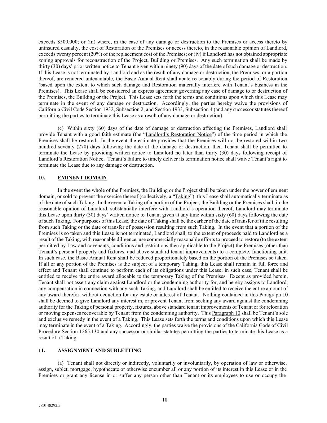 18 780148292.5 exceeds $500,000; or (iii) where, in the case of any damage or destruction to the Premises or access thereto by uninsured casualty, the cost of Restoration of the Premises or access thereto, in the reasonable opinion of Landlord, exceeds twenty percent (20%) of the replacement cost of the Premises; or (iv) if Landlord has not obtained appropriate zoning approvals for reconstruction of the Project, Building or Premises. Any such termination shall be made by thirty (30) days’ prior written notice to Tenant given within ninety (90) days of the date of such damage or destruction. If this Lease is not terminated by Landlord and as the result of any damage or destruction, the Premises, or a portion thereof, are rendered untenantable, the Basic Annual Rent shall abate reasonably during the period of Restoration (based upon the extent to which such damage and Restoration materially interfere with Tenant’s business in the Premises). This Lease shall be considered an express agreement governing any case of damage to or destruction of the Premises, the Building or the Project. This Lease sets forth the terms and conditions upon which this Lease may terminate in the event of any damage or destruction. Accordingly, the parties hereby waive the provisions of California Civil Code Section 1932, Subsection 2, and Section 1933, Subsection 4 (and any successor statutes thereof permitting the parties to terminate this Lease as a result of any damage or destruction). (c) Within sixty (60) days of the date of damage or destruction affecting the Premises, Landlord shall provide Tenant with a good faith estimate (the “Landlord’s Restoration Notice”) of the time period in which the Premises shall be restored. In the event the estimate provides that the Premises will not be restored within two hundred seventy (270) days following the date of the damage or destruction, then Tenant shall be permitted to terminate the Lease by providing written notice to Landlord no later than thirty (30) days following receipt of Landlord’s Restoration Notice. Tenant’s failure to timely deliver its termination notice shall waive Tenant’s right to terminate the Lease due to any damage or destruction. 10. EMINENT DOMAIN In the event the whole of the Premises, the Building or the Project shall be taken under the power of eminent domain, or sold to prevent the exercise thereof (collectively, a “Taking”), this Lease shall automatically terminate as of the date of such Taking. In the event a Taking of a portion of the Project, the Building or the Premises shall, in the reasonable opinion of Landlord, substantially interfere with Landlord’s operation thereof, Landlord may terminate this Lease upon thirty (30) days’ written notice to Tenant given at any time within sixty (60) days following the date of such Taking. For purposes of this Lease, the date of Taking shall be the earlier of the date of transfer of title resulting from such Taking or the date of transfer of possession resulting from such Taking. In the event that a portion of the Premises is so taken and this Lease is not terminated, Landlord shall, to the extent of proceeds paid to Landlord as a result of the Taking, with reasonable diligence, use commercially reasonable efforts to proceed to restore (to the extent permitted by Law and covenants, conditions and restrictions then applicable to the Project) the Premises (other than Tenant’s personal property and fixtures, and above-standard tenant improvements) to a complete, functioning unit. In such case, the Basic Annual Rent shall be reduced proportionately based on the portion of the Premises so taken. If all or any portion of the Premises is the subject of a temporary Taking, this Lease shall remain in full force and effect and Tenant shall continue to perform each of its obligations under this Lease; in such case, Tenant shall be entitled to receive the entire award allocable to the temporary Taking of the Premises. Except as provided herein, Tenant shall not assert any claim against Landlord or the condemning authority for, and hereby assigns to Landlord, any compensation in connection with any such Taking, and Landlord shall be entitled to receive the entire amount of any award therefor, without deduction for any estate or interest of Tenant. Nothing contained in this Paragraph 10 shall be deemed to give Landlord any interest in, or prevent Tenant from seeking any award against the condemning authority for the Taking of personal property, fixtures, above standard tenant improvements of Tenant or for relocation or moving expenses recoverable by Tenant from the condemning authority. This Paragraph 10 shall be Tenant’s sole and exclusive remedy in the event of a Taking. This Lease sets forth the terms and conditions upon which this Lease may terminate in the event of a Taking. Accordingly, the parties waive the provisions of the California Code of Civil Procedure Section 1265.130 and any successor or similar statutes permitting the parties to terminate this Lease as a result of a Taking. 11. ASSIGNMENT AND SUBLETTING (a) Tenant shall not directly or indirectly, voluntarily or involuntarily, by operation of law or otherwise, assign, sublet, mortgage, hypothecate or otherwise encumber all or any portion of its interest in this Lease or in the Premises or grant any license in or suffer any person other than Tenant or its employees to use or occupy the