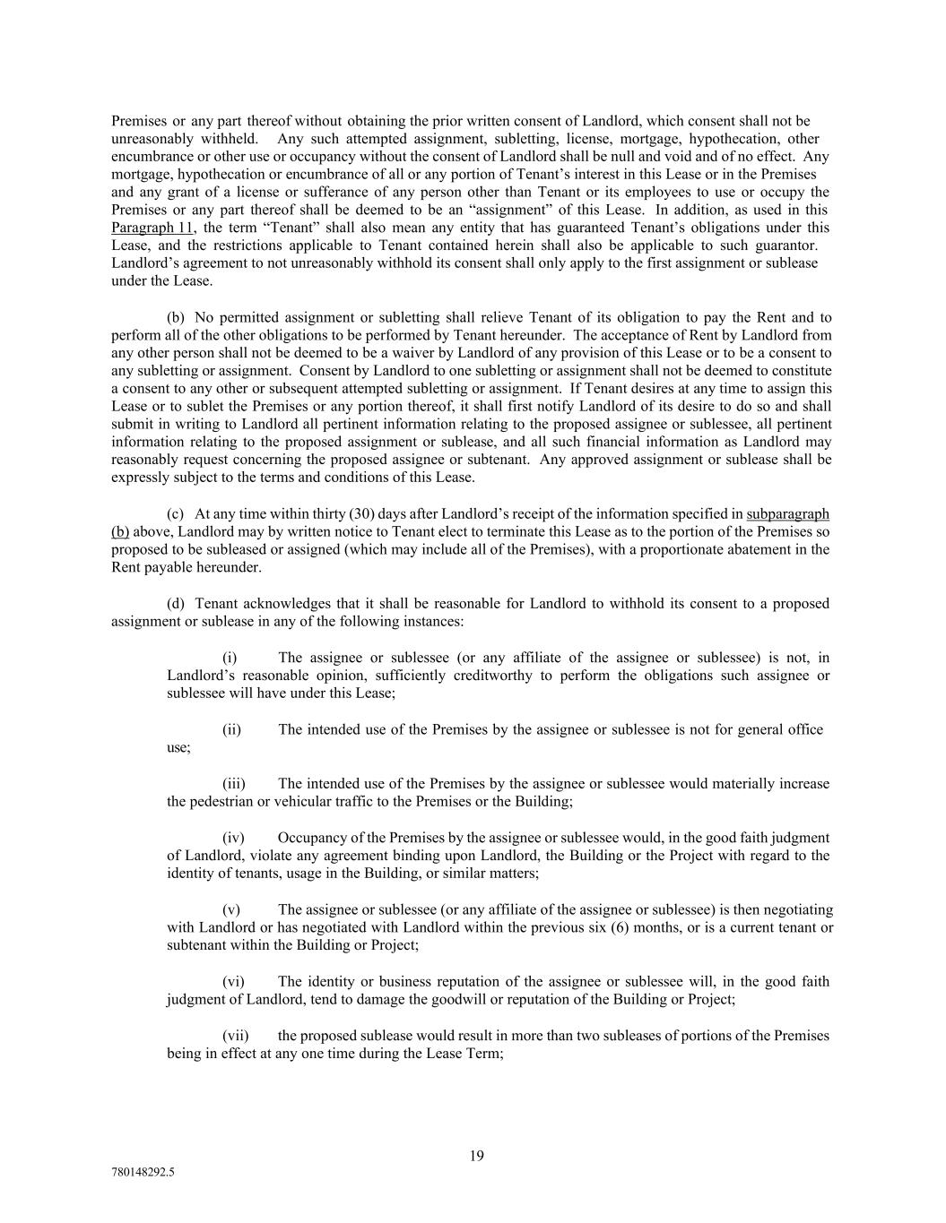 19 780148292.5 Premises or any part thereof without obtaining the prior written consent of Landlord, which consent shall not be unreasonably withheld. Any such attempted assignment, subletting, license, mortgage, hypothecation, other encumbrance or other use or occupancy without the consent of Landlord shall be null and void and of no effect. Any mortgage, hypothecation or encumbrance of all or any portion of Tenant’s interest in this Lease or in the Premises and any grant of a license or sufferance of any person other than Tenant or its employees to use or occupy the Premises or any part thereof shall be deemed to be an “assignment” of this Lease. In addition, as used in this Paragraph 11, the term “Tenant” shall also mean any entity that has guaranteed Tenant’s obligations under this Lease, and the restrictions applicable to Tenant contained herein shall also be applicable to such guarantor. Landlord’s agreement to not unreasonably withhold its consent shall only apply to the first assignment or sublease under the Lease. (b) No permitted assignment or subletting shall relieve Tenant of its obligation to pay the Rent and to perform all of the other obligations to be performed by Tenant hereunder. The acceptance of Rent by Landlord from any other person shall not be deemed to be a waiver by Landlord of any provision of this Lease or to be a consent to any subletting or assignment. Consent by Landlord to one subletting or assignment shall not be deemed to constitute a consent to any other or subsequent attempted subletting or assignment. If Tenant desires at any time to assign this Lease or to sublet the Premises or any portion thereof, it shall first notify Landlord of its desire to do so and shall submit in writing to Landlord all pertinent information relating to the proposed assignee or sublessee, all pertinent information relating to the proposed assignment or sublease, and all such financial information as Landlord may reasonably request concerning the proposed assignee or subtenant. Any approved assignment or sublease shall be expressly subject to the terms and conditions of this Lease. (c) At any time within thirty (30) days after Landlord’s receipt of the information specified in subparagraph (b) above, Landlord may by written notice to Tenant elect to terminate this Lease as to the portion of the Premises so proposed to be subleased or assigned (which may include all of the Premises), with a proportionate abatement in the Rent payable hereunder. (d) Tenant acknowledges that it shall be reasonable for Landlord to withhold its consent to a proposed assignment or sublease in any of the following instances: (i) The assignee or sublessee (or any affiliate of the assignee or sublessee) is not, in Landlord’s reasonable opinion, sufficiently creditworthy to perform the obligations such assignee or sublessee will have under this Lease; (ii) The intended use of the Premises by the assignee or sublessee is not for general office use; (iii) The intended use of the Premises by the assignee or sublessee would materially increase the pedestrian or vehicular traffic to the Premises or the Building; (iv) Occupancy of the Premises by the assignee or sublessee would, in the good faith judgment of Landlord, violate any agreement binding upon Landlord, the Building or the Project with regard to the identity of tenants, usage in the Building, or similar matters; (v) The assignee or sublessee (or any affiliate of the assignee or sublessee) is then negotiating with Landlord or has negotiated with Landlord within the previous six (6) months, or is a current tenant or subtenant within the Building or Project; (vi) The identity or business reputation of the assignee or sublessee will, in the good faith judgment of Landlord, tend to damage the goodwill or reputation of the Building or Project; (vii) the proposed sublease would result in more than two subleases of portions of the Premises being in effect at any one time during the Lease Term;