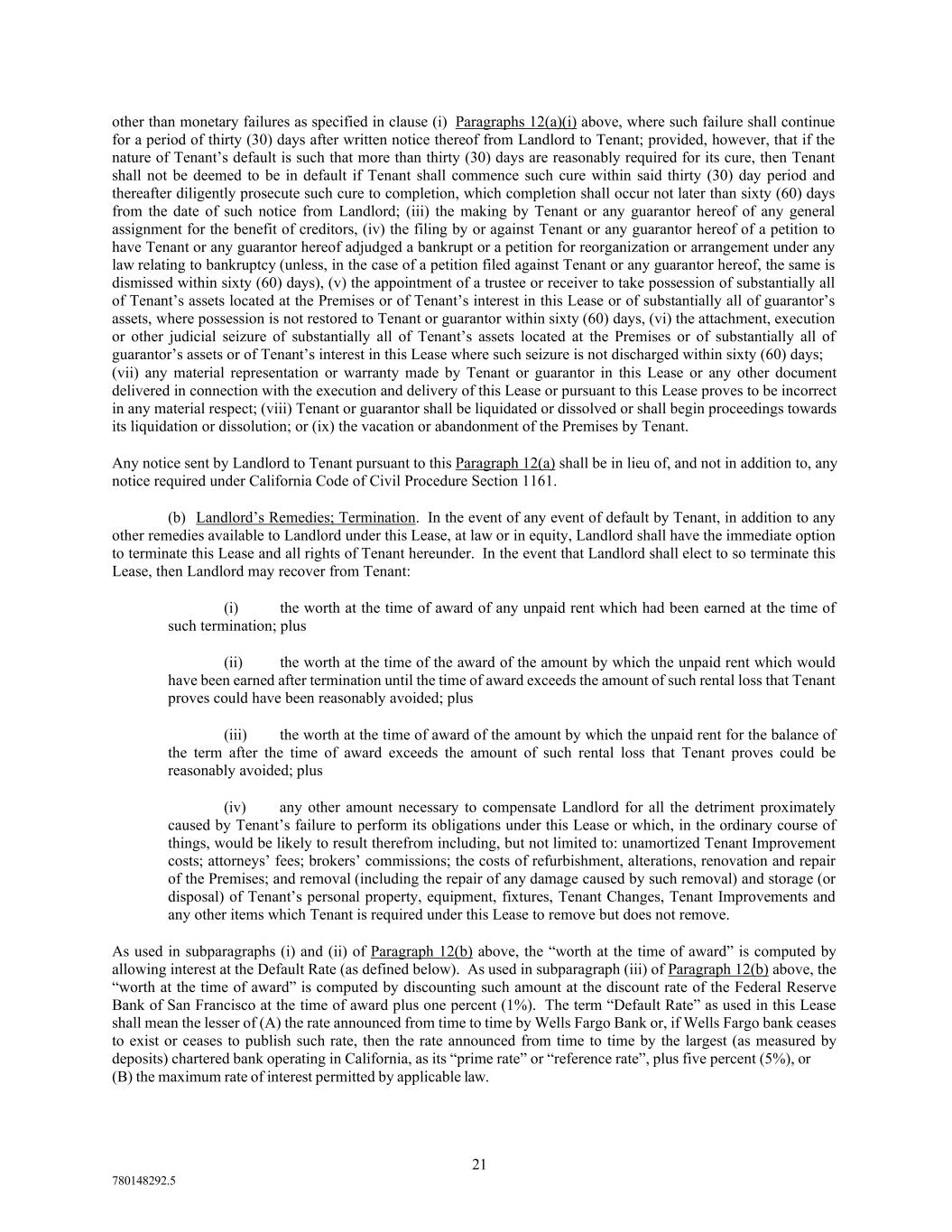 21 780148292.5 other than monetary failures as specified in clause (i) Paragraphs 12(a)(i) above, where such failure shall continue for a period of thirty (30) days after written notice thereof from Landlord to Tenant; provided, however, that if the nature of Tenant’s default is such that more than thirty (30) days are reasonably required for its cure, then Tenant shall not be deemed to be in default if Tenant shall commence such cure within said thirty (30) day period and thereafter diligently prosecute such cure to completion, which completion shall occur not later than sixty (60) days from the date of such notice from Landlord; (iii) the making by Tenant or any guarantor hereof of any general assignment for the benefit of creditors, (iv) the filing by or against Tenant or any guarantor hereof of a petition to have Tenant or any guarantor hereof adjudged a bankrupt or a petition for reorganization or arrangement under any law relating to bankruptcy (unless, in the case of a petition filed against Tenant or any guarantor hereof, the same is dismissed within sixty (60) days), (v) the appointment of a trustee or receiver to take possession of substantially all of Tenant’s assets located at the Premises or of Tenant’s interest in this Lease or of substantially all of guarantor’s assets, where possession is not restored to Tenant or guarantor within sixty (60) days, (vi) the attachment, execution or other judicial seizure of substantially all of Tenant’s assets located at the Premises or of substantially all of guarantor’s assets or of Tenant’s interest in this Lease where such seizure is not discharged within sixty (60) days; (vii) any material representation or warranty made by Tenant or guarantor in this Lease or any other document delivered in connection with the execution and delivery of this Lease or pursuant to this Lease proves to be incorrect in any material respect; (viii) Tenant or guarantor shall be liquidated or dissolved or shall begin proceedings towards its liquidation or dissolution; or (ix) the vacation or abandonment of the Premises by Tenant. Any notice sent by Landlord to Tenant pursuant to this Paragraph 12(a) shall be in lieu of, and not in addition to, any notice required under California Code of Civil Procedure Section 1161. (b) Landlord’s Remedies; Termination. In the event of any event of default by Tenant, in addition to any other remedies available to Landlord under this Lease, at law or in equity, Landlord shall have the immediate option to terminate this Lease and all rights of Tenant hereunder. In the event that Landlord shall elect to so terminate this Lease, then Landlord may recover from Tenant: (i) the worth at the time of award of any unpaid rent which had been earned at the time of such termination; plus (ii) the worth at the time of the award of the amount by which the unpaid rent which would have been earned after termination until the time of award exceeds the amount of such rental loss that Tenant proves could have been reasonably avoided; plus (iii) the worth at the time of award of the amount by which the unpaid rent for the balance of the term after the time of award exceeds the amount of such rental loss that Tenant proves could be reasonably avoided; plus (iv) any other amount necessary to compensate Landlord for all the detriment proximately caused by Tenant’s failure to perform its obligations under this Lease or which, in the ordinary course of things, would be likely to result therefrom including, but not limited to: unamortized Tenant Improvement costs; attorneys’ fees; brokers’ commissions; the costs of refurbishment, alterations, renovation and repair of the Premises; and removal (including the repair of any damage caused by such removal) and storage (or disposal) of Tenant’s personal property, equipment, fixtures, Tenant Changes, Tenant Improvements and any other items which Tenant is required under this Lease to remove but does not remove. As used in subparagraphs (i) and (ii) of Paragraph 12(b) above, the “worth at the time of award” is computed by allowing interest at the Default Rate (as defined below). As used in subparagraph (iii) of Paragraph 12(b) above, the “worth at the time of award” is computed by discounting such amount at the discount rate of the Federal Reserve Bank of San Francisco at the time of award plus one percent (1%). The term “Default Rate” as used in this Lease shall mean the lesser of (A) the rate announced from time to time by Wells Fargo Bank or, if Wells Fargo bank ceases to exist or ceases to publish such rate, then the rate announced from time to time by the largest (as measured by deposits) chartered bank operating in California, as its “prime rate” or “reference rate”, plus five percent (5%), or (B) the maximum rate of interest permitted by applicable law.