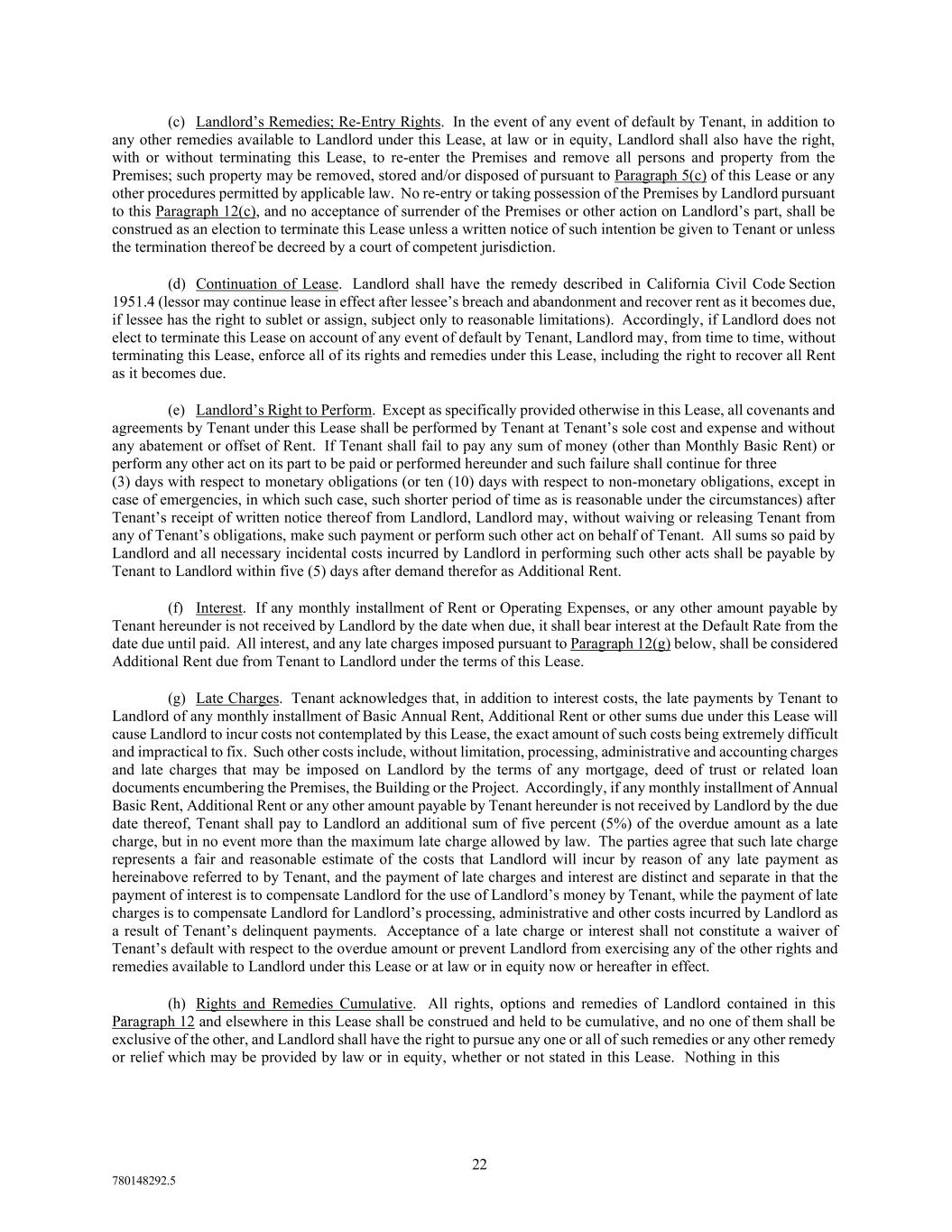 22 780148292.5 (c) Landlord’s Remedies; Re-Entry Rights. In the event of any event of default by Tenant, in addition to any other remedies available to Landlord under this Lease, at law or in equity, Landlord shall also have the right, with or without terminating this Lease, to re-enter the Premises and remove all persons and property from the Premises; such property may be removed, stored and/or disposed of pursuant to Paragraph 5(c) of this Lease or any other procedures permitted by applicable law. No re-entry or taking possession of the Premises by Landlord pursuant to this Paragraph 12(c), and no acceptance of surrender of the Premises or other action on Landlord’s part, shall be construed as an election to terminate this Lease unless a written notice of such intention be given to Tenant or unless the termination thereof be decreed by a court of competent jurisdiction. (d) Continuation of Lease. Landlord shall have the remedy described in California Civil Code Section 1951.4 (lessor may continue lease in effect after lessee’s breach and abandonment and recover rent as it becomes due, if lessee has the right to sublet or assign, subject only to reasonable limitations). Accordingly, if Landlord does not elect to terminate this Lease on account of any event of default by Tenant, Landlord may, from time to time, without terminating this Lease, enforce all of its rights and remedies under this Lease, including the right to recover all Rent as it becomes due. (e) Landlord’s Right to Perform. Except as specifically provided otherwise in this Lease, all covenants and agreements by Tenant under this Lease shall be performed by Tenant at Tenant’s sole cost and expense and without any abatement or offset of Rent. If Tenant shall fail to pay any sum of money (other than Monthly Basic Rent) or perform any other act on its part to be paid or performed hereunder and such failure shall continue for three (3) days with respect to monetary obligations (or ten (10) days with respect to non-monetary obligations, except in case of emergencies, in which such case, such shorter period of time as is reasonable under the circumstances) after Tenant’s receipt of written notice thereof from Landlord, Landlord may, without waiving or releasing Tenant from any of Tenant’s obligations, make such payment or perform such other act on behalf of Tenant. All sums so paid by Landlord and all necessary incidental costs incurred by Landlord in performing such other acts shall be payable by Tenant to Landlord within five (5) days after demand therefor as Additional Rent. (f) Interest. If any monthly installment of Rent or Operating Expenses, or any other amount payable by Tenant hereunder is not received by Landlord by the date when due, it shall bear interest at the Default Rate from the date due until paid. All interest, and any late charges imposed pursuant to Paragraph 12(g) below, shall be considered Additional Rent due from Tenant to Landlord under the terms of this Lease. (g) Late Charges. Tenant acknowledges that, in addition to interest costs, the late payments by Tenant to Landlord of any monthly installment of Basic Annual Rent, Additional Rent or other sums due under this Lease will cause Landlord to incur costs not contemplated by this Lease, the exact amount of such costs being extremely difficult and impractical to fix. Such other costs include, without limitation, processing, administrative and accounting charges and late charges that may be imposed on Landlord by the terms of any mortgage, deed of trust or related loan documents encumbering the Premises, the Building or the Project. Accordingly, if any monthly installment of Annual Basic Rent, Additional Rent or any other amount payable by Tenant hereunder is not received by Landlord by the due date thereof, Tenant shall pay to Landlord an additional sum of five percent (5%) of the overdue amount as a late charge, but in no event more than the maximum late charge allowed by law. The parties agree that such late charge represents a fair and reasonable estimate of the costs that Landlord will incur by reason of any late payment as hereinabove referred to by Tenant, and the payment of late charges and interest are distinct and separate in that the payment of interest is to compensate Landlord for the use of Landlord’s money by Tenant, while the payment of late charges is to compensate Landlord for Landlord’s processing, administrative and other costs incurred by Landlord as a result of Tenant’s delinquent payments. Acceptance of a late charge or interest shall not constitute a waiver of Tenant’s default with respect to the overdue amount or prevent Landlord from exercising any of the other rights and remedies available to Landlord under this Lease or at law or in equity now or hereafter in effect. (h) Rights and Remedies Cumulative. All rights, options and remedies of Landlord contained in this Paragraph 12 and elsewhere in this Lease shall be construed and held to be cumulative, and no one of them shall be exclusive of the other, and Landlord shall have the right to pursue any one or all of such remedies or any other remedy or relief which may be provided by law or in equity, whether or not stated in this Lease. Nothing in this