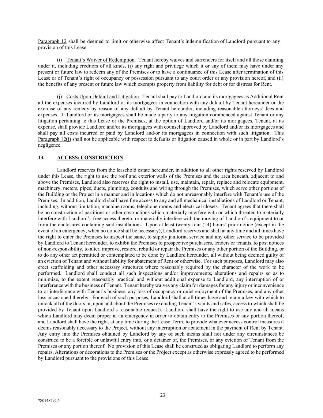 23 780148292.5 Paragraph 12 shall be deemed to limit or otherwise affect Tenant’s indemnification of Landlord pursuant to any provision of this Lease. (i) Tenant’s Waiver of Redemption. Tenant hereby waives and surrenders for itself and all those claiming under it, including creditors of all kinds, (i) any right and privilege which it or any of them may have under any present or future law to redeem any of the Premises or to have a continuance of this Lease after termination of this Lease or of Tenant’s right of occupancy or possession pursuant to any court order or any provision hereof, and (ii) the benefits of any present or future law which exempts property from liability for debt or for distress for Rent. (j) Costs Upon Default and Litigation. Tenant shall pay to Landlord and its mortgagees as Additional Rent all the expenses incurred by Landlord or its mortgagees in connection with any default by Tenant hereunder or the exercise of any remedy by reason of any default by Tenant hereunder, including reasonable attorneys’ fees and expenses. If Landlord or its mortgagees shall be made a party to any litigation commenced against Tenant or any litigation pertaining to this Lease or the Premises, at the option of Landlord and/or its mortgagees, Tenant, at its expense, shall provide Landlord and/or its mortgagees with counsel approved by Landlord and/or its mortgagees and shall pay all costs incurred or paid by Landlord and/or its mortgagees in connection with such litigation. This Paragraph 12(j) shall not be applicable with respect to defaults or litigation caused in whole or in part by Landlord’s negligence. 13. ACCESS; CONSTRUCTION Landlord reserves from the leasehold estate hereunder, in addition to all other rights reserved by Landlord under this Lease, the right to use the roof and exterior walls of the Premises and the area beneath, adjacent to and above the Premises, Landlord also reserves the right to install, use, maintain, repair, replace and relocate equipment, machinery, meters, pipes, ducts, plumbing, conduits and wiring through the Premises, which serve other portions of the Building or the Project in a manner and in locations which do not unreasonably interfere with Tenant’s use of the Premises. In addition, Landlord shall have free access to any and all mechanical installations of Landlord or Tenant, including, without limitation, machine rooms, telephone rooms and electrical closets. Tenant agrees that there shall be no construction of partitions or other obstructions which materially interfere with or which threaten to materially interfere with Landlord’s free access thereto, or materially interfere with the moving of Landlord’s equipment to or from the enclosures containing said installations. Upon at least twenty-four (24) hours’ prior notice (except in the event of an emergency, when no notice shall be necessary), Landlord reserves and shall at any time and all times have the right to enter the Premises to inspect the same, to supply janitorial service and any other service to be provided by Landlord to Tenant hereunder, to exhibit the Premises to prospective purchasers, lenders or tenants, to post notices of non-responsibility, to alter, improve, restore, rebuild or repair the Premises or any other portion of the Building, or to do any other act permitted or contemplated to be done by Landlord hereunder, all without being deemed guilty of an eviction of Tenant and without liability for abatement of Rent or otherwise. For such purposes, Landlord may also erect scaffolding and other necessary structures where reasonably required by the character of the work to be performed. Landlord shall conduct all such inspections and/or improvements, alterations and repairs so as to minimize, to the extent reasonably practical and without additional expense to Landlord, any interruption of or interference with the business of Tenant. Tenant hereby waives any claim for damages for any injury or inconvenience to or interference with Tenant’s business, any loss of occupancy or quiet enjoyment of the Premises, and any other loss occasioned thereby. For each of such purposes, Landlord shall at all times have and retain a key with which to unlock all of the doors in, upon and about the Premises (excluding Tenant’s vaults and safes, access to which shall be provided by Tenant upon Landlord’s reasonable request). Landlord shall have the right to use any and all means which Landlord may deem proper in an emergency in order to obtain entry to the Premises or any portion thereof, and Landlord shall have the right, at any time during the Lease Term, to provide whatever access control measures it deems reasonably necessary to the Project, without any interruption or abatement in the payment of Rent by Tenant. Any entry into the Premises obtained by Landlord by any of such means shall not under any circumstances be construed to be a forcible or unlawful entry into, or a detainer of, the Premises, or any eviction of Tenant from the Premises or any portion thereof. No provision of this Lease shall be construed as obligating Landlord to perform any repairs, Alterations or decorations to the Premises or the Project except as otherwise expressly agreed to be performed by Landlord pursuant to the provisions of this Lease.