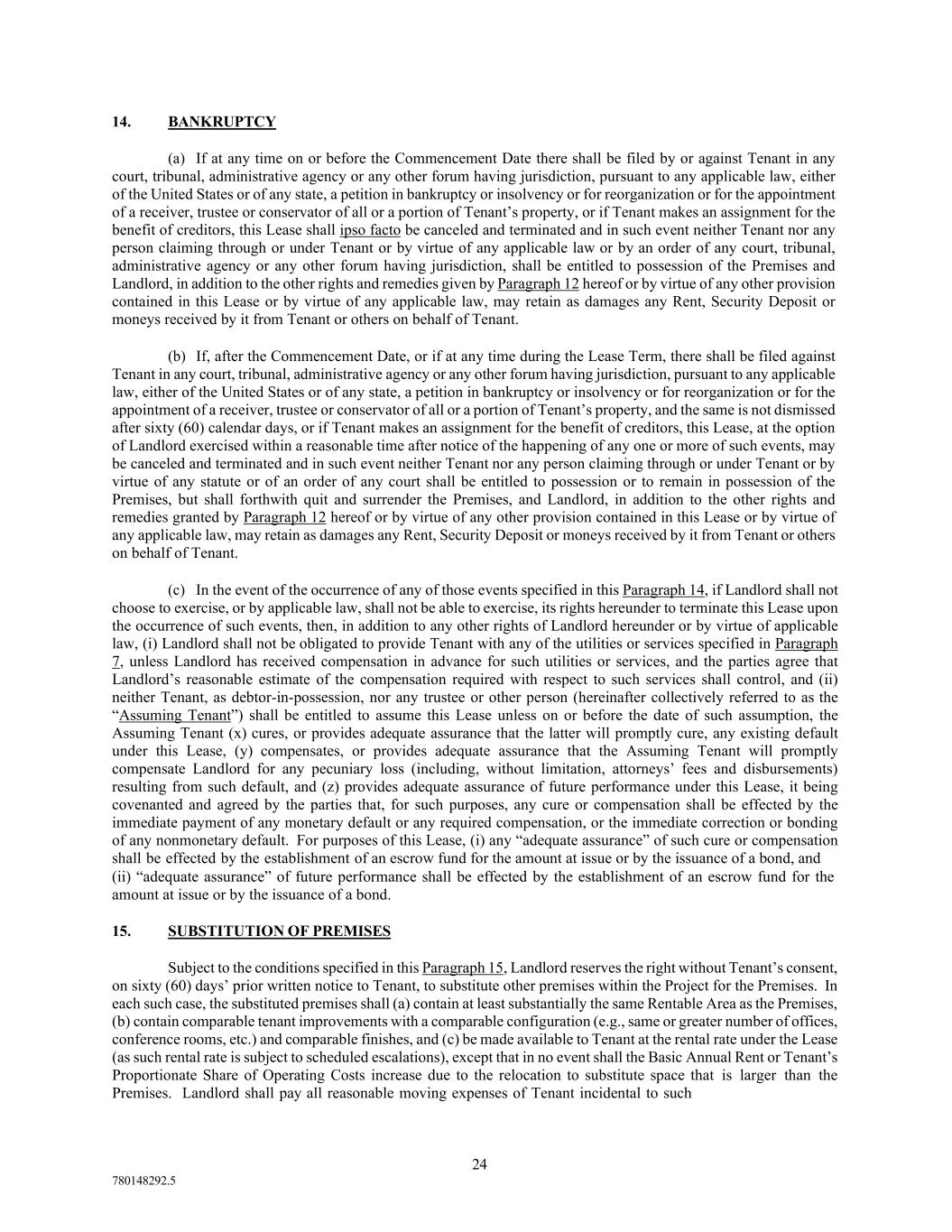 24 780148292.5 14. BANKRUPTCY (a) If at any time on or before the Commencement Date there shall be filed by or against Tenant in any court, tribunal, administrative agency or any other forum having jurisdiction, pursuant to any applicable law, either of the United States or of any state, a petition in bankruptcy or insolvency or for reorganization or for the appointment of a receiver, trustee or conservator of all or a portion of Tenant’s property, or if Tenant makes an assignment for the benefit of creditors, this Lease shall ipso facto be canceled and terminated and in such event neither Tenant nor any person claiming through or under Tenant or by virtue of any applicable law or by an order of any court, tribunal, administrative agency or any other forum having jurisdiction, shall be entitled to possession of the Premises and Landlord, in addition to the other rights and remedies given by Paragraph 12 hereof or by virtue of any other provision contained in this Lease or by virtue of any applicable law, may retain as damages any Rent, Security Deposit or moneys received by it from Tenant or others on behalf of Tenant. (b) If, after the Commencement Date, or if at any time during the Lease Term, there shall be filed against Tenant in any court, tribunal, administrative agency or any other forum having jurisdiction, pursuant to any applicable law, either of the United States or of any state, a petition in bankruptcy or insolvency or for reorganization or for the appointment of a receiver, trustee or conservator of all or a portion of Tenant’s property, and the same is not dismissed after sixty (60) calendar days, or if Tenant makes an assignment for the benefit of creditors, this Lease, at the option of Landlord exercised within a reasonable time after notice of the happening of any one or more of such events, may be canceled and terminated and in such event neither Tenant nor any person claiming through or under Tenant or by virtue of any statute or of an order of any court shall be entitled to possession or to remain in possession of the Premises, but shall forthwith quit and surrender the Premises, and Landlord, in addition to the other rights and remedies granted by Paragraph 12 hereof or by virtue of any other provision contained in this Lease or by virtue of any applicable law, may retain as damages any Rent, Security Deposit or moneys received by it from Tenant or others on behalf of Tenant. (c) In the event of the occurrence of any of those events specified in this Paragraph 14, if Landlord shall not choose to exercise, or by applicable law, shall not be able to exercise, its rights hereunder to terminate this Lease upon the occurrence of such events, then, in addition to any other rights of Landlord hereunder or by virtue of applicable law, (i) Landlord shall not be obligated to provide Tenant with any of the utilities or services specified in Paragraph 7, unless Landlord has received compensation in advance for such utilities or services, and the parties agree that Landlord’s reasonable estimate of the compensation required with respect to such services shall control, and (ii) neither Tenant, as debtor-in-possession, nor any trustee or other person (hereinafter collectively referred to as the “Assuming Tenant”) shall be entitled to assume this Lease unless on or before the date of such assumption, the Assuming Tenant (x) cures, or provides adequate assurance that the latter will promptly cure, any existing default under this Lease, (y) compensates, or provides adequate assurance that the Assuming Tenant will promptly compensate Landlord for any pecuniary loss (including, without limitation, attorneys’ fees and disbursements) resulting from such default, and (z) provides adequate assurance of future performance under this Lease, it being covenanted and agreed by the parties that, for such purposes, any cure or compensation shall be effected by the immediate payment of any monetary default or any required compensation, or the immediate correction or bonding of any nonmonetary default. For purposes of this Lease, (i) any “adequate assurance” of such cure or compensation shall be effected by the establishment of an escrow fund for the amount at issue or by the issuance of a bond, and (ii) “adequate assurance” of future performance shall be effected by the establishment of an escrow fund for the amount at issue or by the issuance of a bond. 15. SUBSTITUTION OF PREMISES Subject to the conditions specified in this Paragraph 15, Landlord reserves the right without Tenant’s consent, on sixty (60) days’ prior written notice to Tenant, to substitute other premises within the Project for the Premises. In each such case, the substituted premises shall (a) contain at least substantially the same Rentable Area as the Premises, (b) contain comparable tenant improvements with a comparable configuration (e.g., same or greater number of offices, conference rooms, etc.) and comparable finishes, and (c) be made available to Tenant at the rental rate under the Lease (as such rental rate is subject to scheduled escalations), except that in no event shall the Basic Annual Rent or Tenant’s Proportionate Share of Operating Costs increase due to the relocation to substitute space that is larger than the Premises. Landlord shall pay all reasonable moving expenses of Tenant incidental to such