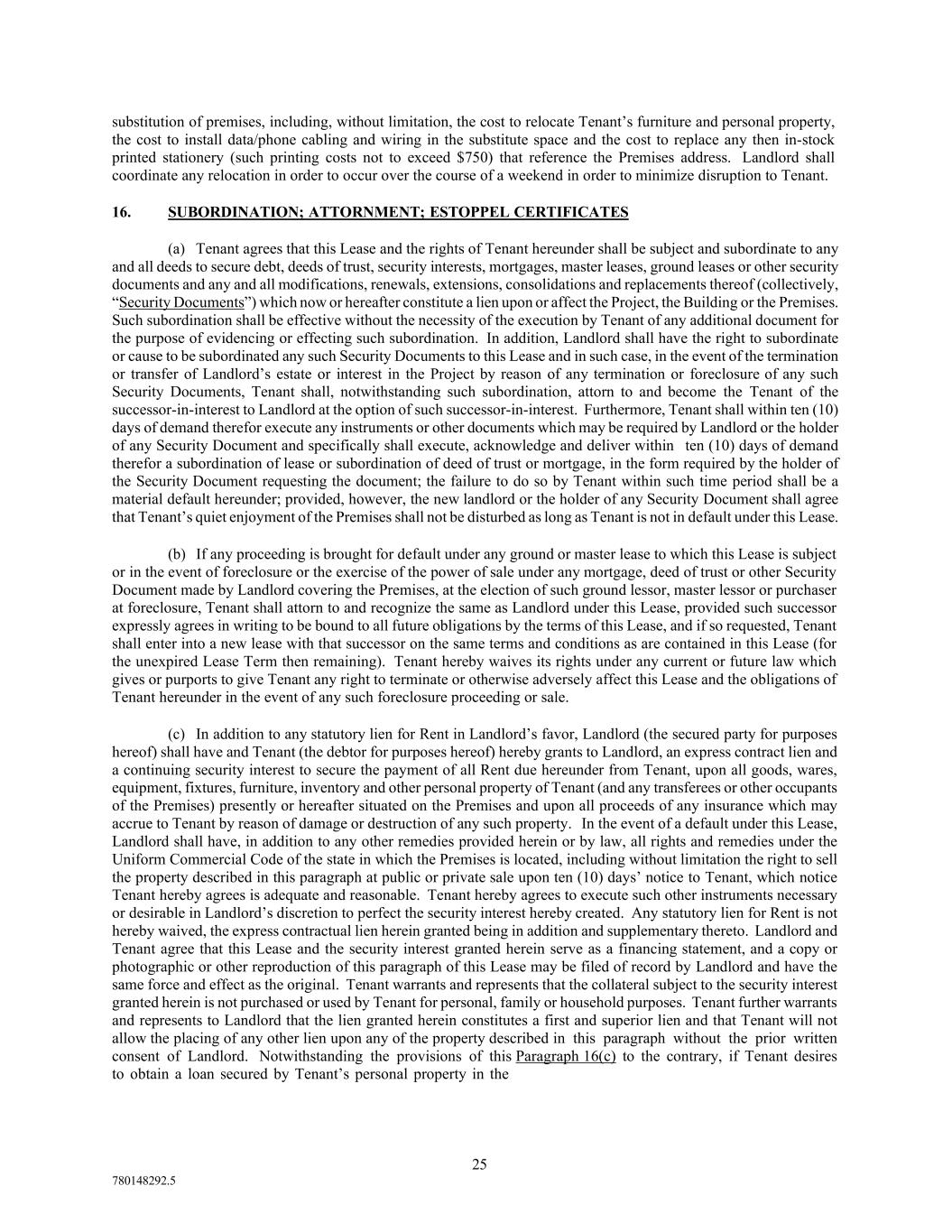 25 780148292.5 substitution of premises, including, without limitation, the cost to relocate Tenant’s furniture and personal property, the cost to install data/phone cabling and wiring in the substitute space and the cost to replace any then in-stock printed stationery (such printing costs not to exceed $750) that reference the Premises address. Landlord shall coordinate any relocation in order to occur over the course of a weekend in order to minimize disruption to Tenant. 16. SUBORDINATION; ATTORNMENT; ESTOPPEL CERTIFICATES (a) Tenant agrees that this Lease and the rights of Tenant hereunder shall be subject and subordinate to any and all deeds to secure debt, deeds of trust, security interests, mortgages, master leases, ground leases or other security documents and any and all modifications, renewals, extensions, consolidations and replacements thereof (collectively, “Security Documents”) which now or hereafter constitute a lien upon or affect the Project, the Building or the Premises. Such subordination shall be effective without the necessity of the execution by Tenant of any additional document for the purpose of evidencing or effecting such subordination. In addition, Landlord shall have the right to subordinate or cause to be subordinated any such Security Documents to this Lease and in such case, in the event of the termination or transfer of Landlord’s estate or interest in the Project by reason of any termination or foreclosure of any such Security Documents, Tenant shall, notwithstanding such subordination, attorn to and become the Tenant of the successor-in-interest to Landlord at the option of such successor-in-interest. Furthermore, Tenant shall within ten (10) days of demand therefor execute any instruments or other documents which may be required by Landlord or the holder of any Security Document and specifically shall execute, acknowledge and deliver within ten (10) days of demand therefor a subordination of lease or subordination of deed of trust or mortgage, in the form required by the holder of the Security Document requesting the document; the failure to do so by Tenant within such time period shall be a material default hereunder; provided, however, the new landlord or the holder of any Security Document shall agree that Tenant’s quiet enjoyment of the Premises shall not be disturbed as long as Tenant is not in default under this Lease. (b) If any proceeding is brought for default under any ground or master lease to which this Lease is subject or in the event of foreclosure or the exercise of the power of sale under any mortgage, deed of trust or other Security Document made by Landlord covering the Premises, at the election of such ground lessor, master lessor or purchaser at foreclosure, Tenant shall attorn to and recognize the same as Landlord under this Lease, provided such successor expressly agrees in writing to be bound to all future obligations by the terms of this Lease, and if so requested, Tenant shall enter into a new lease with that successor on the same terms and conditions as are contained in this Lease (for the unexpired Lease Term then remaining). Tenant hereby waives its rights under any current or future law which gives or purports to give Tenant any right to terminate or otherwise adversely affect this Lease and the obligations of Tenant hereunder in the event of any such foreclosure proceeding or sale. (c) In addition to any statutory lien for Rent in Landlord’s favor, Landlord (the secured party for purposes hereof) shall have and Tenant (the debtor for purposes hereof) hereby grants to Landlord, an express contract lien and a continuing security interest to secure the payment of all Rent due hereunder from Tenant, upon all goods, wares, equipment, fixtures, furniture, inventory and other personal property of Tenant (and any transferees or other occupants of the Premises) presently or hereafter situated on the Premises and upon all proceeds of any insurance which may accrue to Tenant by reason of damage or destruction of any such property. In the event of a default under this Lease, Landlord shall have, in addition to any other remedies provided herein or by law, all rights and remedies under the Uniform Commercial Code of the state in which the Premises is located, including without limitation the right to sell the property described in this paragraph at public or private sale upon ten (10) days’ notice to Tenant, which notice Tenant hereby agrees is adequate and reasonable. Tenant hereby agrees to execute such other instruments necessary or desirable in Landlord’s discretion to perfect the security interest hereby created. Any statutory lien for Rent is not hereby waived, the express contractual lien herein granted being in addition and supplementary thereto. Landlord and Tenant agree that this Lease and the security interest granted herein serve as a financing statement, and a copy or photographic or other reproduction of this paragraph of this Lease may be filed of record by Landlord and have the same force and effect as the original. Tenant warrants and represents that the collateral subject to the security interest granted herein is not purchased or used by Tenant for personal, family or household purposes. Tenant further warrants and represents to Landlord that the lien granted herein constitutes a first and superior lien and that Tenant will not allow the placing of any other lien upon any of the property described in this paragraph without the prior written consent of Landlord. Notwithstanding the provisions of this Paragraph 16(c) to the contrary, if Tenant desires to obtain a loan secured by Tenant’s personal property in the