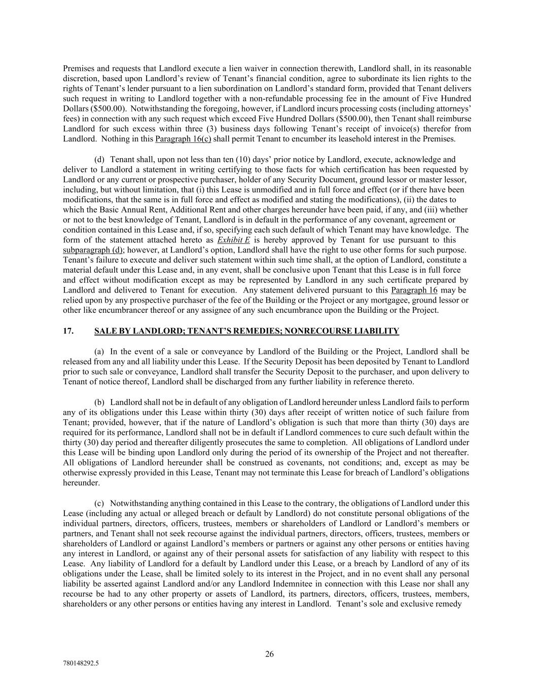 26 780148292.5 Premises and requests that Landlord execute a lien waiver in connection therewith, Landlord shall, in its reasonable discretion, based upon Landlord’s review of Tenant’s financial condition, agree to subordinate its lien rights to the rights of Tenant’s lender pursuant to a lien subordination on Landlord’s standard form, provided that Tenant delivers such request in writing to Landlord together with a non-refundable processing fee in the amount of Five Hundred Dollars ($500.00). Notwithstanding the foregoing, however, if Landlord incurs processing costs (including attorneys’ fees) in connection with any such request which exceed Five Hundred Dollars ($500.00), then Tenant shall reimburse Landlord for such excess within three (3) business days following Tenant’s receipt of invoice(s) therefor from Landlord. Nothing in this Paragraph 16(c) shall permit Tenant to encumber its leasehold interest in the Premises. (d) Tenant shall, upon not less than ten (10) days’ prior notice by Landlord, execute, acknowledge and deliver to Landlord a statement in writing certifying to those facts for which certification has been requested by Landlord or any current or prospective purchaser, holder of any Security Document, ground lessor or master lessor, including, but without limitation, that (i) this Lease is unmodified and in full force and effect (or if there have been modifications, that the same is in full force and effect as modified and stating the modifications), (ii) the dates to which the Basic Annual Rent, Additional Rent and other charges hereunder have been paid, if any, and (iii) whether or not to the best knowledge of Tenant, Landlord is in default in the performance of any covenant, agreement or condition contained in this Lease and, if so, specifying each such default of which Tenant may have knowledge. The form of the statement attached hereto as Exhibit E is hereby approved by Tenant for use pursuant to this subparagraph (d); however, at Landlord’s option, Landlord shall have the right to use other forms for such purpose. Tenant’s failure to execute and deliver such statement within such time shall, at the option of Landlord, constitute a material default under this Lease and, in any event, shall be conclusive upon Tenant that this Lease is in full force and effect without modification except as may be represented by Landlord in any such certificate prepared by Landlord and delivered to Tenant for execution. Any statement delivered pursuant to this Paragraph 16 may be relied upon by any prospective purchaser of the fee of the Building or the Project or any mortgagee, ground lessor or other like encumbrancer thereof or any assignee of any such encumbrance upon the Building or the Project. 17. SALE BY LANDLORD; TENANT’S REMEDIES; NONRECOURSE LIABILITY (a) In the event of a sale or conveyance by Landlord of the Building or the Project, Landlord shall be released from any and all liability under this Lease. If the Security Deposit has been deposited by Tenant to Landlord prior to such sale or conveyance, Landlord shall transfer the Security Deposit to the purchaser, and upon delivery to Tenant of notice thereof, Landlord shall be discharged from any further liability in reference thereto. (b) Landlord shall not be in default of any obligation of Landlord hereunder unless Landlord fails to perform any of its obligations under this Lease within thirty (30) days after receipt of written notice of such failure from Tenant; provided, however, that if the nature of Landlord’s obligation is such that more than thirty (30) days are required for its performance, Landlord shall not be in default if Landlord commences to cure such default within the thirty (30) day period and thereafter diligently prosecutes the same to completion. All obligations of Landlord under this Lease will be binding upon Landlord only during the period of its ownership of the Project and not thereafter. All obligations of Landlord hereunder shall be construed as covenants, not conditions; and, except as may be otherwise expressly provided in this Lease, Tenant may not terminate this Lease for breach of Landlord’s obligations hereunder. (c) Notwithstanding anything contained in this Lease to the contrary, the obligations of Landlord under this Lease (including any actual or alleged breach or default by Landlord) do not constitute personal obligations of the individual partners, directors, officers, trustees, members or shareholders of Landlord or Landlord’s members or partners, and Tenant shall not seek recourse against the individual partners, directors, officers, trustees, members or shareholders of Landlord or against Landlord’s members or partners or against any other persons or entities having any interest in Landlord, or against any of their personal assets for satisfaction of any liability with respect to this Lease. Any liability of Landlord for a default by Landlord under this Lease, or a breach by Landlord of any of its obligations under the Lease, shall be limited solely to its interest in the Project, and in no event shall any personal liability be asserted against Landlord and/or any Landlord Indemnitee in connection with this Lease nor shall any recourse be had to any other property or assets of Landlord, its partners, directors, officers, trustees, members, shareholders or any other persons or entities having any interest in Landlord. Tenant’s sole and exclusive remedy