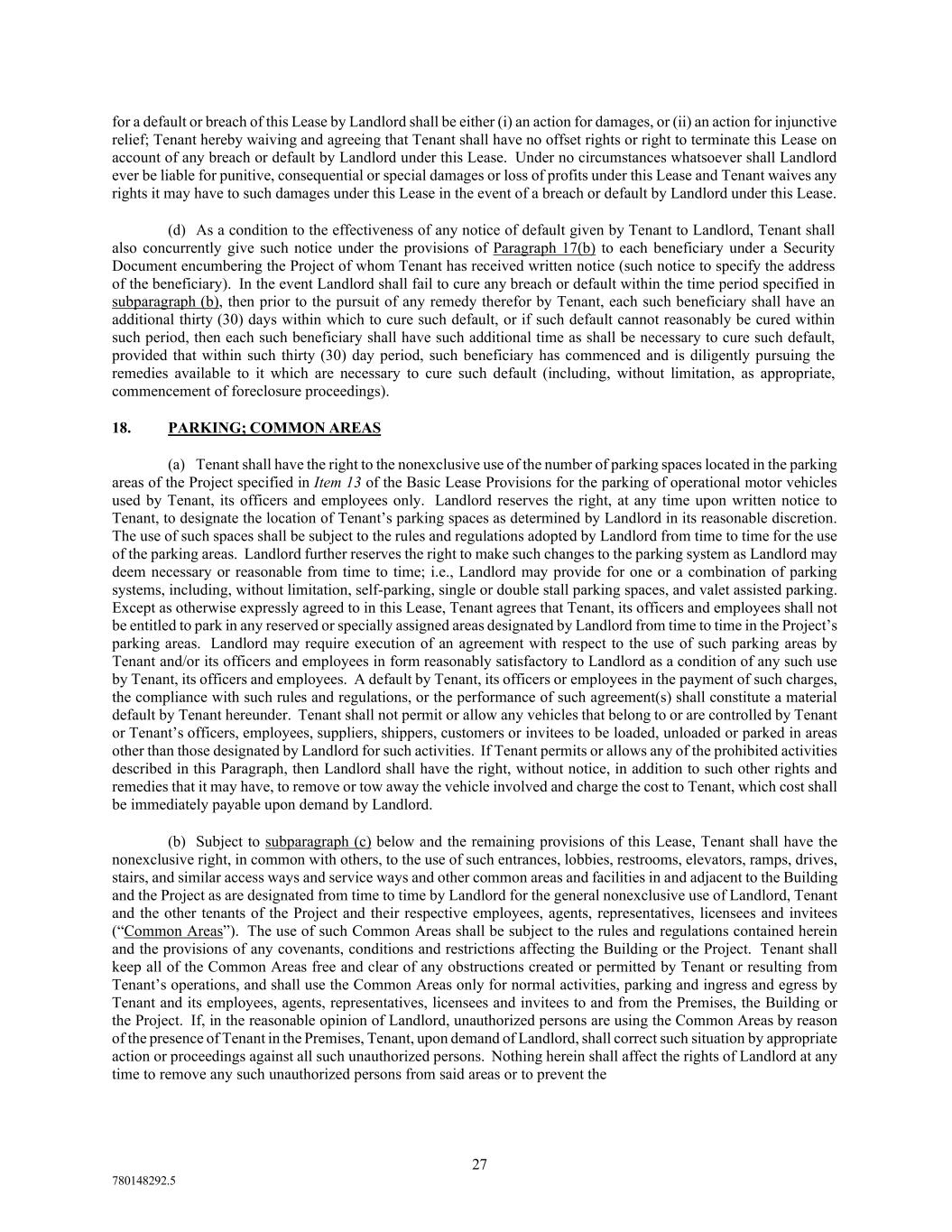 27 780148292.5 for a default or breach of this Lease by Landlord shall be either (i) an action for damages, or (ii) an action for injunctive relief; Tenant hereby waiving and agreeing that Tenant shall have no offset rights or right to terminate this Lease on account of any breach or default by Landlord under this Lease. Under no circumstances whatsoever shall Landlord ever be liable for punitive, consequential or special damages or loss of profits under this Lease and Tenant waives any rights it may have to such damages under this Lease in the event of a breach or default by Landlord under this Lease. (d) As a condition to the effectiveness of any notice of default given by Tenant to Landlord, Tenant shall also concurrently give such notice under the provisions of Paragraph 17(b) to each beneficiary under a Security Document encumbering the Project of whom Tenant has received written notice (such notice to specify the address of the beneficiary). In the event Landlord shall fail to cure any breach or default within the time period specified in subparagraph (b), then prior to the pursuit of any remedy therefor by Tenant, each such beneficiary shall have an additional thirty (30) days within which to cure such default, or if such default cannot reasonably be cured within such period, then each such beneficiary shall have such additional time as shall be necessary to cure such default, provided that within such thirty (30) day period, such beneficiary has commenced and is diligently pursuing the remedies available to it which are necessary to cure such default (including, without limitation, as appropriate, commencement of foreclosure proceedings). 18. PARKING; COMMON AREAS (a) Tenant shall have the right to the nonexclusive use of the number of parking spaces located in the parking areas of the Project specified in Item 13 of the Basic Lease Provisions for the parking of operational motor vehicles used by Tenant, its officers and employees only. Landlord reserves the right, at any time upon written notice to Tenant, to designate the location of Tenant’s parking spaces as determined by Landlord in its reasonable discretion. The use of such spaces shall be subject to the rules and regulations adopted by Landlord from time to time for the use of the parking areas. Landlord further reserves the right to make such changes to the parking system as Landlord may deem necessary or reasonable from time to time; i.e., Landlord may provide for one or a combination of parking systems, including, without limitation, self-parking, single or double stall parking spaces, and valet assisted parking. Except as otherwise expressly agreed to in this Lease, Tenant agrees that Tenant, its officers and employees shall not be entitled to park in any reserved or specially assigned areas designated by Landlord from time to time in the Project’s parking areas. Landlord may require execution of an agreement with respect to the use of such parking areas by Tenant and/or its officers and employees in form reasonably satisfactory to Landlord as a condition of any such use by Tenant, its officers and employees. A default by Tenant, its officers or employees in the payment of such charges, the compliance with such rules and regulations, or the performance of such agreement(s) shall constitute a material default by Tenant hereunder. Tenant shall not permit or allow any vehicles that belong to or are controlled by Tenant or Tenant’s officers, employees, suppliers, shippers, customers or invitees to be loaded, unloaded or parked in areas other than those designated by Landlord for such activities. If Tenant permits or allows any of the prohibited activities described in this Paragraph, then Landlord shall have the right, without notice, in addition to such other rights and remedies that it may have, to remove or tow away the vehicle involved and charge the cost to Tenant, which cost shall be immediately payable upon demand by Landlord. (b) Subject to subparagraph (c) below and the remaining provisions of this Lease, Tenant shall have the nonexclusive right, in common with others, to the use of such entrances, lobbies, restrooms, elevators, ramps, drives, stairs, and similar access ways and service ways and other common areas and facilities in and adjacent to the Building and the Project as are designated from time to time by Landlord for the general nonexclusive use of Landlord, Tenant and the other tenants of the Project and their respective employees, agents, representatives, licensees and invitees (“Common Areas”). The use of such Common Areas shall be subject to the rules and regulations contained herein and the provisions of any covenants, conditions and restrictions affecting the Building or the Project. Tenant shall keep all of the Common Areas free and clear of any obstructions created or permitted by Tenant or resulting from Tenant’s operations, and shall use the Common Areas only for normal activities, parking and ingress and egress by Tenant and its employees, agents, representatives, licensees and invitees to and from the Premises, the Building or the Project. If, in the reasonable opinion of Landlord, unauthorized persons are using the Common Areas by reason of the presence of Tenant in the Premises, Tenant, upon demand of Landlord, shall correct such situation by appropriate action or proceedings against all such unauthorized persons. Nothing herein shall affect the rights of Landlord at any time to remove any such unauthorized persons from said areas or to prevent the