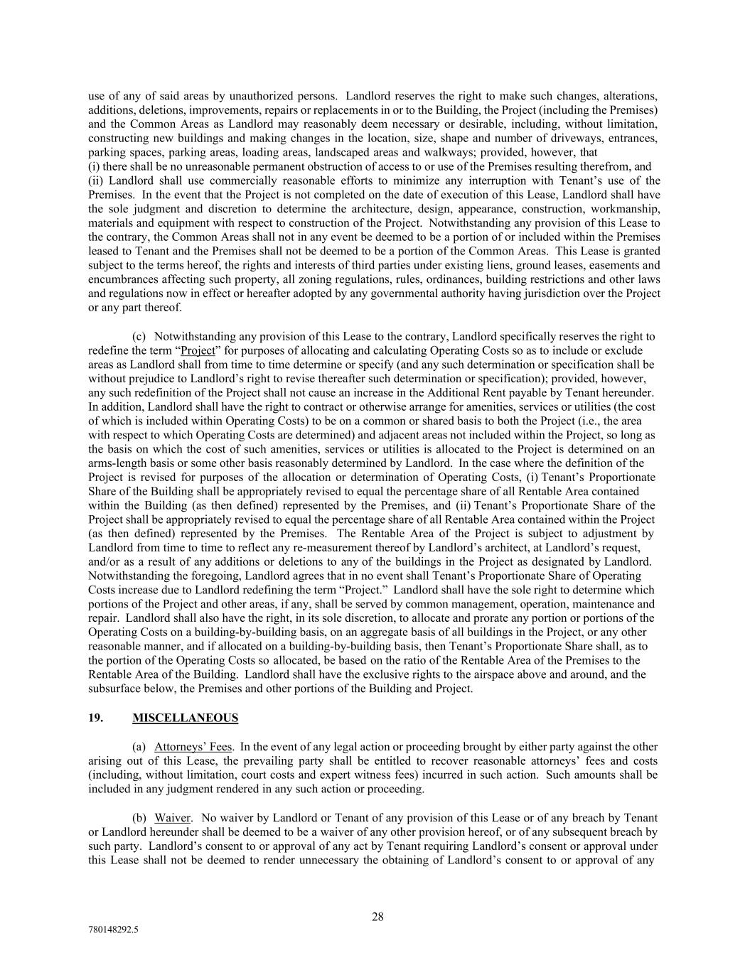 28 780148292.5 use of any of said areas by unauthorized persons. Landlord reserves the right to make such changes, alterations, additions, deletions, improvements, repairs or replacements in or to the Building, the Project (including the Premises) and the Common Areas as Landlord may reasonably deem necessary or desirable, including, without limitation, constructing new buildings and making changes in the location, size, shape and number of driveways, entrances, parking spaces, parking areas, loading areas, landscaped areas and walkways; provided, however, that (i) there shall be no unreasonable permanent obstruction of access to or use of the Premises resulting therefrom, and (ii) Landlord shall use commercially reasonable efforts to minimize any interruption with Tenant’s use of the Premises. In the event that the Project is not completed on the date of execution of this Lease, Landlord shall have the sole judgment and discretion to determine the architecture, design, appearance, construction, workmanship, materials and equipment with respect to construction of the Project. Notwithstanding any provision of this Lease to the contrary, the Common Areas shall not in any event be deemed to be a portion of or included within the Premises leased to Tenant and the Premises shall not be deemed to be a portion of the Common Areas. This Lease is granted subject to the terms hereof, the rights and interests of third parties under existing liens, ground leases, easements and encumbrances affecting such property, all zoning regulations, rules, ordinances, building restrictions and other laws and regulations now in effect or hereafter adopted by any governmental authority having jurisdiction over the Project or any part thereof. (c) Notwithstanding any provision of this Lease to the contrary, Landlord specifically reserves the right to redefine the term “Project” for purposes of allocating and calculating Operating Costs so as to include or exclude areas as Landlord shall from time to time determine or specify (and any such determination or specification shall be without prejudice to Landlord’s right to revise thereafter such determination or specification); provided, however, any such redefinition of the Project shall not cause an increase in the Additional Rent payable by Tenant hereunder. In addition, Landlord shall have the right to contract or otherwise arrange for amenities, services or utilities (the cost of which is included within Operating Costs) to be on a common or shared basis to both the Project (i.e., the area with respect to which Operating Costs are determined) and adjacent areas not included within the Project, so long as the basis on which the cost of such amenities, services or utilities is allocated to the Project is determined on an arms-length basis or some other basis reasonably determined by Landlord. In the case where the definition of the Project is revised for purposes of the allocation or determination of Operating Costs, (i) Tenant’s Proportionate Share of the Building shall be appropriately revised to equal the percentage share of all Rentable Area contained within the Building (as then defined) represented by the Premises, and (ii) Tenant’s Proportionate Share of the Project shall be appropriately revised to equal the percentage share of all Rentable Area contained within the Project (as then defined) represented by the Premises. The Rentable Area of the Project is subject to adjustment by Landlord from time to time to reflect any re-measurement thereof by Landlord’s architect, at Landlord’s request, and/or as a result of any additions or deletions to any of the buildings in the Project as designated by Landlord. Notwithstanding the foregoing, Landlord agrees that in no event shall Tenant’s Proportionate Share of Operating Costs increase due to Landlord redefining the term “Project.” Landlord shall have the sole right to determine which portions of the Project and other areas, if any, shall be served by common management, operation, maintenance and repair. Landlord shall also have the right, in its sole discretion, to allocate and prorate any portion or portions of the Operating Costs on a building-by-building basis, on an aggregate basis of all buildings in the Project, or any other reasonable manner, and if allocated on a building-by-building basis, then Tenant’s Proportionate Share shall, as to the portion of the Operating Costs so allocated, be based on the ratio of the Rentable Area of the Premises to the Rentable Area of the Building. Landlord shall have the exclusive rights to the airspace above and around, and the subsurface below, the Premises and other portions of the Building and Project. 19. MISCELLANEOUS (a) Attorneys’ Fees. In the event of any legal action or proceeding brought by either party against the other arising out of this Lease, the prevailing party shall be entitled to recover reasonable attorneys’ fees and costs (including, without limitation, court costs and expert witness fees) incurred in such action. Such amounts shall be included in any judgment rendered in any such action or proceeding. (b) Waiver. No waiver by Landlord or Tenant of any provision of this Lease or of any breach by Tenant or Landlord hereunder shall be deemed to be a waiver of any other provision hereof, or of any subsequent breach by such party. Landlord’s consent to or approval of any act by Tenant requiring Landlord’s consent or approval under this Lease shall not be deemed to render unnecessary the obtaining of Landlord’s consent to or approval of any