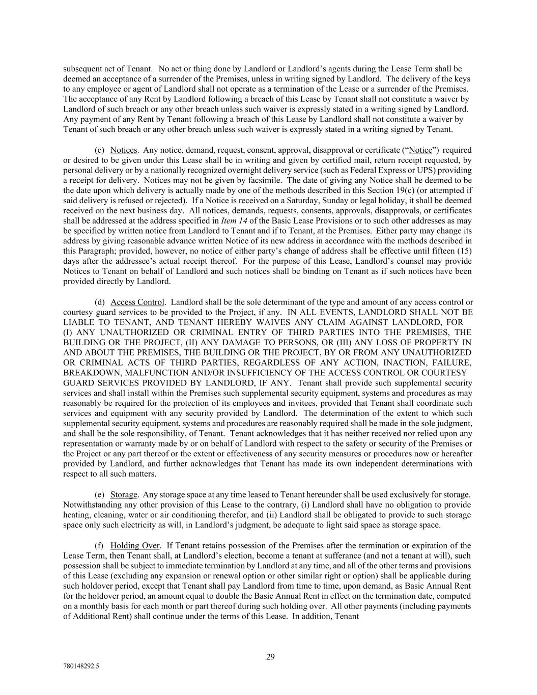 29 780148292.5 subsequent act of Tenant. No act or thing done by Landlord or Landlord’s agents during the Lease Term shall be deemed an acceptance of a surrender of the Premises, unless in writing signed by Landlord. The delivery of the keys to any employee or agent of Landlord shall not operate as a termination of the Lease or a surrender of the Premises. The acceptance of any Rent by Landlord following a breach of this Lease by Tenant shall not constitute a waiver by Landlord of such breach or any other breach unless such waiver is expressly stated in a writing signed by Landlord. Any payment of any Rent by Tenant following a breach of this Lease by Landlord shall not constitute a waiver by Tenant of such breach or any other breach unless such waiver is expressly stated in a writing signed by Tenant. (c) Notices. Any notice, demand, request, consent, approval, disapproval or certificate (“Notice”) required or desired to be given under this Lease shall be in writing and given by certified mail, return receipt requested, by personal delivery or by a nationally recognized overnight delivery service (such as Federal Express or UPS) providing a receipt for delivery. Notices may not be given by facsimile. The date of giving any Notice shall be deemed to be the date upon which delivery is actually made by one of the methods described in this Section 19(c) (or attempted if said delivery is refused or rejected). If a Notice is received on a Saturday, Sunday or legal holiday, it shall be deemed received on the next business day. All notices, demands, requests, consents, approvals, disapprovals, or certificates shall be addressed at the address specified in Item 14 of the Basic Lease Provisions or to such other addresses as may be specified by written notice from Landlord to Tenant and if to Tenant, at the Premises. Either party may change its address by giving reasonable advance written Notice of its new address in accordance with the methods described in this Paragraph; provided, however, no notice of either party’s change of address shall be effective until fifteen (15) days after the addressee’s actual receipt thereof. For the purpose of this Lease, Landlord’s counsel may provide Notices to Tenant on behalf of Landlord and such notices shall be binding on Tenant as if such notices have been provided directly by Landlord. (d) Access Control. Landlord shall be the sole determinant of the type and amount of any access control or courtesy guard services to be provided to the Project, if any. IN ALL EVENTS, LANDLORD SHALL NOT BE LIABLE TO TENANT, AND TENANT HEREBY WAIVES ANY CLAIM AGAINST LANDLORD, FOR (I) ANY UNAUTHORIZED OR CRIMINAL ENTRY OF THIRD PARTIES INTO THE PREMISES, THE BUILDING OR THE PROJECT, (II) ANY DAMAGE TO PERSONS, OR (III) ANY LOSS OF PROPERTY IN AND ABOUT THE PREMISES, THE BUILDING OR THE PROJECT, BY OR FROM ANY UNAUTHORIZED OR CRIMINAL ACTS OF THIRD PARTIES, REGARDLESS OF ANY ACTION, INACTION, FAILURE, BREAKDOWN, MALFUNCTION AND/OR INSUFFICIENCY OF THE ACCESS CONTROL OR COURTESY GUARD SERVICES PROVIDED BY LANDLORD, IF ANY. Tenant shall provide such supplemental security services and shall install within the Premises such supplemental security equipment, systems and procedures as may reasonably be required for the protection of its employees and invitees, provided that Tenant shall coordinate such services and equipment with any security provided by Landlord. The determination of the extent to which such supplemental security equipment, systems and procedures are reasonably required shall be made in the sole judgment, and shall be the sole responsibility, of Tenant. Tenant acknowledges that it has neither received nor relied upon any representation or warranty made by or on behalf of Landlord with respect to the safety or security of the Premises or the Project or any part thereof or the extent or effectiveness of any security measures or procedures now or hereafter provided by Landlord, and further acknowledges that Tenant has made its own independent determinations with respect to all such matters. (e) Storage. Any storage space at any time leased to Tenant hereunder shall be used exclusively for storage. Notwithstanding any other provision of this Lease to the contrary, (i) Landlord shall have no obligation to provide heating, cleaning, water or air conditioning therefor, and (ii) Landlord shall be obligated to provide to such storage space only such electricity as will, in Landlord’s judgment, be adequate to light said space as storage space. (f) Holding Over. If Tenant retains possession of the Premises after the termination or expiration of the Lease Term, then Tenant shall, at Landlord’s election, become a tenant at sufferance (and not a tenant at will), such possession shall be subject to immediate termination by Landlord at any time, and all of the other terms and provisions of this Lease (excluding any expansion or renewal option or other similar right or option) shall be applicable during such holdover period, except that Tenant shall pay Landlord from time to time, upon demand, as Basic Annual Rent for the holdover period, an amount equal to double the Basic Annual Rent in effect on the termination date, computed on a monthly basis for each month or part thereof during such holding over. All other payments (including payments of Additional Rent) shall continue under the terms of this Lease. In addition, Tenant