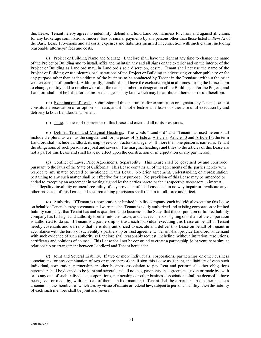 31 780148292.5 this Lease. Tenant hereby agrees to indemnify, defend and hold Landlord harmless for, from and against all claims for any brokerage commissions, finders’ fees or similar payments by any persons other than those listed in Item 12 of the Basic Lease Provisions and all costs, expenses and liabilities incurred in connection with such claims, including reasonable attorneys’ fees and costs. (l) Project or Building Name and Signage. Landlord shall have the right at any time to change the name of the Project or Building and to install, affix and maintain any and all signs on the exterior and on the interior of the Project or Building as Landlord may, in Landlord’s sole discretion, desire. Tenant shall not use the name of the Project or Building or use pictures or illustrations of the Project or Building in advertising or other publicity or for any purpose other than as the address of the business to be conducted by Tenant in the Premises, without the prior written consent of Landlord. Additionally, Landlord shall have the exclusive right at all times during the Lease Term to change, modify, add to or otherwise alter the name, number, or designation of the Building and/or the Project, and Landlord shall not be liable for claims or damages of any kind which may be attributed thereto or result therefrom. (m) Examination of Lease. Submission of this instrument for examination or signature by Tenant does not constitute a reservation of or option for lease, and it is not effective as a lease or otherwise until execution by and delivery to both Landlord and Tenant. (n) Time. Time is of the essence of this Lease and each and all of its provisions. (o) Defined Terms and Marginal Headings. The words “Landlord” and “Tenant” as used herein shall include the plural as well as the singular and for purposes of Article 5, Article 7, Article 13 and Article 18, the term Landlord shall include Landlord, its employees, contractors and agents. If more than one person is named as Tenant the obligations of such persons are joint and several. The marginal headings and titles to the articles of this Lease are not a part of this Lease and shall have no effect upon the construction or interpretation of any part hereof. (p) Conflict of Laws; Prior Agreements; Separability. This Lease shall be governed by and construed pursuant to the laws of the State of California. This Lease contains all of the agreements of the parties hereto with respect to any matter covered or mentioned in this Lease. No prior agreement, understanding or representation pertaining to any such matter shall be effective for any purpose. No provision of this Lease may be amended or added to except by an agreement in writing signed by the parties hereto or their respective successors in interest. The illegality, invalidity or unenforceability of any provision of this Lease shall in no way impair or invalidate any other provision of this Lease, and such remaining provisions shall remain in full force and effect. (q) Authority. If Tenant is a corporation or limited liability company, each individual executing this Lease on behalf of Tenant hereby covenants and warrants that Tenant is a duly authorized and existing corporation or limited liability company, that Tenant has and is qualified to do business in the State, that the corporation or limited liability company has full right and authority to enter into this Lease, and that each person signing on behalf of the corporation is authorized to do so. If Tenant is a partnership or trust, each individual executing this Lease on behalf of Tenant hereby covenants and warrants that he is duly authorized to execute and deliver this Lease on behalf of Tenant in accordance with the terms of such entity’s partnership or trust agreement. Tenant shall provide Landlord on demand with such evidence of such authority as Landlord shall reasonably request, including, without limitation, resolutions, certificates and opinions of counsel. This Lease shall not be construed to create a partnership, joint venture or similar relationship or arrangement between Landlord and Tenant hereunder. (r) Joint and Several Liability. If two or more individuals, corporations, partnerships or other business associations (or any combination of two or more thereof) shall sign this Lease as Tenant, the liability of each such individual, corporation, partnership or other business association to pay Rent and perform all other obligations hereunder shall be deemed to be joint and several, and all notices, payments and agreements given or made by, with or to any one of such individuals, corporations, partnerships or other business associations shall be deemed to have been given or made by, with or to all of them. In like manner, if Tenant shall be a partnership or other business association, the members of which are, by virtue of statute or federal law, subject to personal liability, then the liability of each such member shall be joint and several.