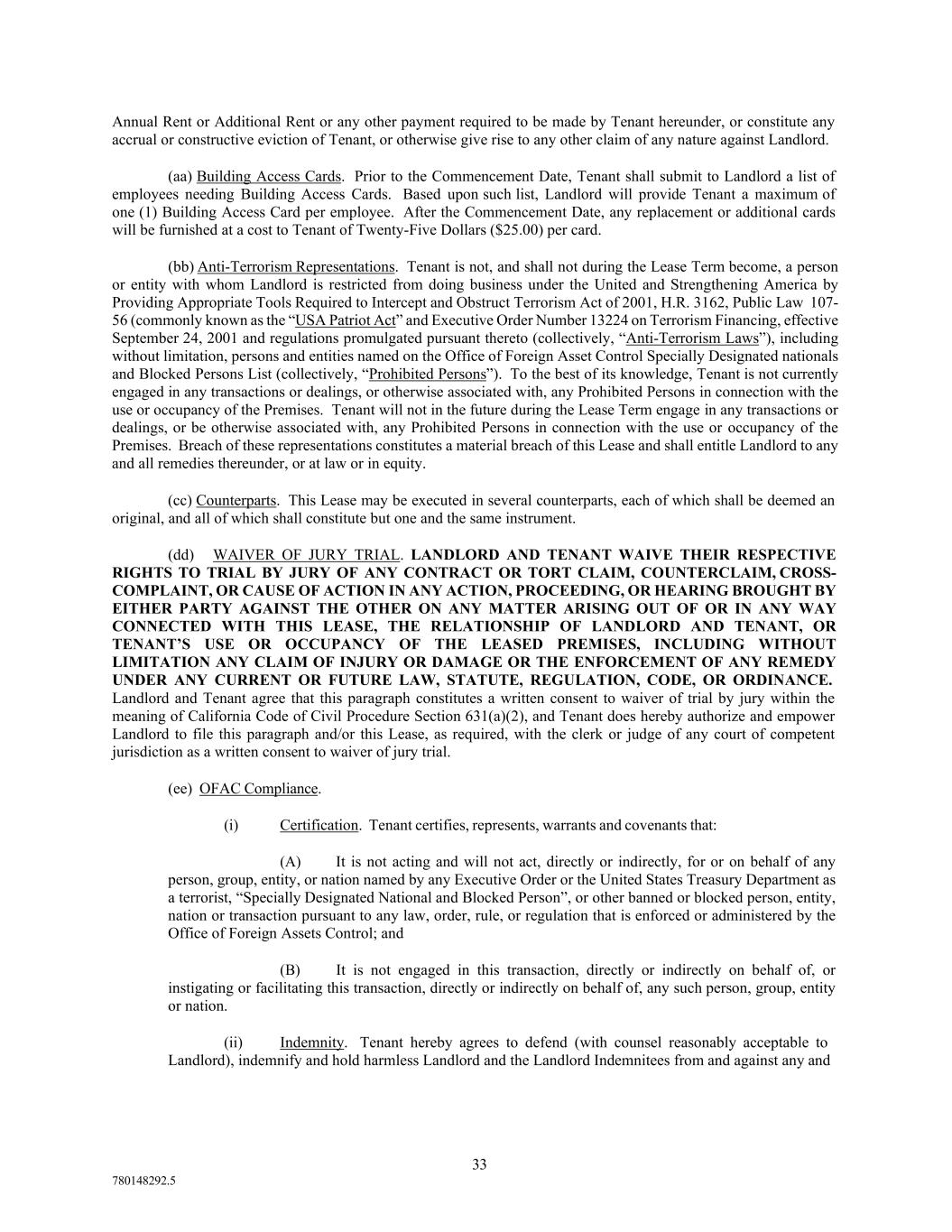 33 780148292.5 Annual Rent or Additional Rent or any other payment required to be made by Tenant hereunder, or constitute any accrual or constructive eviction of Tenant, or otherwise give rise to any other claim of any nature against Landlord. (aa) Building Access Cards. Prior to the Commencement Date, Tenant shall submit to Landlord a list of employees needing Building Access Cards. Based upon such list, Landlord will provide Tenant a maximum of one (1) Building Access Card per employee. After the Commencement Date, any replacement or additional cards will be furnished at a cost to Tenant of Twenty-Five Dollars ($25.00) per card. (bb) Anti-Terrorism Representations. Tenant is not, and shall not during the Lease Term become, a person or entity with whom Landlord is restricted from doing business under the United and Strengthening America by Providing Appropriate Tools Required to Intercept and Obstruct Terrorism Act of 2001, H.R. 3162, Public Law 107- 56 (commonly known as the “USA Patriot Act” and Executive Order Number 13224 on Terrorism Financing, effective September 24, 2001 and regulations promulgated pursuant thereto (collectively, “Anti-Terrorism Laws”), including without limitation, persons and entities named on the Office of Foreign Asset Control Specially Designated nationals and Blocked Persons List (collectively, “Prohibited Persons”). To the best of its knowledge, Tenant is not currently engaged in any transactions or dealings, or otherwise associated with, any Prohibited Persons in connection with the use or occupancy of the Premises. Tenant will not in the future during the Lease Term engage in any transactions or dealings, or be otherwise associated with, any Prohibited Persons in connection with the use or occupancy of the Premises. Breach of these representations constitutes a material breach of this Lease and shall entitle Landlord to any and all remedies thereunder, or at law or in equity. (cc) Counterparts. This Lease may be executed in several counterparts, each of which shall be deemed an original, and all of which shall constitute but one and the same instrument. (dd) WAIVER OF JURY TRIAL. LANDLORD AND TENANT WAIVE THEIR RESPECTIVE RIGHTS TO TRIAL BY JURY OF ANY CONTRACT OR TORT CLAIM, COUNTERCLAIM, CROSS- COMPLAINT, OR CAUSE OF ACTION IN ANY ACTION, PROCEEDING, OR HEARING BROUGHT BY EITHER PARTY AGAINST THE OTHER ON ANY MATTER ARISING OUT OF OR IN ANY WAY CONNECTED WITH THIS LEASE, THE RELATIONSHIP OF LANDLORD AND TENANT, OR TENANT’S USE OR OCCUPANCY OF THE LEASED PREMISES, INCLUDING WITHOUT LIMITATION ANY CLAIM OF INJURY OR DAMAGE OR THE ENFORCEMENT OF ANY REMEDY UNDER ANY CURRENT OR FUTURE LAW, STATUTE, REGULATION, CODE, OR ORDINANCE. Landlord and Tenant agree that this paragraph constitutes a written consent to waiver of trial by jury within the meaning of California Code of Civil Procedure Section 631(a)(2), and Tenant does hereby authorize and empower Landlord to file this paragraph and/or this Lease, as required, with the clerk or judge of any court of competent jurisdiction as a written consent to waiver of jury trial. (ee) OFAC Compliance. (i) Certification. Tenant certifies, represents, warrants and covenants that: (A) It is not acting and will not act, directly or indirectly, for or on behalf of any person, group, entity, or nation named by any Executive Order or the United States Treasury Department as a terrorist, “Specially Designated National and Blocked Person”, or other banned or blocked person, entity, nation or transaction pursuant to any law, order, rule, or regulation that is enforced or administered by the Office of Foreign Assets Control; and (B) It is not engaged in this transaction, directly or indirectly on behalf of, or instigating or facilitating this transaction, directly or indirectly on behalf of, any such person, group, entity or nation. (ii) Indemnity. Tenant hereby agrees to defend (with counsel reasonably acceptable to Landlord), indemnify and hold harmless Landlord and the Landlord Indemnitees from and against any and