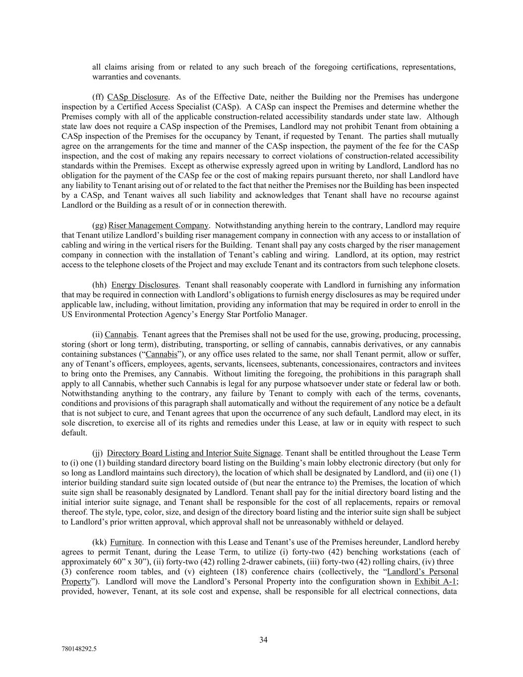34 780148292.5 all claims arising from or related to any such breach of the foregoing certifications, representations, warranties and covenants. (ff) CASp Disclosure. As of the Effective Date, neither the Building nor the Premises has undergone inspection by a Certified Access Specialist (CASp). A CASp can inspect the Premises and determine whether the Premises comply with all of the applicable construction-related accessibility standards under state law. Although state law does not require a CASp inspection of the Premises, Landlord may not prohibit Tenant from obtaining a CASp inspection of the Premises for the occupancy by Tenant, if requested by Tenant. The parties shall mutually agree on the arrangements for the time and manner of the CASp inspection, the payment of the fee for the CASp inspection, and the cost of making any repairs necessary to correct violations of construction-related accessibility standards within the Premises. Except as otherwise expressly agreed upon in writing by Landlord, Landlord has no obligation for the payment of the CASp fee or the cost of making repairs pursuant thereto, nor shall Landlord have any liability to Tenant arising out of or related to the fact that neither the Premises nor the Building has been inspected by a CASp, and Tenant waives all such liability and acknowledges that Tenant shall have no recourse against Landlord or the Building as a result of or in connection therewith. (gg) Riser Management Company. Notwithstanding anything herein to the contrary, Landlord may require that Tenant utilize Landlord’s building riser management company in connection with any access to or installation of cabling and wiring in the vertical risers for the Building. Tenant shall pay any costs charged by the riser management company in connection with the installation of Tenant’s cabling and wiring. Landlord, at its option, may restrict access to the telephone closets of the Project and may exclude Tenant and its contractors from such telephone closets. (hh) Energy Disclosures. Tenant shall reasonably cooperate with Landlord in furnishing any information that may be required in connection with Landlord’s obligations to furnish energy disclosures as may be required under applicable law, including, without limitation, providing any information that may be required in order to enroll in the US Environmental Protection Agency’s Energy Star Portfolio Manager. (ii) Cannabis. Tenant agrees that the Premises shall not be used for the use, growing, producing, processing, storing (short or long term), distributing, transporting, or selling of cannabis, cannabis derivatives, or any cannabis containing substances (“Cannabis”), or any office uses related to the same, nor shall Tenant permit, allow or suffer, any of Tenant’s officers, employees, agents, servants, licensees, subtenants, concessionaires, contractors and invitees to bring onto the Premises, any Cannabis. Without limiting the foregoing, the prohibitions in this paragraph shall apply to all Cannabis, whether such Cannabis is legal for any purpose whatsoever under state or federal law or both. Notwithstanding anything to the contrary, any failure by Tenant to comply with each of the terms, covenants, conditions and provisions of this paragraph shall automatically and without the requirement of any notice be a default that is not subject to cure, and Tenant agrees that upon the occurrence of any such default, Landlord may elect, in its sole discretion, to exercise all of its rights and remedies under this Lease, at law or in equity with respect to such default. (jj) Directory Board Listing and Interior Suite Signage. Tenant shall be entitled throughout the Lease Term to (i) one (1) building standard directory board listing on the Building’s main lobby electronic directory (but only for so long as Landlord maintains such directory), the location of which shall be designated by Landlord, and (ii) one (1) interior building standard suite sign located outside of (but near the entrance to) the Premises, the location of which suite sign shall be reasonably designated by Landlord. Tenant shall pay for the initial directory board listing and the initial interior suite signage, and Tenant shall be responsible for the cost of all replacements, repairs or removal thereof. The style, type, color, size, and design of the directory board listing and the interior suite sign shall be subject to Landlord’s prior written approval, which approval shall not be unreasonably withheld or delayed. (kk) Furniture. In connection with this Lease and Tenant’s use of the Premises hereunder, Landlord hereby agrees to permit Tenant, during the Lease Term, to utilize (i) forty-two (42) benching workstations (each of approximately 60” x 30”), (ii) forty-two (42) rolling 2-drawer cabinets, (iii) forty-two (42) rolling chairs, (iv) three (3) conference room tables, and (v) eighteen (18) conference chairs (collectively, the “Landlord’s Personal Property”). Landlord will move the Landlord’s Personal Property into the configuration shown in Exhibit A-1; provided, however, Tenant, at its sole cost and expense, shall be responsible for all electrical connections, data