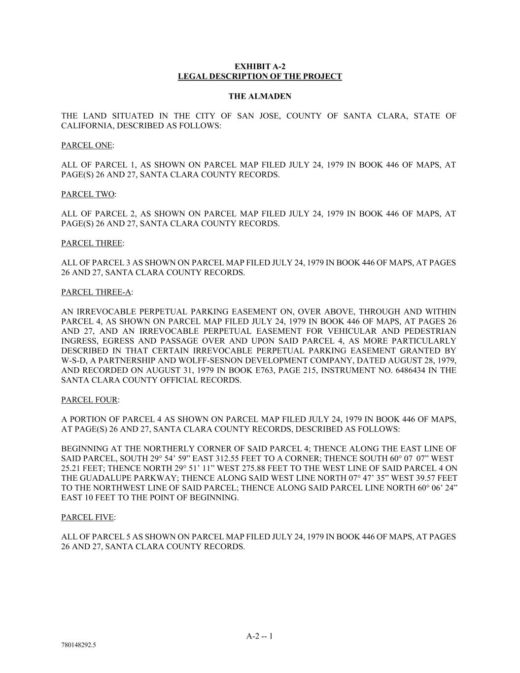 A-2 -- 1 780148292.5 EXHIBIT A-2 LEGAL DESCRIPTION OF THE PROJECT THE ALMADEN THE LAND SITUATED IN THE CITY OF SAN JOSE, COUNTY OF SANTA CLARA, STATE OF CALIFORNIA, DESCRIBED AS FOLLOWS: PARCEL ONE: ALL OF PARCEL 1, AS SHOWN ON PARCEL MAP FILED JULY 24, 1979 IN BOOK 446 OF MAPS, AT PAGE(S) 26 AND 27, SANTA CLARA COUNTY RECORDS. PARCEL TWO: ALL OF PARCEL 2, AS SHOWN ON PARCEL MAP FILED JULY 24, 1979 IN BOOK 446 OF MAPS, AT PAGE(S) 26 AND 27, SANTA CLARA COUNTY RECORDS. PARCEL THREE: ALL OF PARCEL 3 AS SHOWN ON PARCEL MAP FILED JULY 24, 1979 IN BOOK 446 OF MAPS, AT PAGES 26 AND 27, SANTA CLARA COUNTY RECORDS. PARCEL THREE-A: AN IRREVOCABLE PERPETUAL PARKING EASEMENT ON, OVER ABOVE, THROUGH AND WITHIN PARCEL 4, AS SHOWN ON PARCEL MAP FILED JULY 24, 1979 IN BOOK 446 OF MAPS, AT PAGES 26 AND 27, AND AN IRREVOCABLE PERPETUAL EASEMENT FOR VEHICULAR AND PEDESTRIAN INGRESS, EGRESS AND PASSAGE OVER AND UPON SAID PARCEL 4, AS MORE PARTICULARLY DESCRIBED IN THAT CERTAIN IRREVOCABLE PERPETUAL PARKING EASEMENT GRANTED BY W-S-D, A PARTNERSHIP AND WOLFF-SESNON DEVELOPMENT COMPANY, DATED AUGUST 28, 1979, AND RECORDED ON AUGUST 31, 1979 IN BOOK E763, PAGE 215, INSTRUMENT NO. 6486434 IN THE SANTA CLARA COUNTY OFFICIAL RECORDS. PARCEL FOUR: A PORTION OF PARCEL 4 AS SHOWN ON PARCEL MAP FILED JULY 24, 1979 IN BOOK 446 OF MAPS, AT PAGE(S) 26 AND 27, SANTA CLARA COUNTY RECORDS, DESCRIBED AS FOLLOWS: BEGINNING AT THE NORTHERLY CORNER OF SAID PARCEL 4; THENCE ALONG THE EAST LINE OF SAID PARCEL, SOUTH 29° 54’ 59” EAST 312.55 FEET TO A CORNER; THENCE SOUTH 60° 07 07” WEST 25.21 FEET; THENCE NORTH 29° 51’ 11” WEST 275.88 FEET TO THE WEST LINE OF SAID PARCEL 4 ON THE GUADALUPE PARKWAY; THENCE ALONG SAID WEST LINE NORTH 07° 47’ 35” WEST 39.57 FEET TO THE NORTHWEST LINE OF SAID PARCEL; THENCE ALONG SAID PARCEL LINE NORTH 60° 06’ 24” EAST 10 FEET TO THE POINT OF BEGINNING. PARCEL FIVE: ALL OF PARCEL 5 AS SHOWN ON PARCEL MAP FILED JULY 24, 1979 IN BOOK 446 OF MAPS, AT PAGES 26 AND 27, SANTA CLARA COUNTY RECORDS.