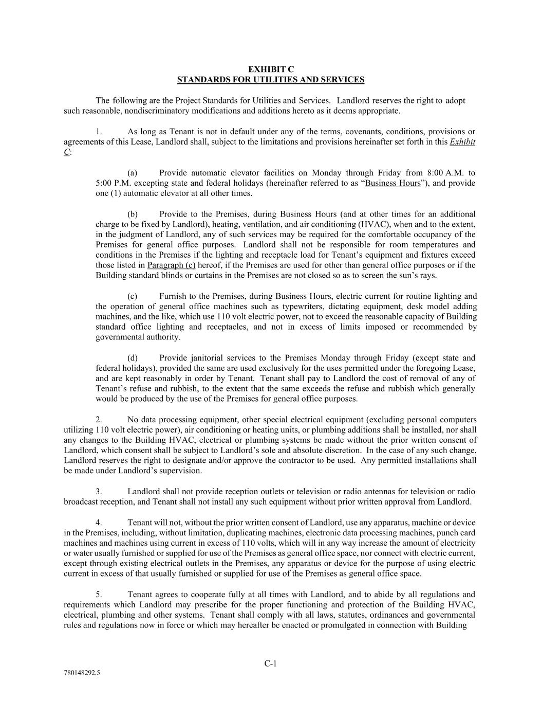 C-1 780148292.5 EXHIBIT C STANDARDS FOR UTILITIES AND SERVICES The following are the Project Standards for Utilities and Services. Landlord reserves the right to adopt such reasonable, nondiscriminatory modifications and additions hereto as it deems appropriate. 1. As long as Tenant is not in default under any of the terms, covenants, conditions, provisions or agreements of this Lease, Landlord shall, subject to the limitations and provisions hereinafter set forth in this Exhibit C: (a) Provide automatic elevator facilities on Monday through Friday from 8:00 A.M. to 5:00 P.M. excepting state and federal holidays (hereinafter referred to as “Business Hours”), and provide one (1) automatic elevator at all other times. (b) Provide to the Premises, during Business Hours (and at other times for an additional charge to be fixed by Landlord), heating, ventilation, and air conditioning (HVAC), when and to the extent, in the judgment of Landlord, any of such services may be required for the comfortable occupancy of the Premises for general office purposes. Landlord shall not be responsible for room temperatures and conditions in the Premises if the lighting and receptacle load for Tenant’s equipment and fixtures exceed those listed in Paragraph (c) hereof, if the Premises are used for other than general office purposes or if the Building standard blinds or curtains in the Premises are not closed so as to screen the sun’s rays. (c) Furnish to the Premises, during Business Hours, electric current for routine lighting and the operation of general office machines such as typewriters, dictating equipment, desk model adding machines, and the like, which use 110 volt electric power, not to exceed the reasonable capacity of Building standard office lighting and receptacles, and not in excess of limits imposed or recommended by governmental authority. (d) Provide janitorial services to the Premises Monday through Friday (except state and federal holidays), provided the same are used exclusively for the uses permitted under the foregoing Lease, and are kept reasonably in order by Tenant. Tenant shall pay to Landlord the cost of removal of any of Tenant’s refuse and rubbish, to the extent that the same exceeds the refuse and rubbish which generally would be produced by the use of the Premises for general office purposes. 2. No data processing equipment, other special electrical equipment (excluding personal computers utilizing 110 volt electric power), air conditioning or heating units, or plumbing additions shall be installed, nor shall any changes to the Building HVAC, electrical or plumbing systems be made without the prior written consent of Landlord, which consent shall be subject to Landlord’s sole and absolute discretion. In the case of any such change, Landlord reserves the right to designate and/or approve the contractor to be used. Any permitted installations shall be made under Landlord’s supervision. 3. Landlord shall not provide reception outlets or television or radio antennas for television or radio broadcast reception, and Tenant shall not install any such equipment without prior written approval from Landlord. 4. Tenant will not, without the prior written consent of Landlord, use any apparatus, machine or device in the Premises, including, without limitation, duplicating machines, electronic data processing machines, punch card machines and machines using current in excess of 110 volts, which will in any way increase the amount of electricity or water usually furnished or supplied for use of the Premises as general office space, nor connect with electric current, except through existing electrical outlets in the Premises, any apparatus or device for the purpose of using electric current in excess of that usually furnished or supplied for use of the Premises as general office space. 5. Tenant agrees to cooperate fully at all times with Landlord, and to abide by all regulations and requirements which Landlord may prescribe for the proper functioning and protection of the Building HVAC, electrical, plumbing and other systems. Tenant shall comply with all laws, statutes, ordinances and governmental rules and regulations now in force or which may hereafter be enacted or promulgated in connection with Building
