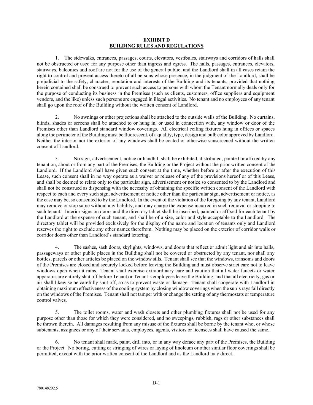 D-1 780148292.5 EXHIBIT D BUILDING RULES AND REGULATIONS 1. The sidewalks, entrances, passages, courts, elevators, vestibules, stairways and corridors of halls shall not be obstructed or used for any purpose other than ingress and egress. The halls, passages, entrances, elevators, stairways, balconies and roof are not for the use of the general public, and the Landlord shall in all cases retain the right to control and prevent access thereto of all persons whose presence, in the judgment of the Landlord, shall be prejudicial to the safety, character, reputation and interests of the Building and its tenants, provided that nothing herein contained shall be construed to prevent such access to persons with whom the Tenant normally deals only for the purpose of conducting its business in the Premises (such as clients, customers, office suppliers and equipment vendors, and the like) unless such persons are engaged in illegal activities. No tenant and no employees of any tenant shall go upon the roof of the Building without the written consent of Landlord. 2. No awnings or other projections shall be attached to the outside walls of the Building. No curtains, blinds, shades or screens shall be attached to or hung in, or used in connection with, any window or door of the Premises other than Landlord standard window coverings. All electrical ceiling fixtures hung in offices or spaces along the perimeter of the Building must be fluorescent, of a quality, type, design and bulb color approved by Landlord. Neither the interior nor the exterior of any windows shall be coated or otherwise sunscreened without the written consent of Landlord. 3. No sign, advertisement, notice or handbill shall be exhibited, distributed, painted or affixed by any tenant on, about or from any part of the Premises, the Building or the Project without the prior written consent of the Landlord. If the Landlord shall have given such consent at the time, whether before or after the execution of this Lease, such consent shall in no way operate as a waiver or release of any of the provisions hereof or of this Lease, and shall be deemed to relate only to the particular sign, advertisement or notice so consented to by the Landlord and shall not be construed as dispensing with the necessity of obtaining the specific written consent of the Landlord with respect to each and every such sign, advertisement or notice other than the particular sign, advertisement or notice, as the case may be, so consented to by the Landlord. In the event of the violation of the foregoing by any tenant, Landlord may remove or stop same without any liability, and may charge the expense incurred in such removal or stopping to such tenant. Interior signs on doors and the directory tablet shall be inscribed, painted or affixed for each tenant by the Landlord at the expense of such tenant, and shall be of a size, color and style acceptable to the Landlord. The directory tablet will be provided exclusively for the display of the name and location of tenants only and Landlord reserves the right to exclude any other names therefrom. Nothing may be placed on the exterior of corridor walls or corridor doors other than Landlord’s standard lettering. 4. The sashes, sash doors, skylights, windows, and doors that reflect or admit light and air into halls, passageways or other public places in the Building shall not be covered or obstructed by any tenant, nor shall any bottles, parcels or other articles be placed on the window sills. Tenant shall see that the windows, transoms and doors of the Premises are closed and securely locked before leaving the Building and must observe strict care not to leave windows open when it rains. Tenant shall exercise extraordinary care and caution that all water faucets or water apparatus are entirely shut off before Tenant or Tenant’s employees leave the Building, and that all electricity, gas or air shall likewise be carefully shut off, so as to prevent waste or damage. Tenant shall cooperate with Landlord in obtaining maximum effectiveness of the cooling system by closing window coverings when the sun’s rays fall directly on the windows of the Premises. Tenant shall not tamper with or change the setting of any thermostats or temperature control valves. 5. The toilet rooms, water and wash closets and other plumbing fixtures shall not be used for any purpose other than those for which they were considered, and no sweepings, rubbish, rags or other substances shall be thrown therein. All damages resulting from any misuse of the fixtures shall be borne by the tenant who, or whose subtenants, assignees or any of their servants, employees, agents, visitors or licensees shall have caused the same. 6. No tenant shall mark, paint, drill into, or in any way deface any part of the Premises, the Building or the Project. No boring, cutting or stringing of wires or laying of linoleum or other similar floor coverings shall be permitted, except with the prior written consent of the Landlord and as the Landlord may direct.