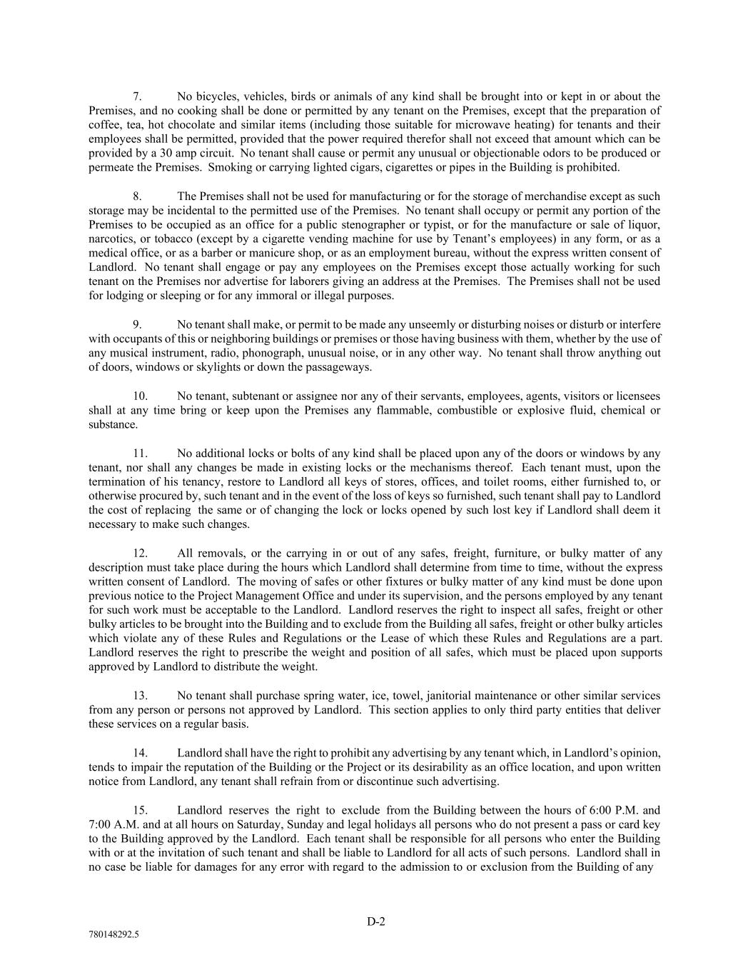 D-2 780148292.5 7. No bicycles, vehicles, birds or animals of any kind shall be brought into or kept in or about the Premises, and no cooking shall be done or permitted by any tenant on the Premises, except that the preparation of coffee, tea, hot chocolate and similar items (including those suitable for microwave heating) for tenants and their employees shall be permitted, provided that the power required therefor shall not exceed that amount which can be provided by a 30 amp circuit. No tenant shall cause or permit any unusual or objectionable odors to be produced or permeate the Premises. Smoking or carrying lighted cigars, cigarettes or pipes in the Building is prohibited. 8. The Premises shall not be used for manufacturing or for the storage of merchandise except as such storage may be incidental to the permitted use of the Premises. No tenant shall occupy or permit any portion of the Premises to be occupied as an office for a public stenographer or typist, or for the manufacture or sale of liquor, narcotics, or tobacco (except by a cigarette vending machine for use by Tenant’s employees) in any form, or as a medical office, or as a barber or manicure shop, or as an employment bureau, without the express written consent of Landlord. No tenant shall engage or pay any employees on the Premises except those actually working for such tenant on the Premises nor advertise for laborers giving an address at the Premises. The Premises shall not be used for lodging or sleeping or for any immoral or illegal purposes. 9. No tenant shall make, or permit to be made any unseemly or disturbing noises or disturb or interfere with occupants of this or neighboring buildings or premises or those having business with them, whether by the use of any musical instrument, radio, phonograph, unusual noise, or in any other way. No tenant shall throw anything out of doors, windows or skylights or down the passageways. 10. No tenant, subtenant or assignee nor any of their servants, employees, agents, visitors or licensees shall at any time bring or keep upon the Premises any flammable, combustible or explosive fluid, chemical or substance. 11. No additional locks or bolts of any kind shall be placed upon any of the doors or windows by any tenant, nor shall any changes be made in existing locks or the mechanisms thereof. Each tenant must, upon the termination of his tenancy, restore to Landlord all keys of stores, offices, and toilet rooms, either furnished to, or otherwise procured by, such tenant and in the event of the loss of keys so furnished, such tenant shall pay to Landlord the cost of replacing the same or of changing the lock or locks opened by such lost key if Landlord shall deem it necessary to make such changes. 12. All removals, or the carrying in or out of any safes, freight, furniture, or bulky matter of any description must take place during the hours which Landlord shall determine from time to time, without the express written consent of Landlord. The moving of safes or other fixtures or bulky matter of any kind must be done upon previous notice to the Project Management Office and under its supervision, and the persons employed by any tenant for such work must be acceptable to the Landlord. Landlord reserves the right to inspect all safes, freight or other bulky articles to be brought into the Building and to exclude from the Building all safes, freight or other bulky articles which violate any of these Rules and Regulations or the Lease of which these Rules and Regulations are a part. Landlord reserves the right to prescribe the weight and position of all safes, which must be placed upon supports approved by Landlord to distribute the weight. 13. No tenant shall purchase spring water, ice, towel, janitorial maintenance or other similar services from any person or persons not approved by Landlord. This section applies to only third party entities that deliver these services on a regular basis. 14. Landlord shall have the right to prohibit any advertising by any tenant which, in Landlord’s opinion, tends to impair the reputation of the Building or the Project or its desirability as an office location, and upon written notice from Landlord, any tenant shall refrain from or discontinue such advertising. 15. Landlord reserves the right to exclude from the Building between the hours of 6:00 P.M. and 7:00 A.M. and at all hours on Saturday, Sunday and legal holidays all persons who do not present a pass or card key to the Building approved by the Landlord. Each tenant shall be responsible for all persons who enter the Building with or at the invitation of such tenant and shall be liable to Landlord for all acts of such persons. Landlord shall in no case be liable for damages for any error with regard to the admission to or exclusion from the Building of any