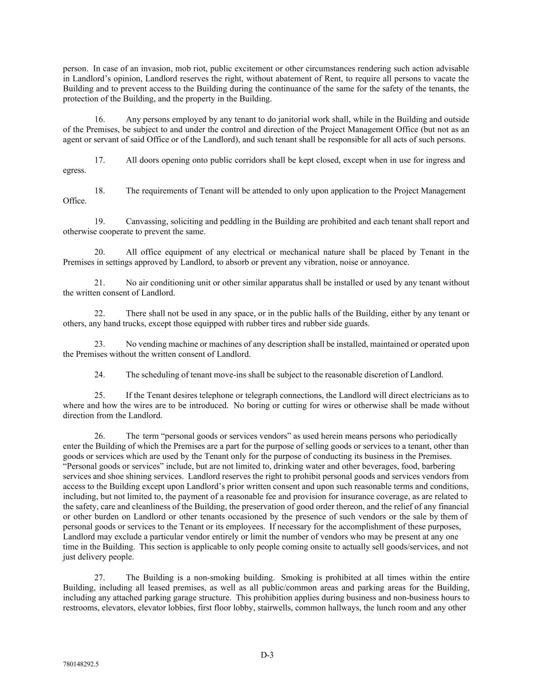 D-3 780148292.5 person. In case of an invasion, mob riot, public excitement or other circumstances rendering such action advisable in Landlord’s opinion, Landlord reserves the right, without abatement of Rent, to require all persons to vacate the Building and to prevent access to the Building during the continuance of the same for the safety of the tenants, the protection of the Building, and the property in the Building. 16. Any persons employed by any tenant to do janitorial work shall, while in the Building and outside of the Premises, be subject to and under the control and direction of the Project Management Office (but not as an agent or servant of said Office or of the Landlord), and such tenant shall be responsible for all acts of such persons. 17. All doors opening onto public corridors shall be kept closed, except when in use for ingress and egress. 18. The requirements of Tenant will be attended to only upon application to the Project Management Office. 19. Canvassing, soliciting and peddling in the Building are prohibited and each tenant shall report and otherwise cooperate to prevent the same. 20. All office equipment of any electrical or mechanical nature shall be placed by Tenant in the Premises in settings approved by Landlord, to absorb or prevent any vibration, noise or annoyance. 21. No air conditioning unit or other similar apparatus shall be installed or used by any tenant without the written consent of Landlord. 22. There shall not be used in any space, or in the public halls of the Building, either by any tenant or others, any hand trucks, except those equipped with rubber tires and rubber side guards. 23. No vending machine or machines of any description shall be installed, maintained or operated upon the Premises without the written consent of Landlord. 24. The scheduling of tenant move-ins shall be subject to the reasonable discretion of Landlord. 25. If the Tenant desires telephone or telegraph connections, the Landlord will direct electricians as to where and how the wires are to be introduced. No boring or cutting for wires or otherwise shall be made without direction from the Landlord. 26. The term “personal goods or services vendors” as used herein means persons who periodically enter the Building of which the Premises are a part for the purpose of selling goods or services to a tenant, other than goods or services which are used by the Tenant only for the purpose of conducting its business in the Premises. “Personal goods or services” include, but are not limited to, drinking water and other beverages, food, barbering services and shoe shining services. Landlord reserves the right to prohibit personal goods and services vendors from access to the Building except upon Landlord’s prior written consent and upon such reasonable terms and conditions, including, but not limited to, the payment of a reasonable fee and provision for insurance coverage, as are related to the safety, care and cleanliness of the Building, the preservation of good order thereon, and the relief of any financial or other burden on Landlord or other tenants occasioned by the presence of such vendors or the sale by them of personal goods or services to the Tenant or its employees. If necessary for the accomplishment of these purposes, Landlord may exclude a particular vendor entirely or limit the number of vendors who may be present at any one time in the Building. This section is applicable to only people coming onsite to actually sell goods/services, and not just delivery people. 27. The Building is a non-smoking building. Smoking is prohibited at all times within the entire Building, including all leased premises, as well as all public/common areas and parking areas for the Building, including any attached parking garage structure. This prohibition applies during business and non-business hours to restrooms, elevators, elevator lobbies, first floor lobby, stairwells, common hallways, the lunch room and any other