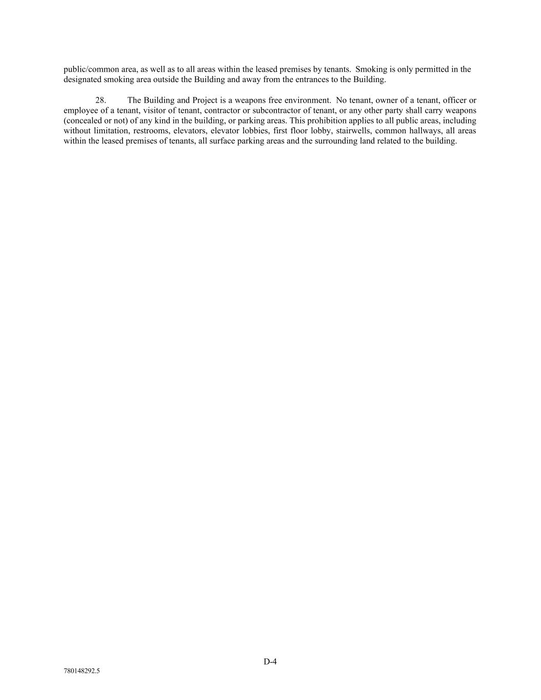 D-4 780148292.5 public/common area, as well as to all areas within the leased premises by tenants. Smoking is only permitted in the designated smoking area outside the Building and away from the entrances to the Building. 28. The Building and Project is a weapons free environment. No tenant, owner of a tenant, officer or employee of a tenant, visitor of tenant, contractor or subcontractor of tenant, or any other party shall carry weapons (concealed or not) of any kind in the building, or parking areas. This prohibition applies to all public areas, including without limitation, restrooms, elevators, elevator lobbies, first floor lobby, stairwells, common hallways, all areas within the leased premises of tenants, all surface parking areas and the surrounding land related to the building.