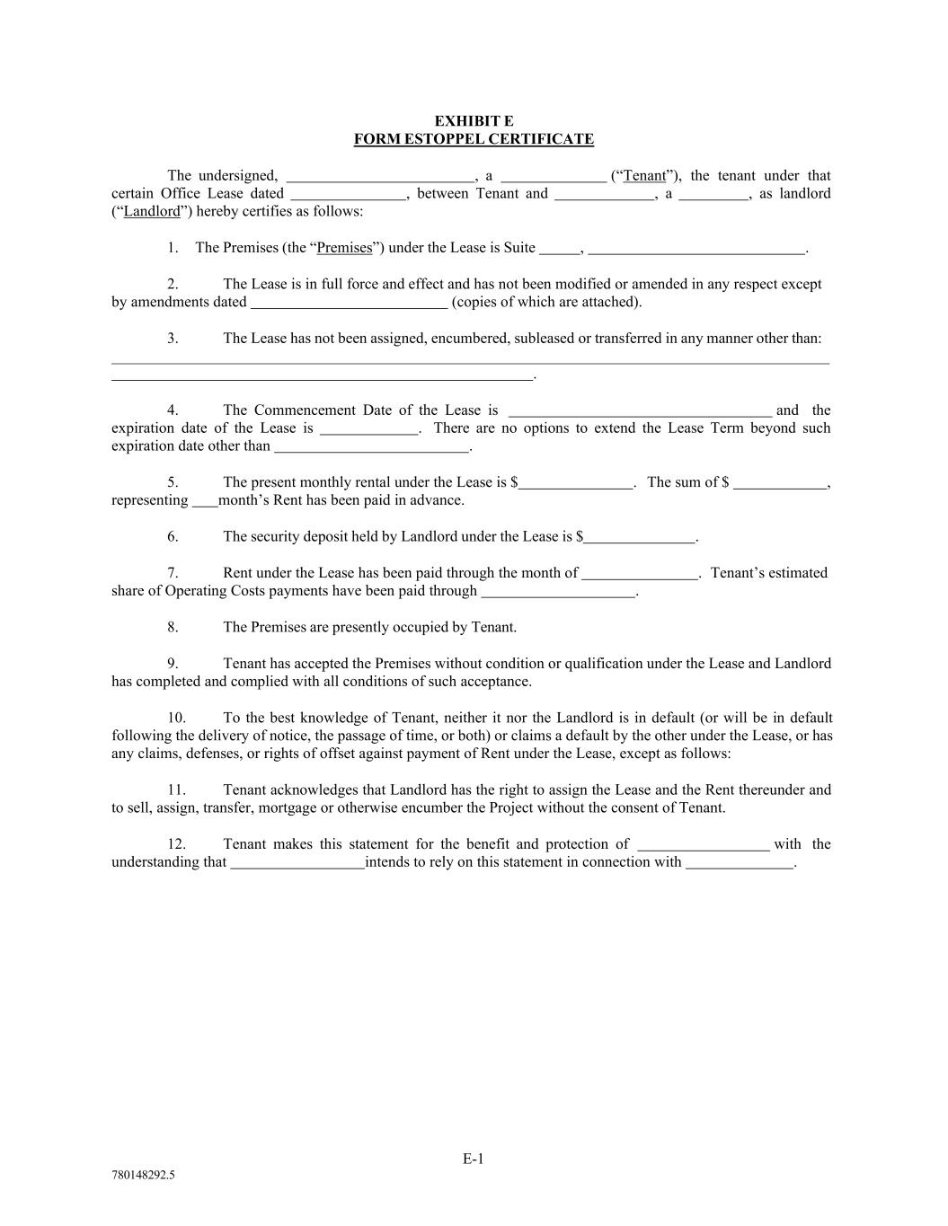 E-1 780148292.5 EXHIBIT E FORM ESTOPPEL CERTIFICATE The undersigned, , a (“Tenant”), the tenant under that certain Office Lease dated , between Tenant and , a , as landlord (“Landlord”) hereby certifies as follows: 1. The Premises (the “Premises”) under the Lease is Suite , . 2. The Lease is in full force and effect and has not been modified or amended in any respect except by amendments dated (copies of which are attached). 3. The Lease has not been assigned, encumbered, subleased or transferred in any manner other than: . 4. The Commencement Date of the Lease is and the expiration date of the Lease is . There are no options to extend the Lease Term beyond such expiration date other than . 5. The present monthly rental under the Lease is $ . The sum of $ , representing month’s Rent has been paid in advance. 6. The security deposit held by Landlord under the Lease is $ . 7. Rent under the Lease has been paid through the month of . Tenant’s estimated share of Operating Costs payments have been paid through . 8. The Premises are presently occupied by Tenant. 9. Tenant has accepted the Premises without condition or qualification under the Lease and Landlord has completed and complied with all conditions of such acceptance. 10. To the best knowledge of Tenant, neither it nor the Landlord is in default (or will be in default following the delivery of notice, the passage of time, or both) or claims a default by the other under the Lease, or has any claims, defenses, or rights of offset against payment of Rent under the Lease, except as follows: 11. Tenant acknowledges that Landlord has the right to assign the Lease and the Rent thereunder and to sell, assign, transfer, mortgage or otherwise encumber the Project without the consent of Tenant. 12. Tenant makes this statement for the benefit and protection of with the understanding that intends to rely on this statement in connection with .