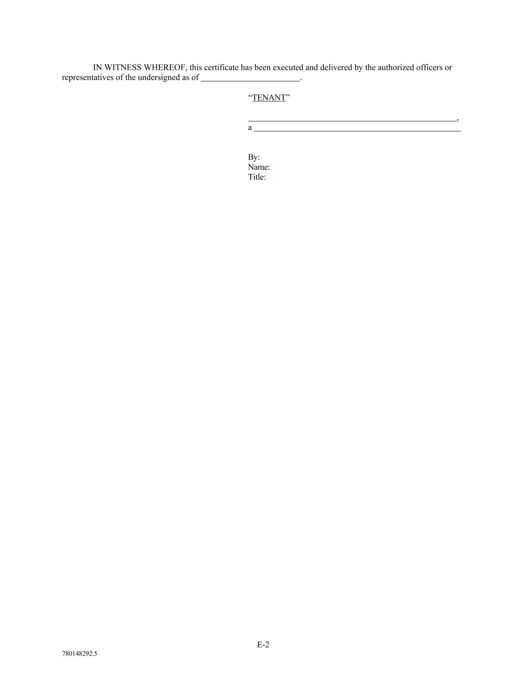 E-2 780148292.5 IN WITNESS WHEREOF, this certificate has been executed and delivered by the authorized officers or representatives of the undersigned as of . “TENANT” , a By: Name: Title: