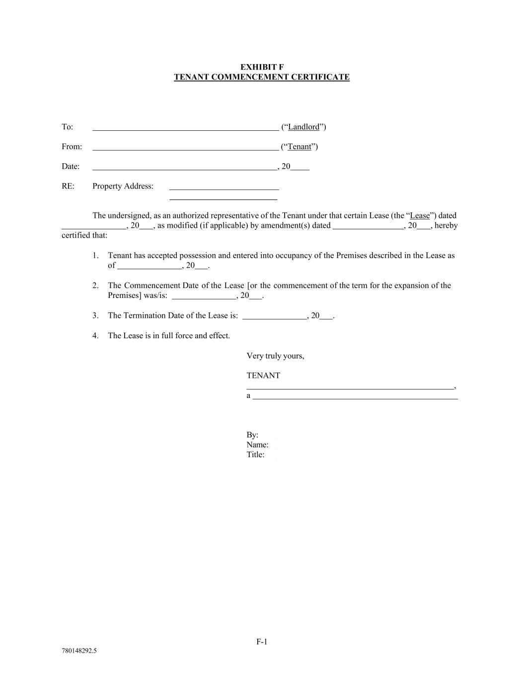 780148292.5 EXHIBIT F TENANT COMMENCEMENT CERTIFICATE To: (“Landlord”) From: (“Tenant”) Date: , 20 RE: Property Address: The undersigned, as an authorized representative of the Tenant under that certain Lease (the “Lease”) dated , 20 , as modified (if applicable) by amendment(s) dated , 20 , hereby certified that: 1. Tenant has accepted possession and entered into occupancy of the Premises described in the Lease as of , 20 . 2. The Commencement Date of the Lease [or the commencement of the term for the expansion of the Premises] was/is: , 20 . 3. The Termination Date of the Lease is: , 20 . 4. The Lease is in full force and effect. Very truly yours, TENANT , a By: Name: Title: F-1