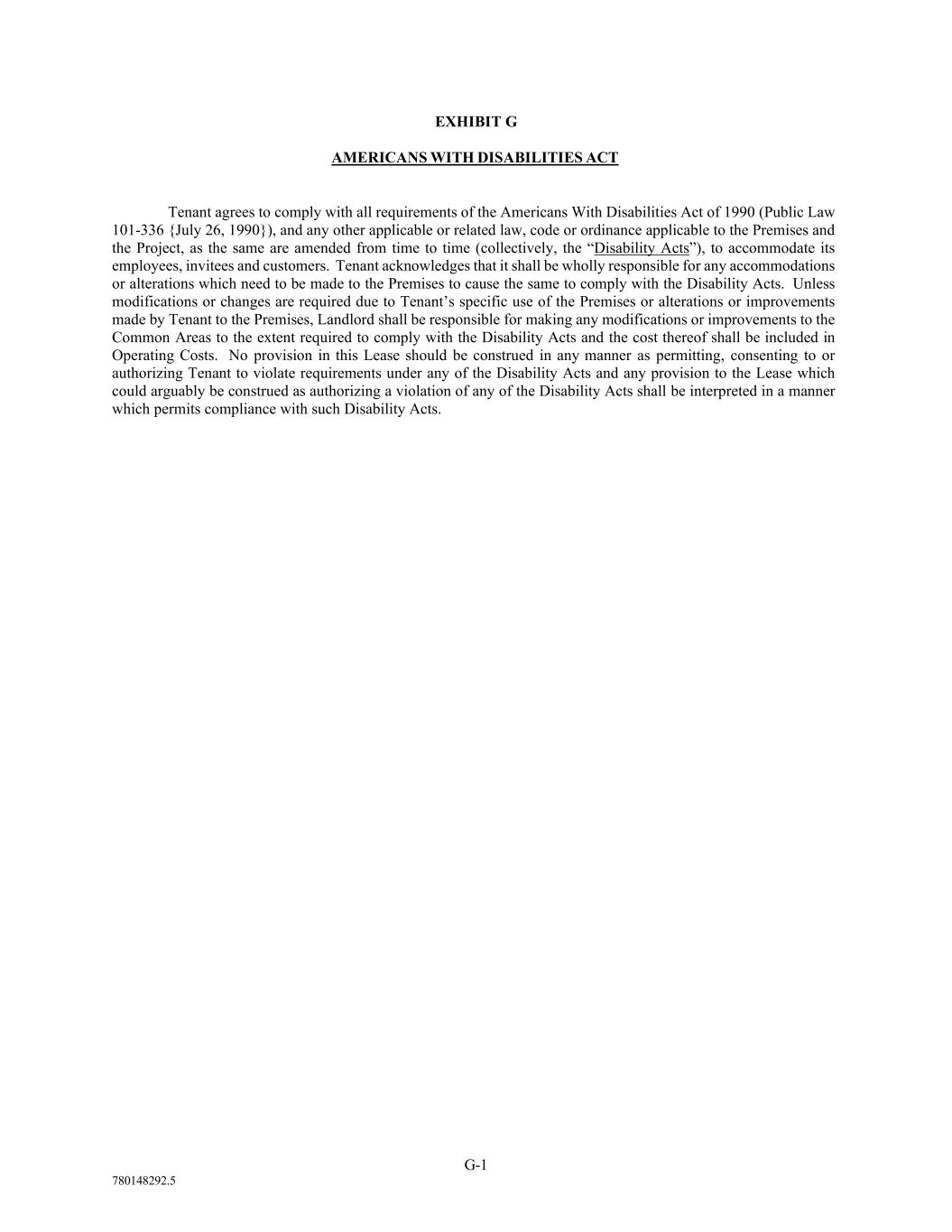 780148292.5 EXHIBIT G AMERICANS WITH DISABILITIES ACT Tenant agrees to comply with all requirements of the Americans With Disabilities Act of 1990 (Public Law 101-336 {July 26, 1990}), and any other applicable or related law, code or ordinance applicable to the Premises and the Project, as the same are amended from time to time (collectively, the “Disability Acts”), to accommodate its employees, invitees and customers. Tenant acknowledges that it shall be wholly responsible for any accommodations or alterations which need to be made to the Premises to cause the same to comply with the Disability Acts. Unless modifications or changes are required due to Tenant’s specific use of the Premises or alterations or improvements made by Tenant to the Premises, Landlord shall be responsible for making any modifications or improvements to the Common Areas to the extent required to comply with the Disability Acts and the cost thereof shall be included in Operating Costs. No provision in this Lease should be construed in any manner as permitting, consenting to or authorizing Tenant to violate requirements under any of the Disability Acts and any provision to the Lease which could arguably be construed as authorizing a violation of any of the Disability Acts shall be interpreted in a manner which permits compliance with such Disability Acts. G-1