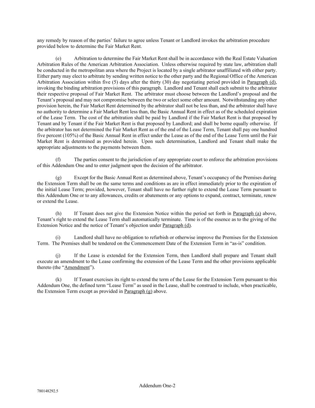 Addendum One-2 780148292.5 any remedy by reason of the parties’ failure to agree unless Tenant or Landlord invokes the arbitration procedure provided below to determine the Fair Market Rent. (e) Arbitration to determine the Fair Market Rent shall be in accordance with the Real Estate Valuation Arbitration Rules of the American Arbitration Association. Unless otherwise required by state law, arbitration shall be conducted in the metropolitan area where the Project is located by a single arbitrator unaffiliated with either party. Either party may elect to arbitrate by sending written notice to the other party and the Regional Office of the American Arbitration Association within five (5) days after the thirty (30) day negotiating period provided in Paragraph (d), invoking the binding arbitration provisions of this paragraph. Landlord and Tenant shall each submit to the arbitrator their respective proposal of Fair Market Rent. The arbitrator must choose between the Landlord’s proposal and the Tenant’s proposal and may not compromise between the two or select some other amount. Notwithstanding any other provision herein, the Fair Market Rent determined by the arbitrator shall not be less than, and the arbitrator shall have no authority to determine a Fair Market Rent less than, the Basic Annual Rent in effect as of the scheduled expiration of the Lease Term. The cost of the arbitration shall be paid by Landlord if the Fair Market Rent is that proposed by Tenant and by Tenant if the Fair Market Rent is that proposed by Landlord; and shall be borne equally otherwise. If the arbitrator has not determined the Fair Market Rent as of the end of the Lease Term, Tenant shall pay one hundred five percent (105%) of the Basic Annual Rent in effect under the Lease as of the end of the Lease Term until the Fair Market Rent is determined as provided herein. Upon such determination, Landlord and Tenant shall make the appropriate adjustments to the payments between them. (f) The parties consent to the jurisdiction of any appropriate court to enforce the arbitration provisions of this Addendum One and to enter judgment upon the decision of the arbitrator. (g) Except for the Basic Annual Rent as determined above, Tenant’s occupancy of the Premises during the Extension Term shall be on the same terms and conditions as are in effect immediately prior to the expiration of the initial Lease Term; provided, however, Tenant shall have no further right to extend the Lease Term pursuant to this Addendum One or to any allowances, credits or abatements or any options to expand, contract, terminate, renew or extend the Lease. (h) If Tenant does not give the Extension Notice within the period set forth in Paragraph (a) above, Tenant’s right to extend the Lease Term shall automatically terminate. Time is of the essence as to the giving of the Extension Notice and the notice of Tenant’s objection under Paragraph (d). (i) Landlord shall have no obligation to refurbish or otherwise improve the Premises for the Extension Term. The Premises shall be tendered on the Commencement Date of the Extension Term in “as-is” condition. (j) If the Lease is extended for the Extension Term, then Landlord shall prepare and Tenant shall execute an amendment to the Lease confirming the extension of the Lease Term and the other provisions applicable thereto (the “Amendment”). (k) If Tenant exercises its right to extend the term of the Lease for the Extension Term pursuant to this Addendum One, the defined term “Lease Term” as used in the Lease, shall be construed to include, when practicable, the Extension Term except as provided in Paragraph (g) above.