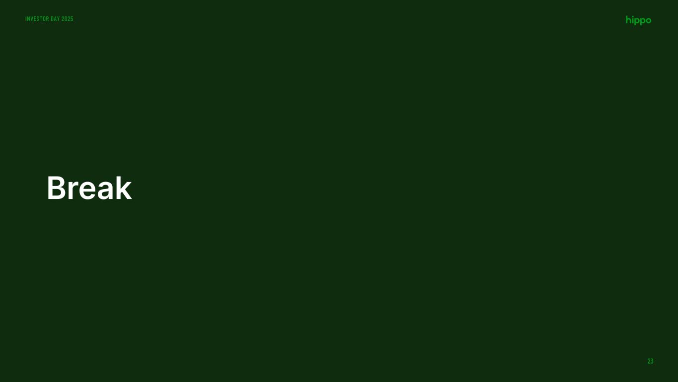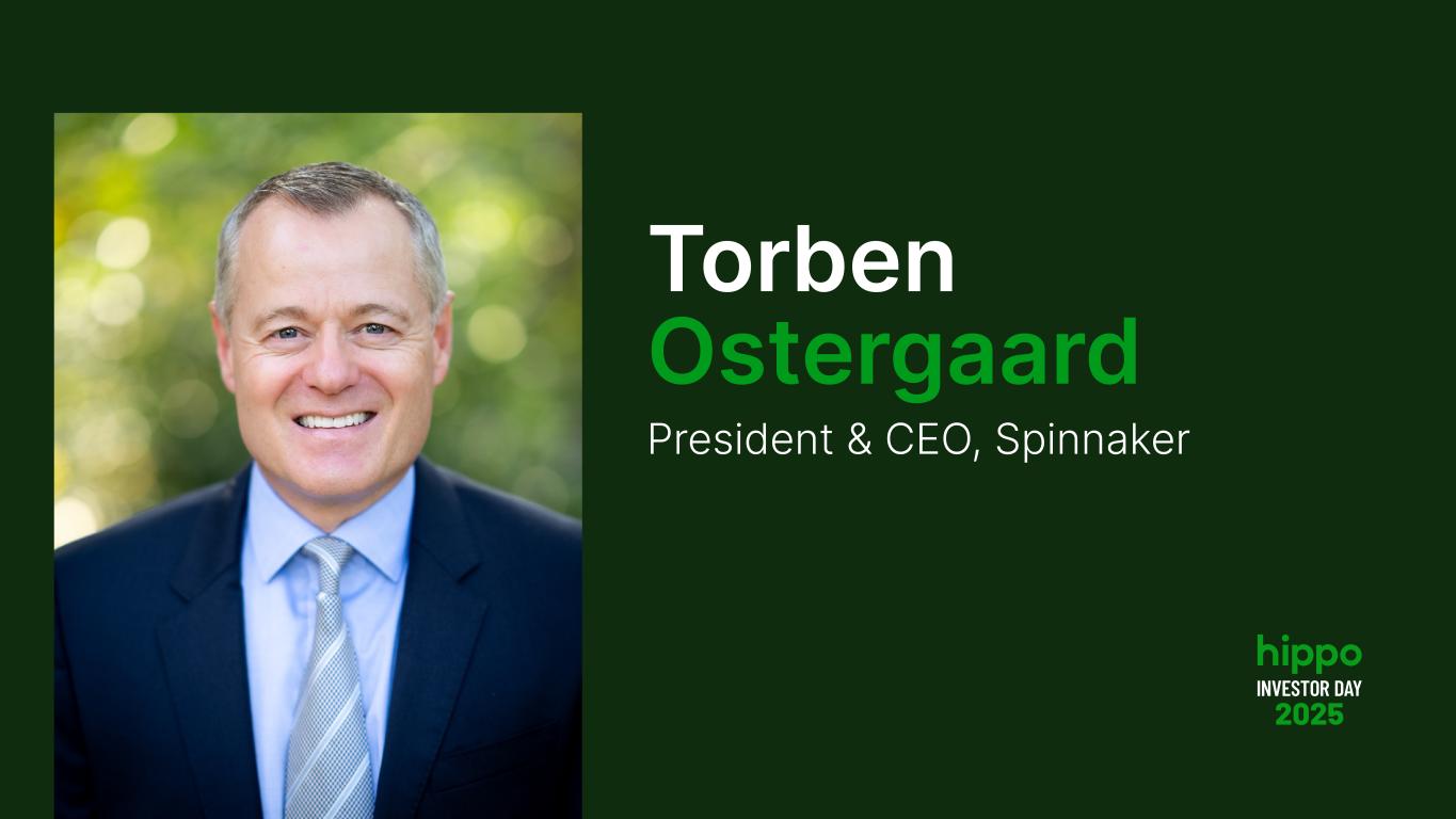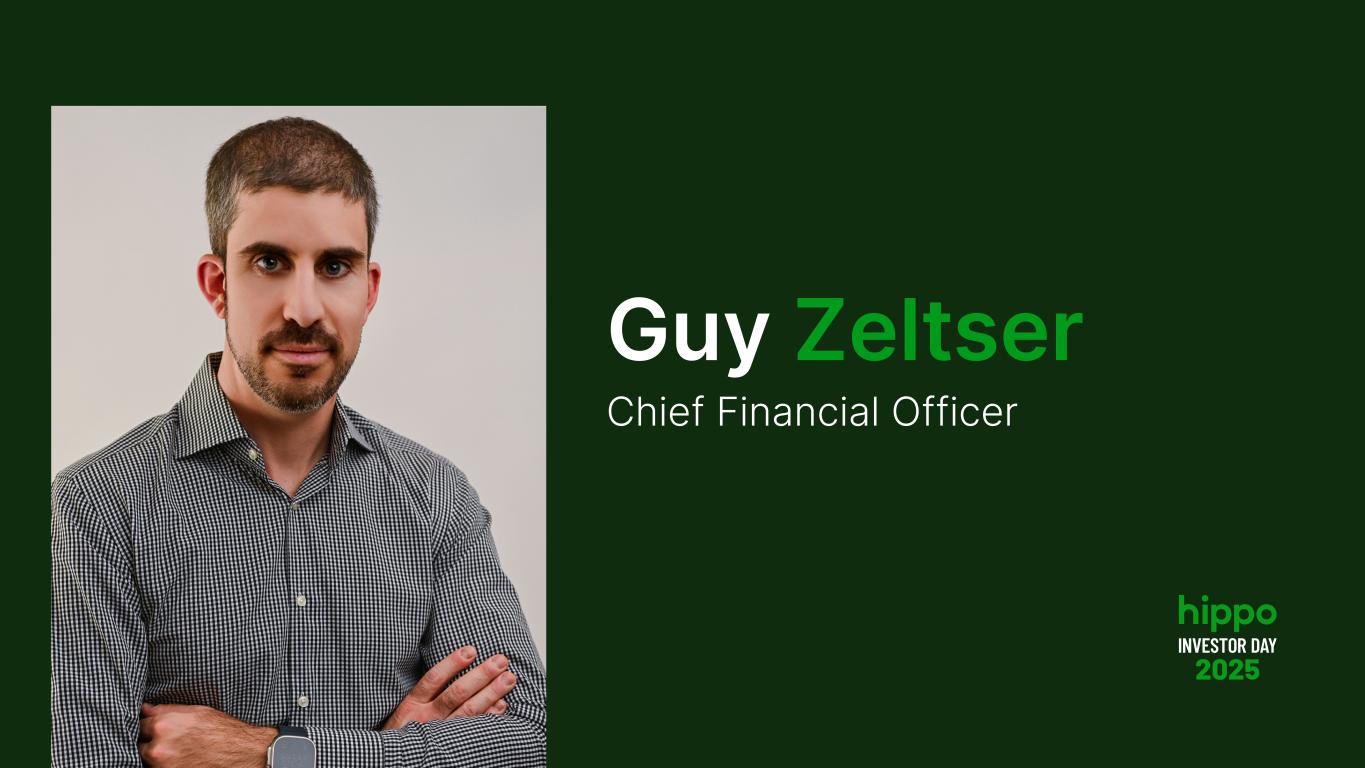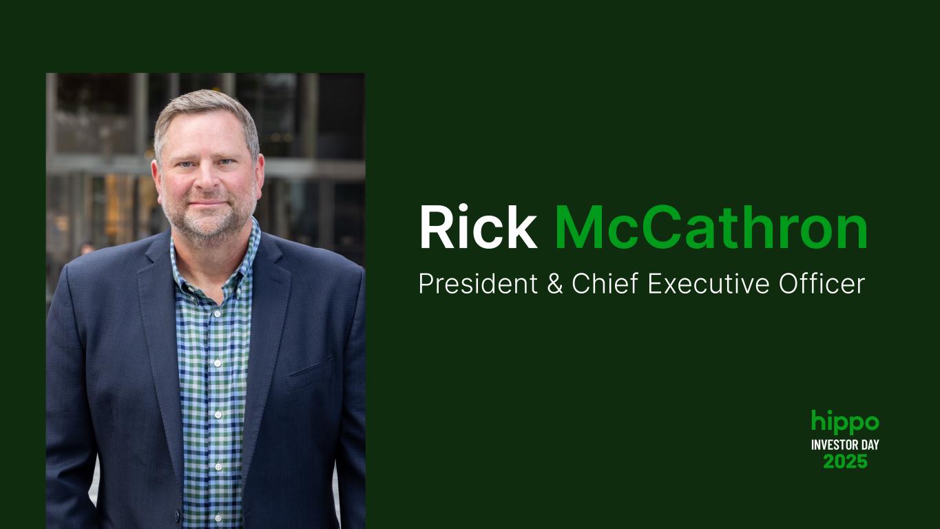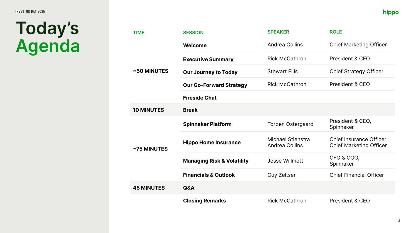 Disclaimer INVESTOR DAY 2025 2 This presentation includes the non-GAAP financial measure (including on a forward-looking basis) Adjusted EBITDA. Hippo defines Adjusted EBITDA, a non-GAAP financial measure, as net loss attributable to Hippo excluding interest expense, income tax expense, depreciation, amortization, stock-based compensation, net investment income, restructuring charges, impairment expense, gains and losses on sales of business, other non-cash fair market value adjustments, and contingent consideration for one of our acquisitions and other transactions that we consider to be unique in nature. Hippo excludes these items from Adjusted EBITDA because it does not consider them to be directly attributable to its underlying operating performance. This non-GAAP measure is an addition, and not a substitute for, or superior to, measures of financial performance prepared in accordance with GAAP and should not be considered as an alternative to net income, operating income or any other performance measures derived in accordance with GAAP. Reconciliations of non-GAAP measures to their most directly comparable GAAP counterparts are included in the Appendix to this presentation. Hippo believes that these non-GAAP measures of financial results (including on a forward-looking basis) provide useful supplemental information to investors about Hippo. Hippo’s management uses forward looking non- GAAP measures to evaluate Hippo’s projected financial and operating performance. However, there are a number of limitations related to the use of these non-GAAP measures and their nearest GAAP equivalents. For example, other companies may calculate non-GAAP measures differently, or may use other measures to calculate their financial performance, and therefore Hippo’s non-GAAP measures may not be directly comparable to similarly titled measures of other companies. This presentation also includes certain projections of non-GAAP financial measures. Due to the high variability and difficulty in making accurate forecasts and projections of some of the information excluded from these projected measures, together with some of the excluded information not being ascertainable or accessible, Hippo is unable to quantify certain amounts that would be required to be included in the most directly comparable GAAP financial measures without unreasonable effort. Consequently, no disclosure of estimated comparable GAAP measures is included, and no reconciliation of the forward-looking non-GAAP financial measures is included. This presentation also includes key operating and financial metrics including Gross Loss Ratio and Net Loss Ratio. We define Gross Loss Ratio expressed as a percentage, which is the ratio of the gross losses and loss adjustment expenses to the gross earned premium. We define Net Loss Ratio expressed as a percentage, which is the ratio of the net losses and loss adjustment expenses to the net earned premium. Non-GAAP Financial Measures Certain statements included in this presentation that are not historical facts are forward-looking statements for purposes of the safe harbor provisions under the United States Private Securities Litigation Reform Act of 1995. Forward-looking statements generally are accompanied by words such as “believe,” “may,” “will,” “estimate,” “continue,” “anticipate,” “intend,” “expect,” “should,” “would,” “plan,” “predict,” “potential,” “seem,” “seek,” “future,” “outlook,” and similar expressions that predict or indicate future events or trends or that are not statements of historical matters. These forward-looking statements include, but are not limited to, statements regarding estimates and forecasts of financial results and other operating and performance metrics, our business strategy, our cost reduction efforts, the quality of our products and services, and the potential growth of our business, including our ability and timing to achieve profitability. These statements are based on the current expectations of Hippo’s management and are not predictions of actual performance. Actual events and circumstances are difficult or impossible to predict and will differ from assumptions, and many actual events and circumstances are beyond the control of Hippo. These forward-looking statements are subject to a number of risks and uncertainties, including our ability to achieve or maintain profitability in the future; our ability to retain and expand our customer base and grow our business, including our builder network; our ability to manage growth effectively; risks relating to Hippo’s brand and brand reputation; denial of claims or our failure to accurately and timely pay claims; the effects of intense competition in the segments of the insurance industry in which we operate; the availability and adequacy of reinsurance, including at current coverage, limits or pricing; our ability to underwrite risks accurately and charge competitive yet profitable rates to our customers, and the sufficiency of the analytical models we use to assess and predict exposure to catastrophe losses; risks related to our proprietary technology and our digital platform; outages or interruptions or delays in services provided by our third party providers, including our data vendor; risks related to our intellectual property; the seasonal and cyclical nature of our business; the effects of severe weather events and other natural or man-made catastrophes, including the effects of climate change, global pandemics, and terrorism; any overall decline in economic activity; the effects of existing or new legal or regulatory requirements on our business, including with respect to maintenance of risk-based capital and financial strength ratings, data privacy and cybersecurity, and the insurance industry generally; and other risks set forth in the sections entitled “Risk Factors” in our Annual Report on Form 10-K and Quarterly Reports on
