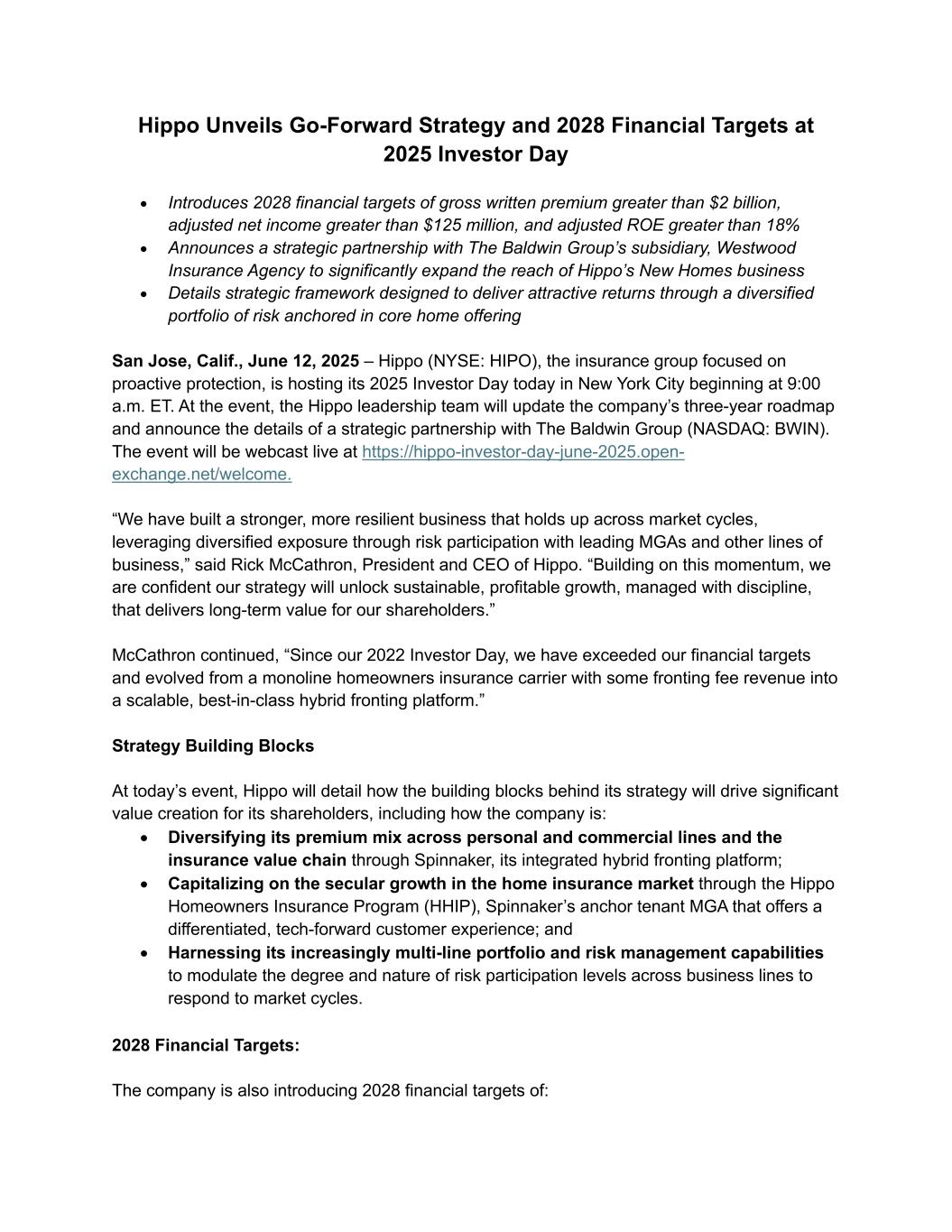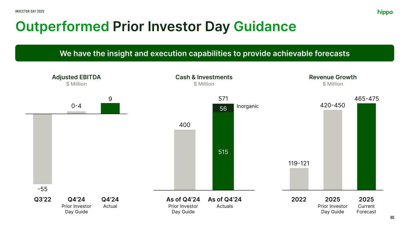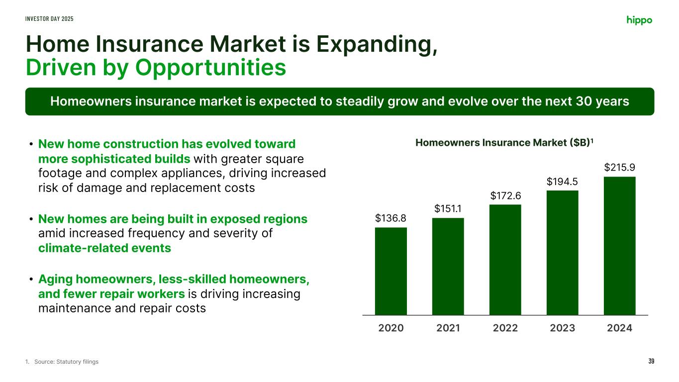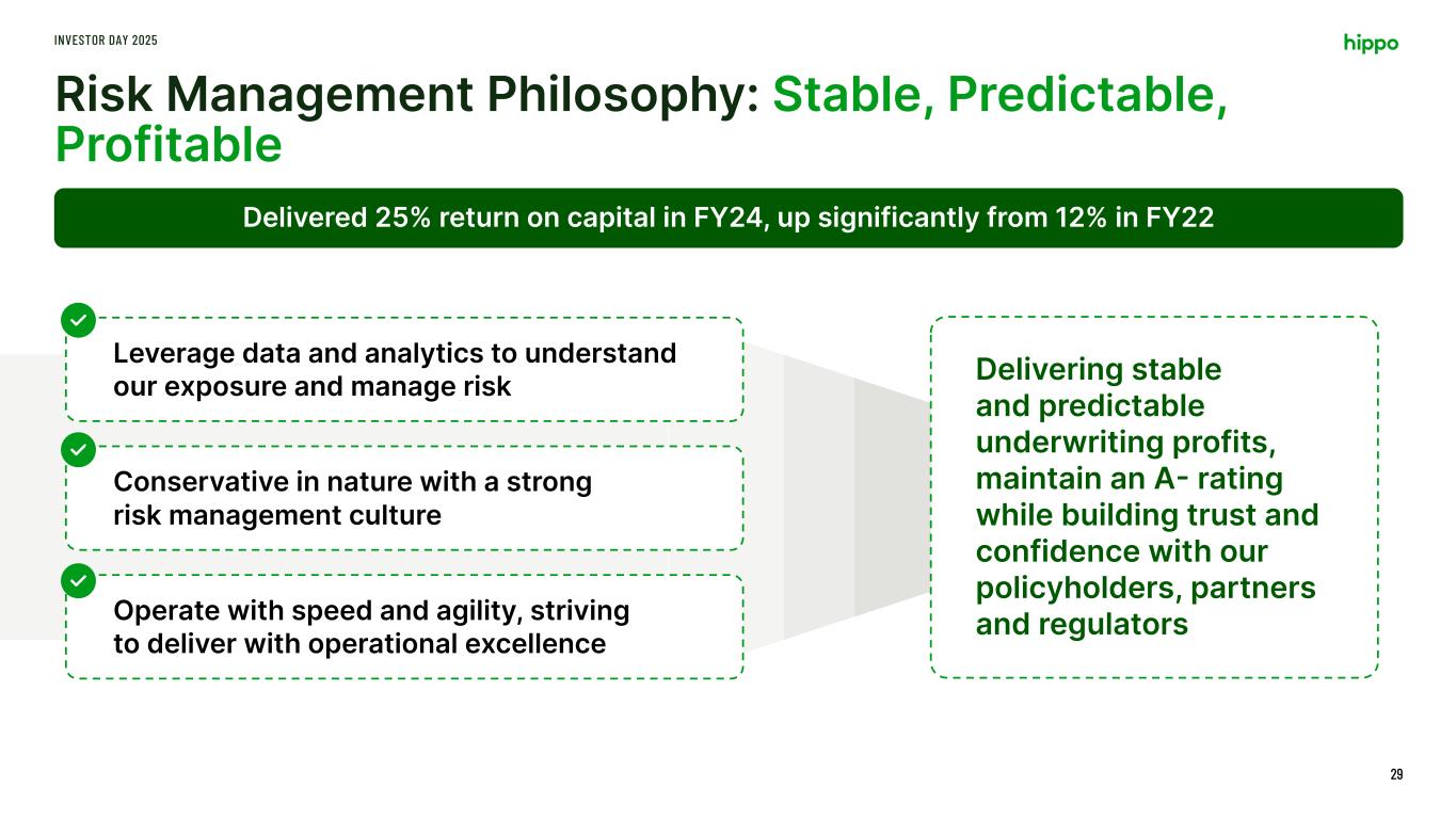 Disclaimer INVESTOR DAY 2025 2 This presentation includes the non-GAAP financial measure (including on a forward-looking basis) Adjusted EBITDA. Hippo defines Adjusted EBITDA, a non-GAAP financial measure, as net loss attributable to Hippo excluding interest expense, income tax expense, depreciation, amortization, stock-based compensation, net investment income, restructuring charges, impairment expense, gains and losses on sales of business, other non-cash fair market value adjustments, and contingent consideration for one of our acquisitions and other transactions that we consider to be unique in nature. Hippo excludes these items from Adjusted EBITDA because it does not consider them to be directly attributable to its underlying operating performance. This non-GAAP measure is an addition, and not a substitute for, or superior to, measures of financial performance prepared in accordance with GAAP and should not be considered as an alternative to net income, operating income or any other performance measures derived in accordance with GAAP. Reconciliations of non-GAAP measures to their most directly comparable GAAP counterparts are included in the Appendix to this presentation. Hippo believes that these non-GAAP measures of financial results (including on a forward-looking basis) provide useful supplemental information to investors about Hippo. Hippo’s management uses forward looking non- GAAP measures to evaluate Hippo’s projected financial and operating performance. However, there are a number of limitations related to the use of these non-GAAP measures and their nearest GAAP equivalents. For example, other companies may calculate non-GAAP measures differently, or may use other measures to calculate their financial performance, and therefore Hippo’s non-GAAP measures may not be directly comparable to similarly titled measures of other companies. This presentation also includes certain projections of non-GAAP financial measures. Due to the high variability and difficulty in making accurate forecasts and projections of some of the information excluded from these projected measures, together with some of the excluded information not being ascertainable or accessible, Hippo is unable to quantify certain amounts that would be required to be included in the most directly comparable GAAP financial measures without unreasonable effort. Consequently, no disclosure of estimated comparable GAAP measures is included, and no reconciliation of the forward-looking non-GAAP financial measures is included. This presentation also includes key operating and financial metrics including Gross Loss Ratio and Net Loss Ratio. We define Gross Loss Ratio expressed as a percentage, which is the ratio of the gross losses and loss adjustment expenses to the gross earned premium. We define Net Loss Ratio expressed as a percentage, which is the ratio of the net losses and loss adjustment expenses to the net earned premium. Non-GAAP Financial Measures Certain statements included in this presentation that are not historical facts are forward-looking statements for purposes of the safe harbor provisions under the United States Private Securities Litigation Reform Act of 1995. Forward-looking statements generally are accompanied by words such as “believe,” “may,” “will,” “estimate,” “continue,” “anticipate,” “intend,” “expect,” “should,” “would,” “plan,” “predict,” “potential,” “seem,” “seek,” “future,” “outlook,” and similar expressions that predict or indicate future events or trends or that are not statements of historical matters. These forward-looking statements include, but are not limited to, statements regarding estimates and forecasts of financial results and other operating and performance metrics, our business strategy, our cost reduction efforts, the quality of our products and services, and the potential growth of our business, including our ability and timing to achieve profitability. These statements are based on the current expectations of Hippo’s management and are not predictions of actual performance. Actual events and circumstances are difficult or impossible to predict and will differ from assumptions, and many actual events and circumstances are beyond the control of Hippo. These forward-looking statements are subject to a number of risks and uncertainties, including our ability to achieve or maintain profitability in the future; our ability to retain and expand our customer base and grow our business, including our builder network; our ability to manage growth effectively; risks relating to Hippo’s brand and brand reputation; denial of claims or our failure to accurately and timely pay claims; the effects of intense competition in the segments of the insurance industry in which we operate; the availability and adequacy of reinsurance, including at current coverage, limits or pricing; our ability to underwrite risks accurately and charge competitive yet profitable rates to our customers, and the sufficiency of the analytical models we use to assess and predict exposure to catastrophe losses; risks related to our proprietary technology and our digital platform; outages or interruptions or delays in services provided by our third party providers, including our data vendor; risks related to our intellectual property; the seasonal and cyclical nature of our business; the effects of severe weather events and other natural or man-made catastrophes, including the effects of climate change, global pandemics, and terrorism; any overall decline in economic activity; the effects of existing or new legal or regulatory requirements on our business, including with respect to maintenance of risk-based capital and financial strength ratings, data privacy and cybersecurity, and the insurance industry generally; and other risks set forth in the sections entitled “Risk Factors” in our Annual Report on Form 10-K and Quarterly Reports on