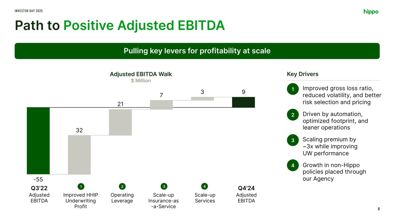 Track Record of Execution INVESTOR DAY 2025 7 Since our last investor day in 2022, Hippo has exceeded its aggressive financial goals 2022 2025 2025 Prior Investor Day Guide Current Forecast 119-121 420-450 465-475 Revenue $ Million -55 9 Q3’22 Q4’24 Q4’24 Prior Investor Day Guide Actual 0-4 Adjusted EBITDA $ Million 400 515 56 As of Q4’24 As of Q4’24 Prior Investor Day Guide Actuals Inorganic 571 Cash & Investments $ Million