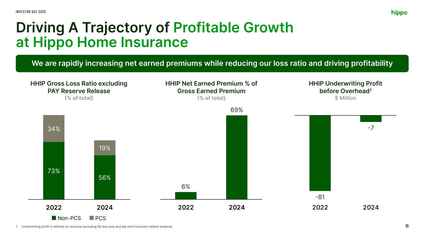 9% 5% 1% 12% 53% 21% 99% 2022 2024 Rates and Terms 173 rate filings since 2022 82% cumulative rate increase achieved Improved policy terms and conditions Performance Drivers: Hippo Home Insurance INVESTOR DAY 2025 9 Added the right new business, re-underwrote existing portfolio and substantially improved rates and policy terms 151 118 7 13 86 87 123 61 2022 2024 OnlineAgent Partner Producer Builder All Other FL CA TX HHIP New Business Mix Business Mix (% of total) HHIP Geographic Footprint Premiums by State ($ Million)