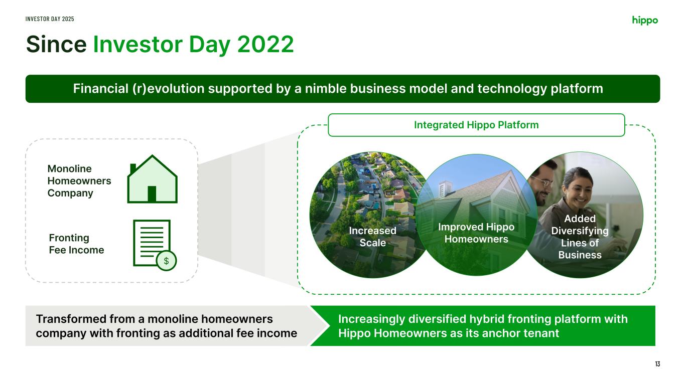 Performance Drivers: Hybrid Fronting INVESTOR DAY 2025 12 Diversifying the portfolio while delivering underwriting profit 3rd Party Homeowners 19% Renters 17% Casualty 15% Other Personal Lines 2% Commercial Property 17% Hippo HHIP 30% Gross Written Premium Mix – 2022 Gross Written Premium Mix – 2024 3rd Party Homeowners 14% Renters 15% Casualty 10% Other Personal Lines 1% Commercial Property 5% Hippo HHIP 55%