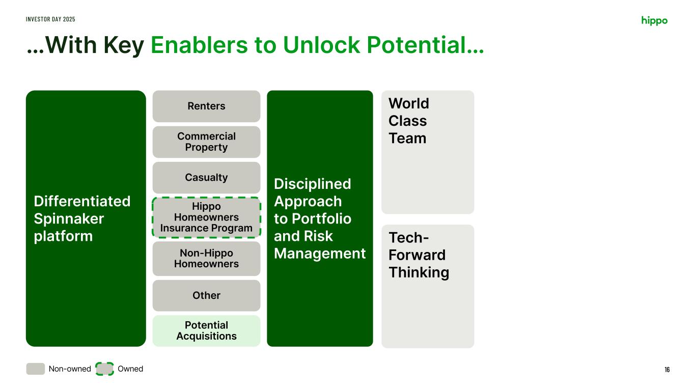 Founding Blocks for Success… INVESTOR DAY 2025 15 Differentiated Spinnaker platform Hippo Homeowners Insurance Program Renters Commercial Property Casualty Non-Hippo Homeowners Other Potential Acquisitions OwnedNon-owned