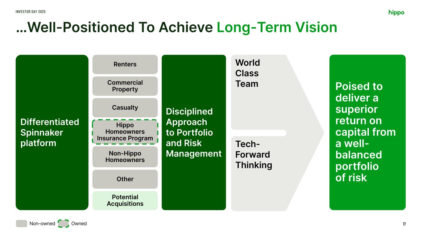 …With Key Enablers to Unlock Potential… INVESTOR DAY 2025 16 Differentiated Spinnaker platform Disciplined Approach to Portfolio and Risk Management Hippo Homeowners Insurance Program Renters Commercial Property Casualty Non-Hippo Homeowners Other Potential Acquisitions World Class Team Tech- Forward Thinking OwnedNon-owned
