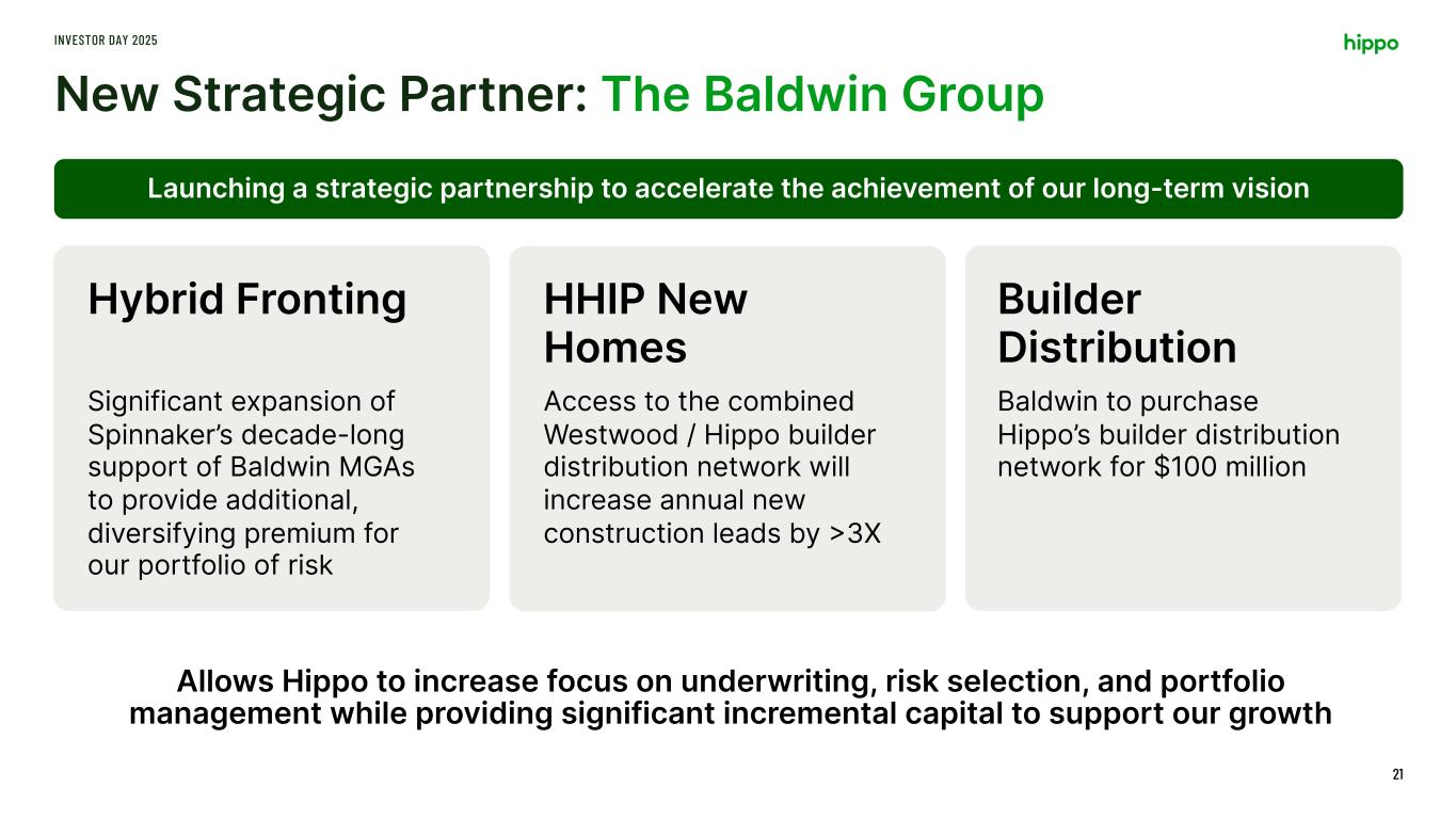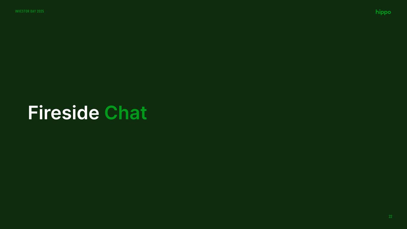 New Strategic Partner: The Baldwin Group INVESTOR DAY 2025 21 Launching a strategic partnership to accelerate the achievement of our long-term vision Hybrid Fronting Significant expansion of Spinnaker’s decade-long support of Baldwin MGAs to provide additional, diversifying premium for our portfolio of risk HHIP New Homes Access to the combined Westwood / Hippo builder distribution network will increase annual new construction leads by >3X Builder Distribution Baldwin to purchase Hippo’s builder distribution network for $100 million Allows Hippo to increase focus on underwriting, risk selection, and portfolio management while providing significant incremental capital to support our growth