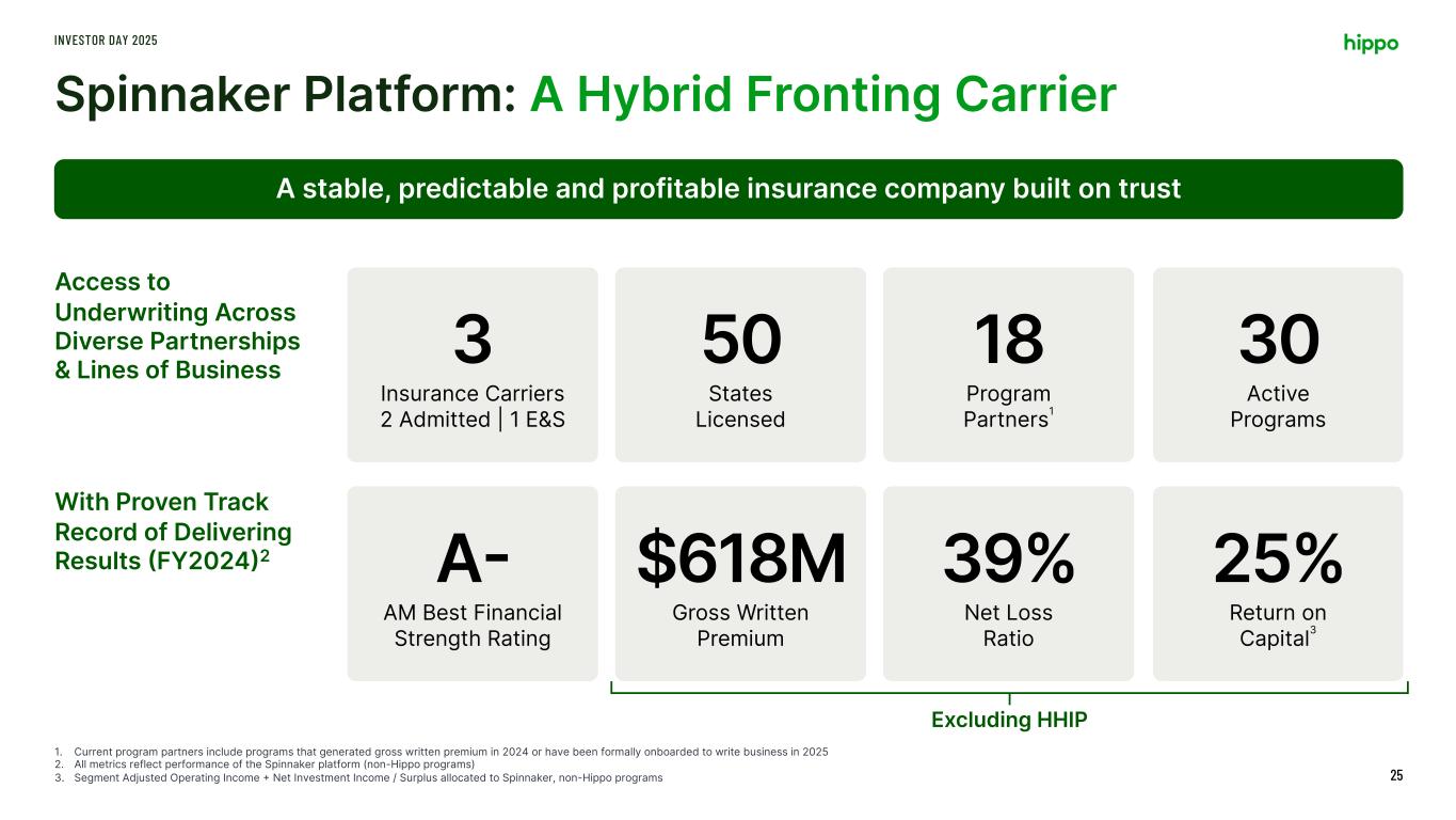 Spinnaker Platform: A Hybrid Fronting Carrier Access to Underwriting Across Diverse Partnerships & Lines of Business INVESTOR DAY 2025 37 A stable, predictable and profitable insurance company built on trust 3 Insurance Carriers 2 Admitted | 1 E&S 50 States Licensed 30 Active Programs A- AM Best Financial Strength Rating $618M Gross Written Premium 39% Net Loss Ratio With Proven Track Record of Delivering Results (FY2024)2 Excluding HHIP 1. Current program partners include programs that generated gross written premium in 2024 or have been formally onboarded to write business in 2025 2. All metrics reflect performance of the Spinnaker platform (non-Hippo programs) 3. Segment Adjusted Operating Income + Net Investment Income / Surplus allocated to Spinnaker, non-Hippo programs 18 Program Partners1 25% Return on Capital3