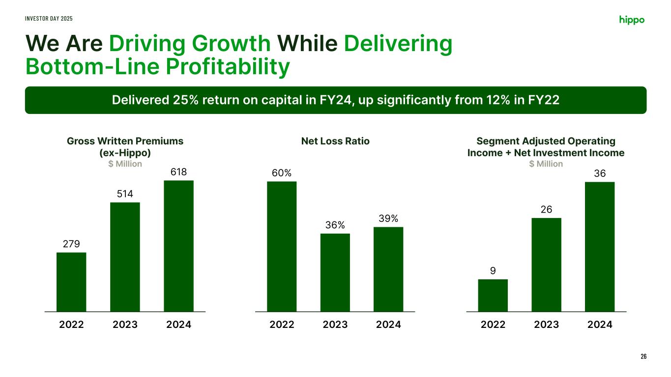 Spinnaker Platform: A Hybrid Fronting Carrier Access to Underwriting Across Diverse Partnerships & Lines of Business INVESTOR DAY 2025 25 A stable, predictable and profitable insurance company built on trust 3 Insurance Carriers 2 Admitted | 1 E&S 50 States Licensed 30 Active Programs A- AM Best Financial Strength Rating $618M Gross Written Premium 39% Net Loss Ratio With Proven Track Record of Delivering Results (FY2024)2 Excluding HHIP 1. Current program partners include programs that generated gross written premium in 2024 or have been formally onboarded to write business in 2025 2. All metrics reflect performance of the Spinnaker platform (non-Hippo programs) 3. Segment Adjusted Operating Income + Net Investment Income / Surplus allocated to Spinnaker, non-Hippo programs 18 Program Partners1 25% Return on Capital3