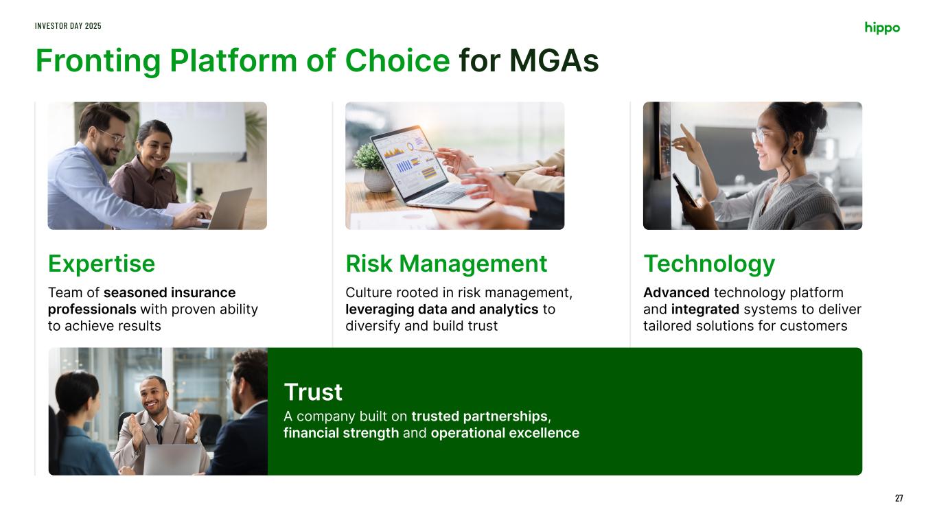We Are Driving Growth While Delivering Bottom-Line Profitability INVESTOR DAY 2025 26 Delivered 25% return on capital in FY24, up significantly from 12% in FY22 279 514 618 2022 2023 2024 60% 36% 39% 2022 2023 2024 9 26 36 2022 2023 2024 Gross Written Premiums (ex-Hippo) $ Million Net Loss Ratio Segment Adjusted Operating Income + Net Investment Income $ Million