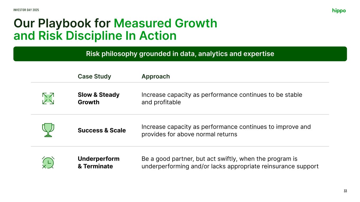 …To Deliver Results and Build Confidence and Trust INVESTOR DAY 2025 32 Proven ability to dial up or down risk based on market cycles and aligned with the long-term vision of our partners With a strong culture of risk management, we have safely increased risk retention while driving profitability… …Resulting in long-term, trusted relationships with high quality MGA partners PARTNER LOBS TENURE MSI Homeowners & Renters 10 Years Simply Business Comm’l GL 6 Years Coterie Comm’l GL 4 Years 10% 10% 12% 7% 8% 9% 10% 11% 12% 13% 0 100 200 300 400 500 600 700 2022 2023 2024 GWP Net Retention