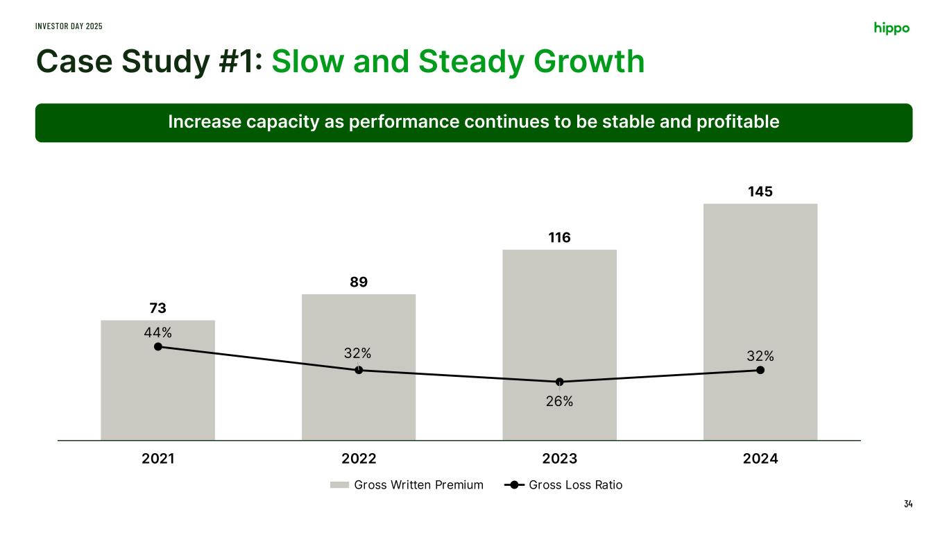 Our Playbook for Measured Growth and Risk Discipline In Action INVESTOR DAY 2025 33 Case Study Approach Slow & Steady Growth Increase capacity as performance continues to be stable and profitable Success & Scale Increase capacity as performance continues to improve and provides for above normal returns Underperform & Terminate Be a good partner, but act swiftly, when the program is underperforming and/or lacks appropriate reinsurance support Risk philosophy grounded in data, analytics and expertise