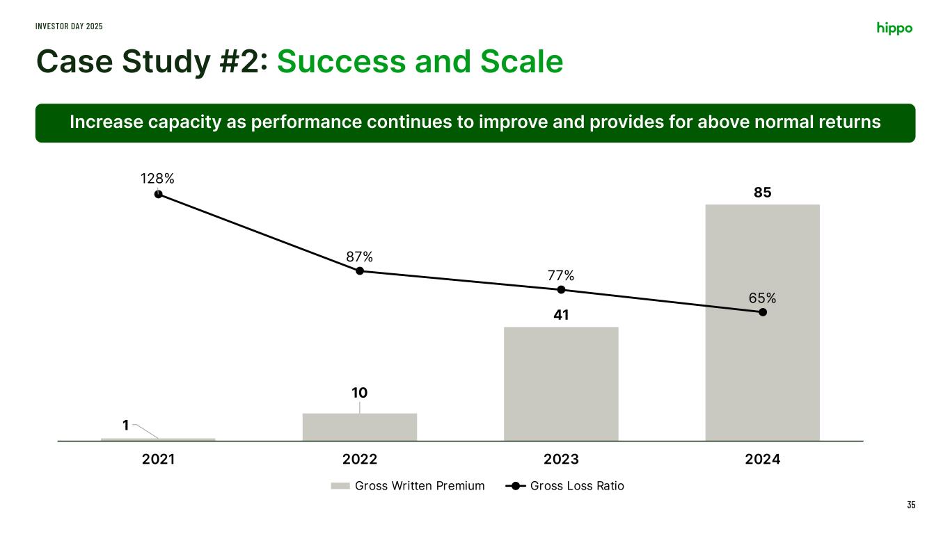 73 89 116 145 44% 32% 26% 32% -4% 16% 36% 56% 76% 96% 116% 0 20 40 60 80 100 120 140 160 2021 2022 2023 2024 Gross Written Premium Gross Loss Ratio Case Study #1: Slow and Steady Growth INVESTOR DAY 2025 34 Increase capacity as performance continues to be stable and profitable